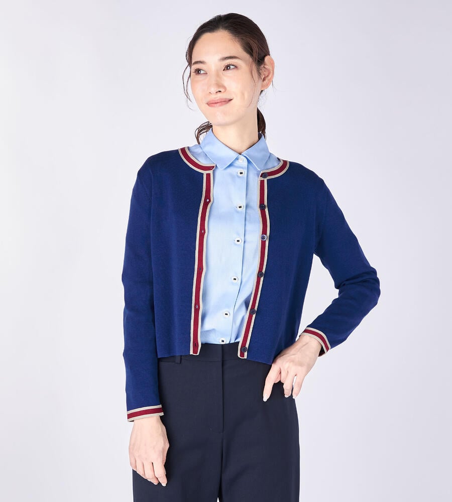 赤と白のライン使いがアクセントのトリムニットカーディガン。着こなしにさりげないアクセントを与えてくれるスタイリッシュなデザイン。コンパクトなサイジングで上半身がすっきりとまとまり、様々なボトムと好相性でバランスよく着こなせます。コーディネートをエレガントなムードにスタイルアップしてくれるアイテムです。