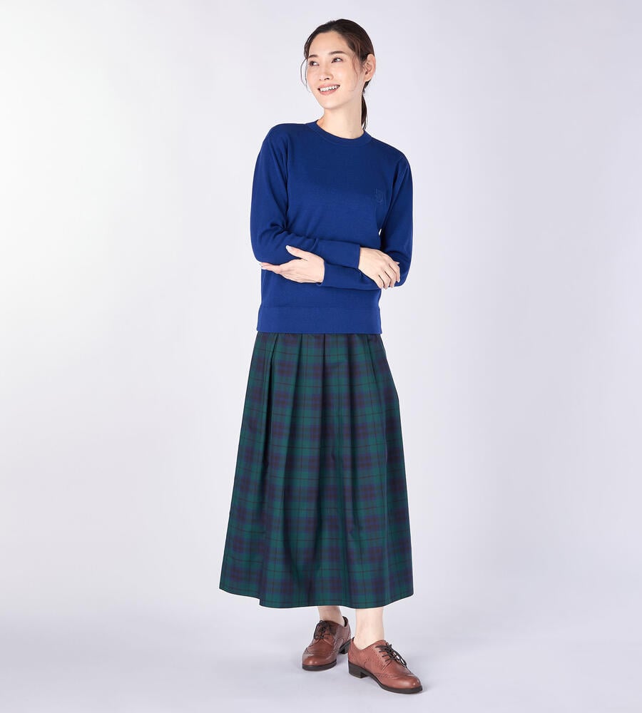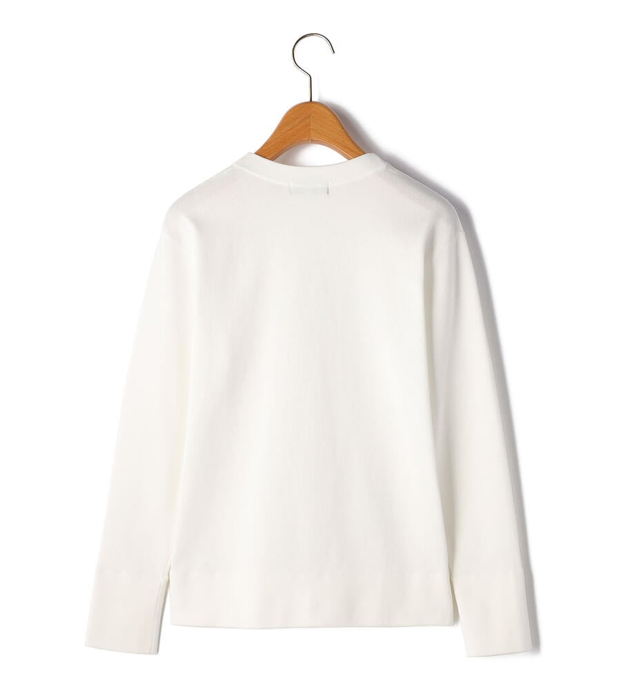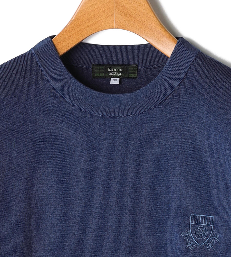 トリムクルーネック長袖ニット。左胸にあしらわれたブランドロゴエンブレムの刺繍がさりげなくおしゃれなデザインアクセント。長めに取った袖口と裾のリブ編みがシルエットのアクセント。トレンドに左右されない、シンプルかつスタンダードなデザインで様々なボトムとマッチし、長く愛用できるアイテムです。