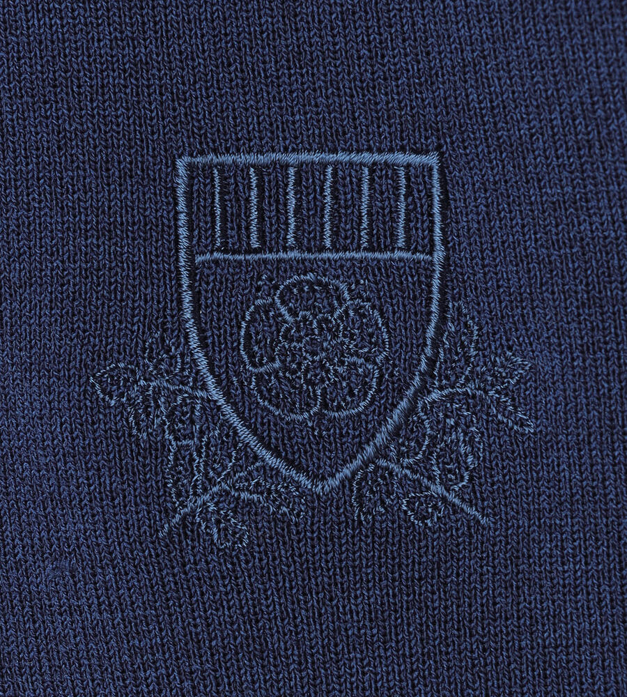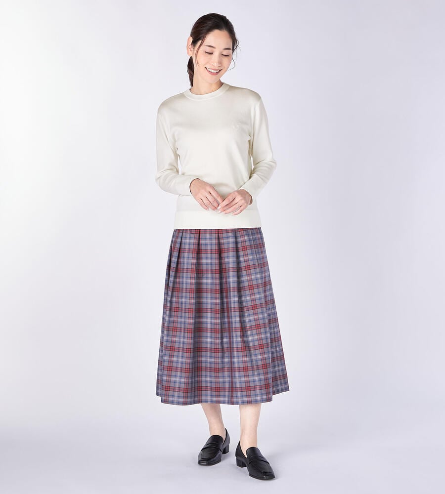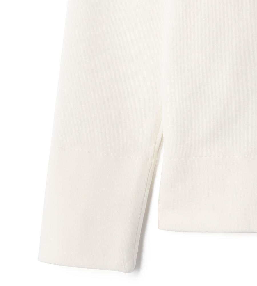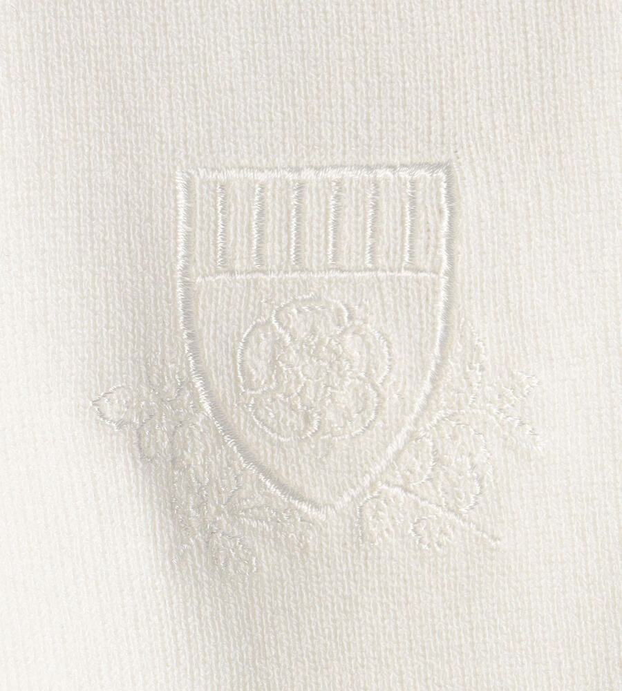トリムクルーネック長袖ニット。左胸にあしらわれたブランドロゴエンブレムの刺繍がさりげなくおしゃれなデザインアクセント。長めに取った袖口と裾のリブ編みがシルエットのアクセント。トレンドに左右されない、シンプルかつスタンダードなデザインで様々なボトムとマッチし、長く愛用できるアイテムです。