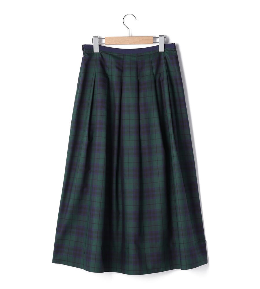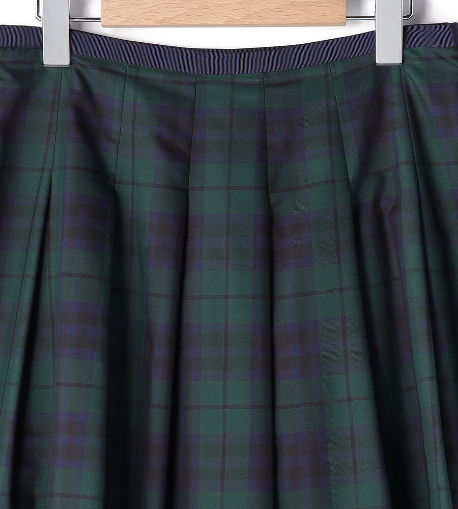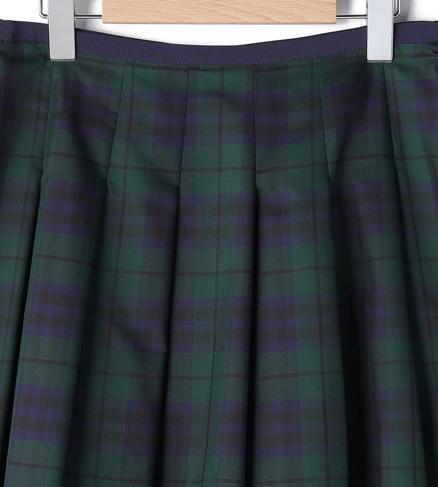 立体感のあるボックスプリーツがデザインポイントのスカート。着こなしのアクセントになるチェック柄。ハリ・コシ感のあるタフタ生地で仕立てた美しいシルエットが魅力。裾に向かってプリーツが弱くなり、フレアに広がるラインがデザインポイント。お手持ちのトップスに合わせてお洒落なお出かけコーディネートが完成します。