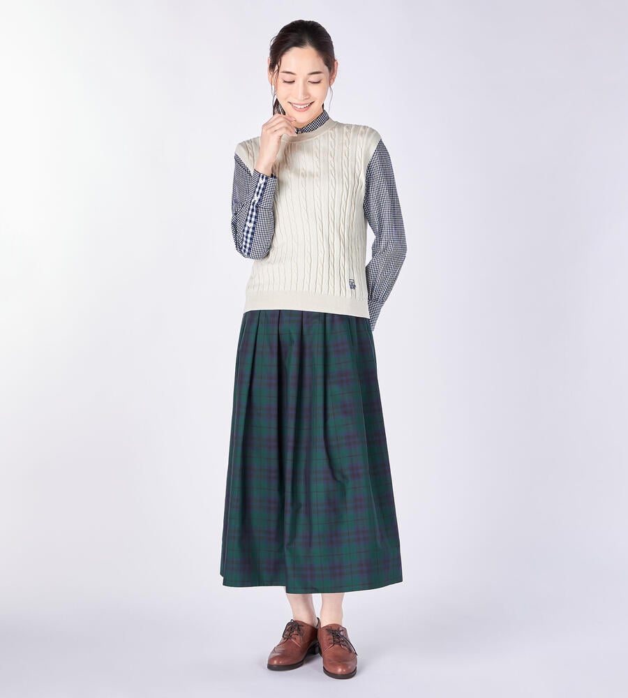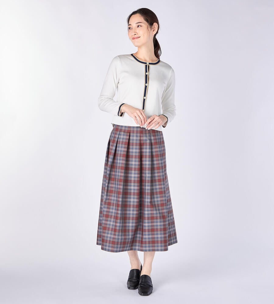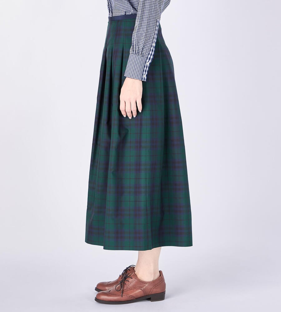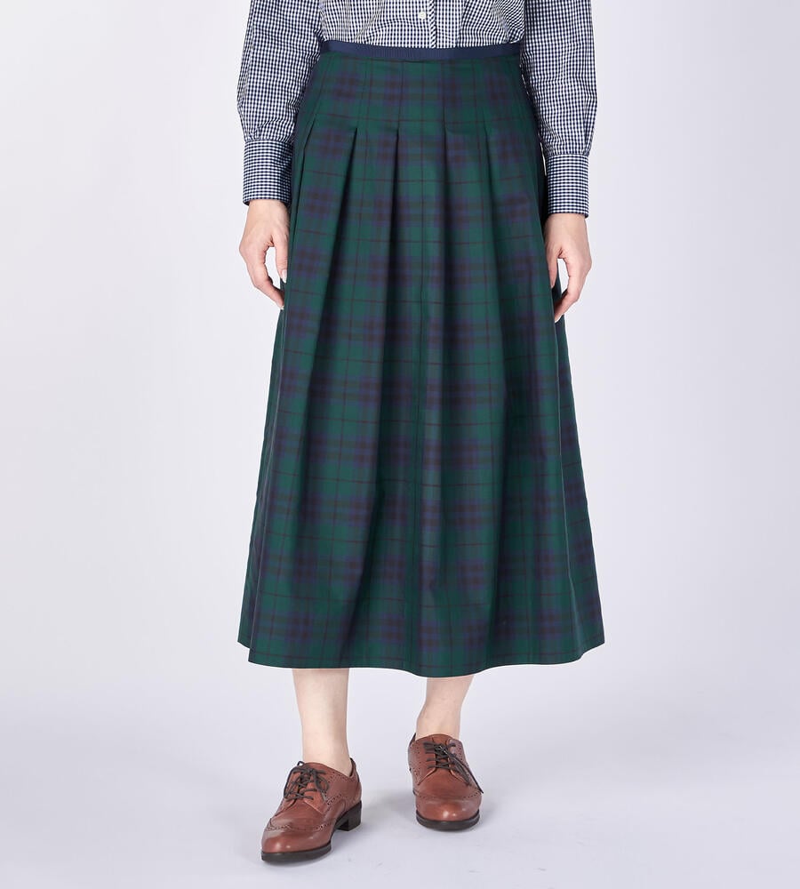 立体感のあるボックスプリーツがデザインポイントのスカート。着こなしのアクセントになるチェック柄。ハリ・コシ感のあるタフタ生地で仕立てた美しいシルエットが魅力。裾に向かってプリーツが弱くなり、フレアに広がるラインがデザインポイント。お手持ちのトップスに合わせてお洒落なお出かけコーディネートが完成します。