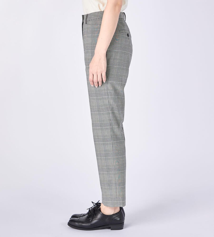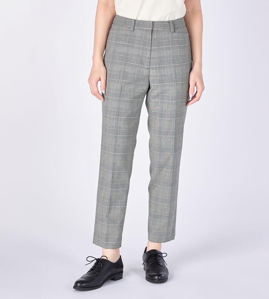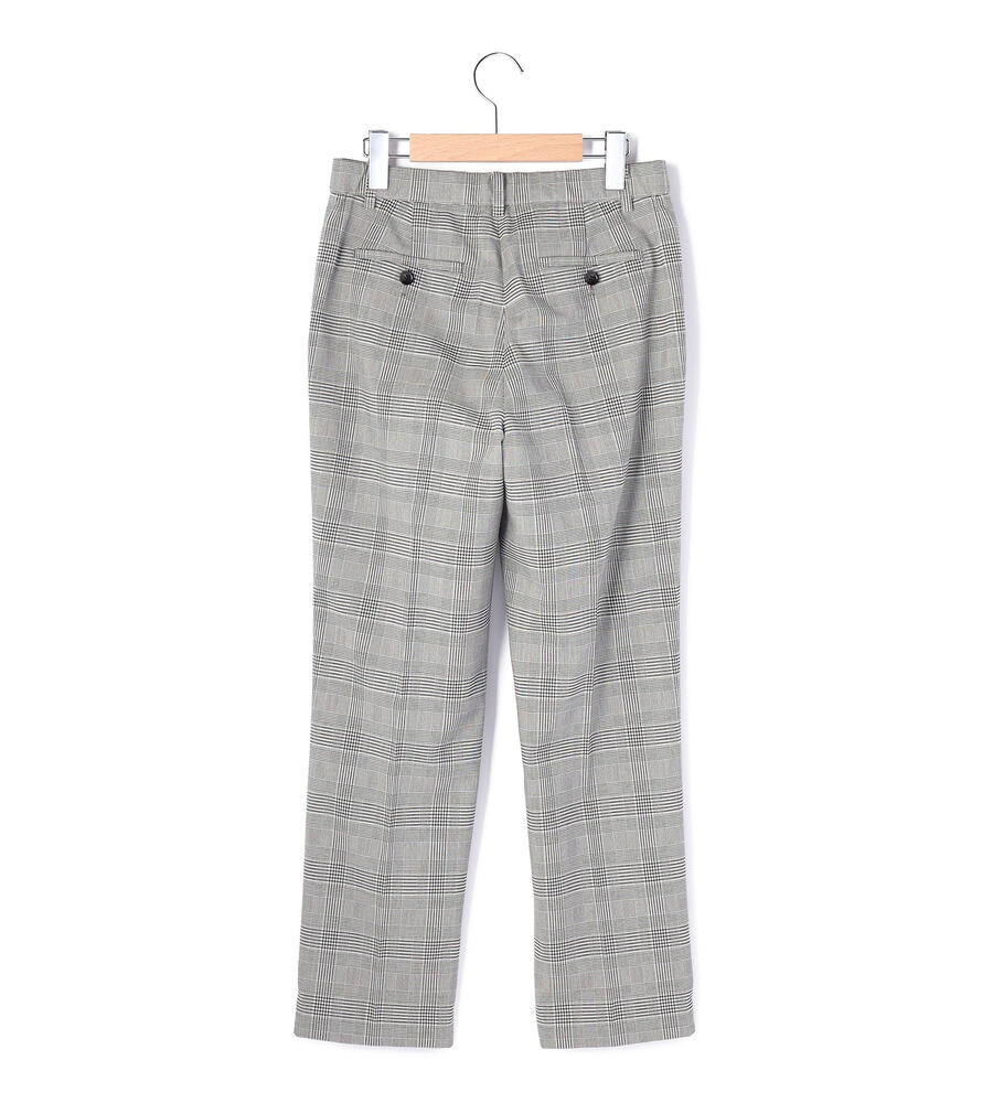 グレンチェック柄がスタイリッシュなデザインのパンツ。センタープレス入りでシックなムード。きちんと感のあるデザインながら、ウエスト後ろはゴム仕様で履き心地快適なのもうれしいポイント。お出かけコーディネートにはもちろん、オフィスシーンのおしゃれアイテムとしても活躍する便利な一枚です。