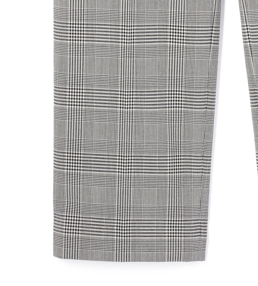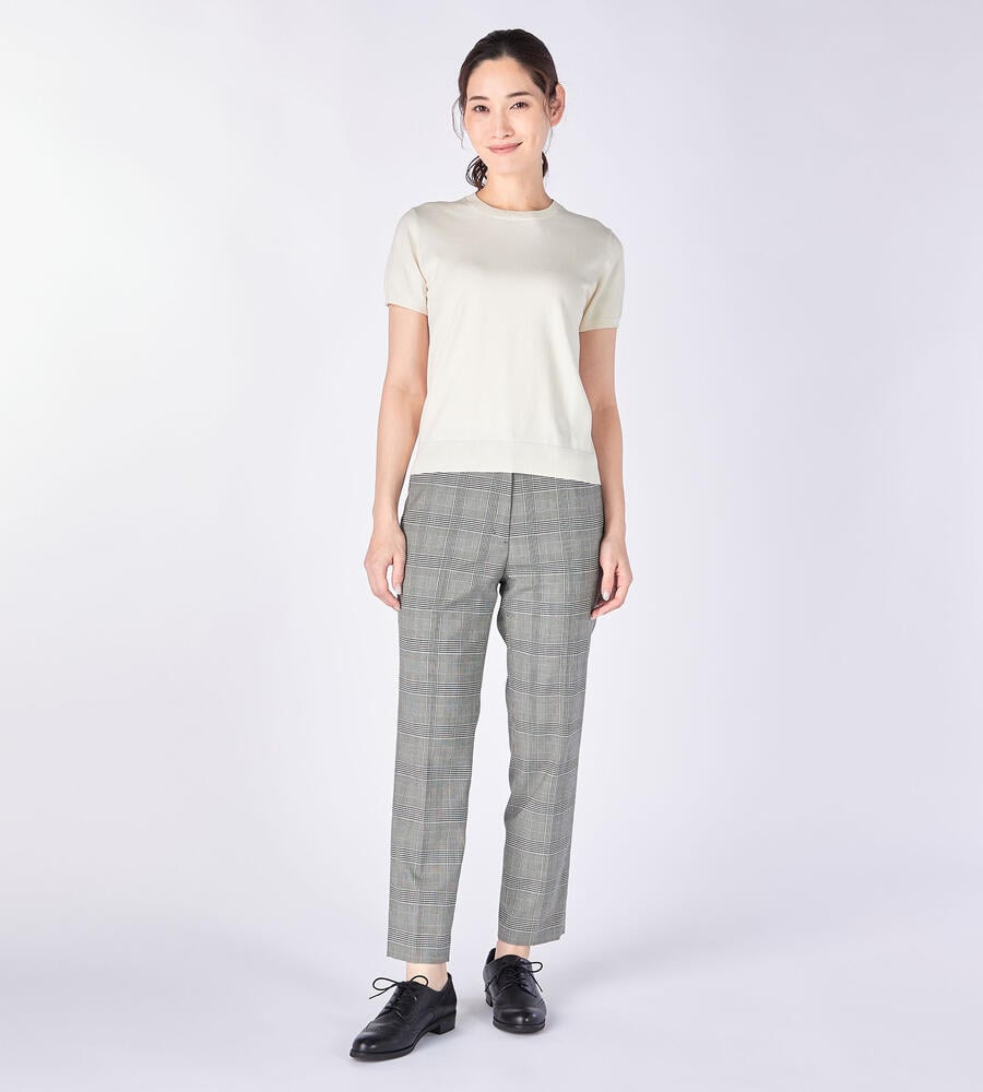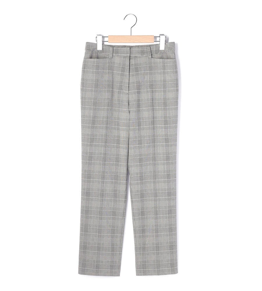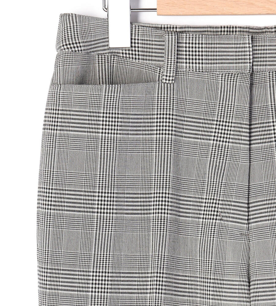 グレンチェック柄がスタイリッシュなデザインのパンツ。センタープレス入りでシックなムード。きちんと感のあるデザインながら、ウエスト後ろはゴム仕様で履き心地快適なのもうれしいポイント。お出かけコーディネートにはもちろん、オフィスシーンのおしゃれアイテムとしても活躍する便利な一枚です。