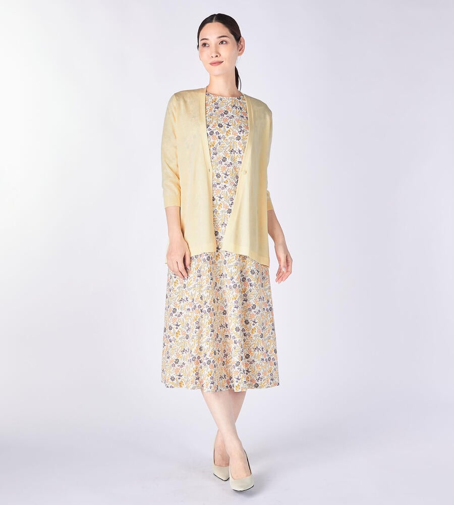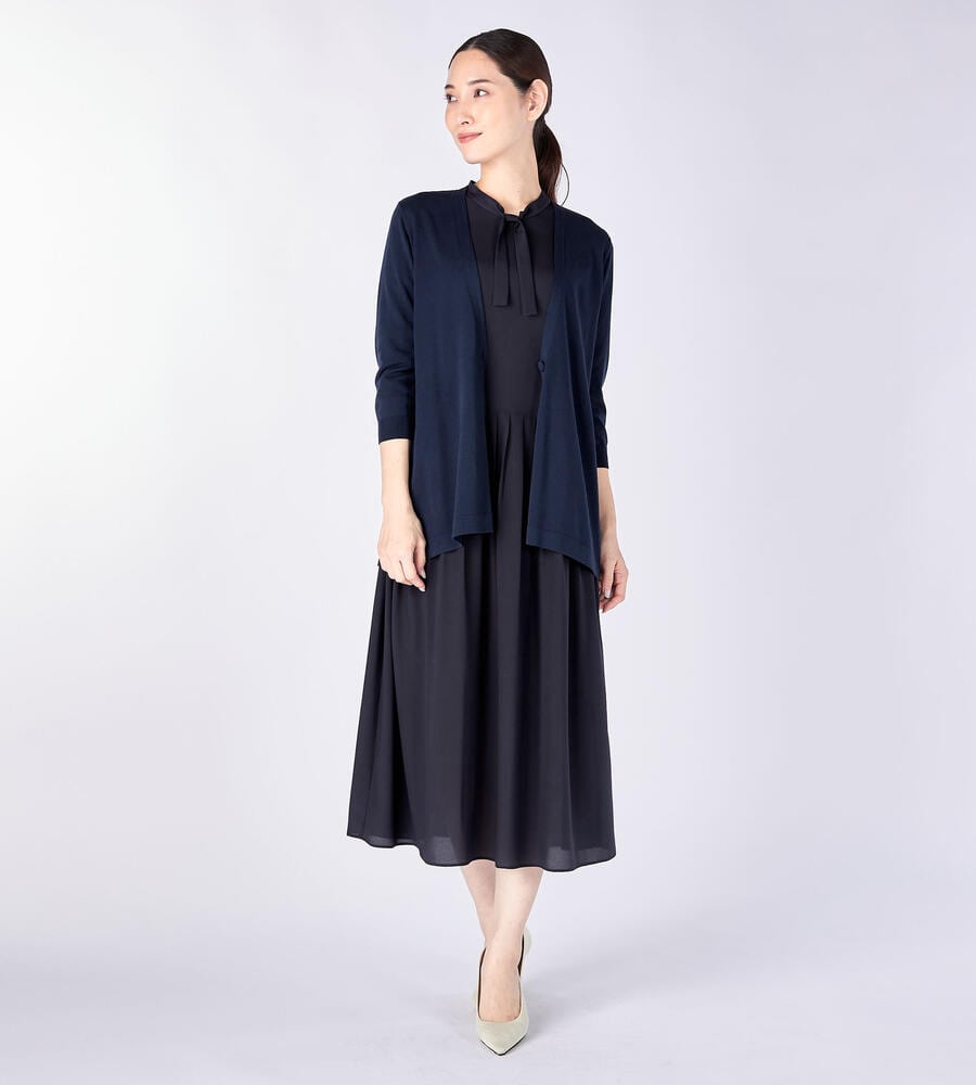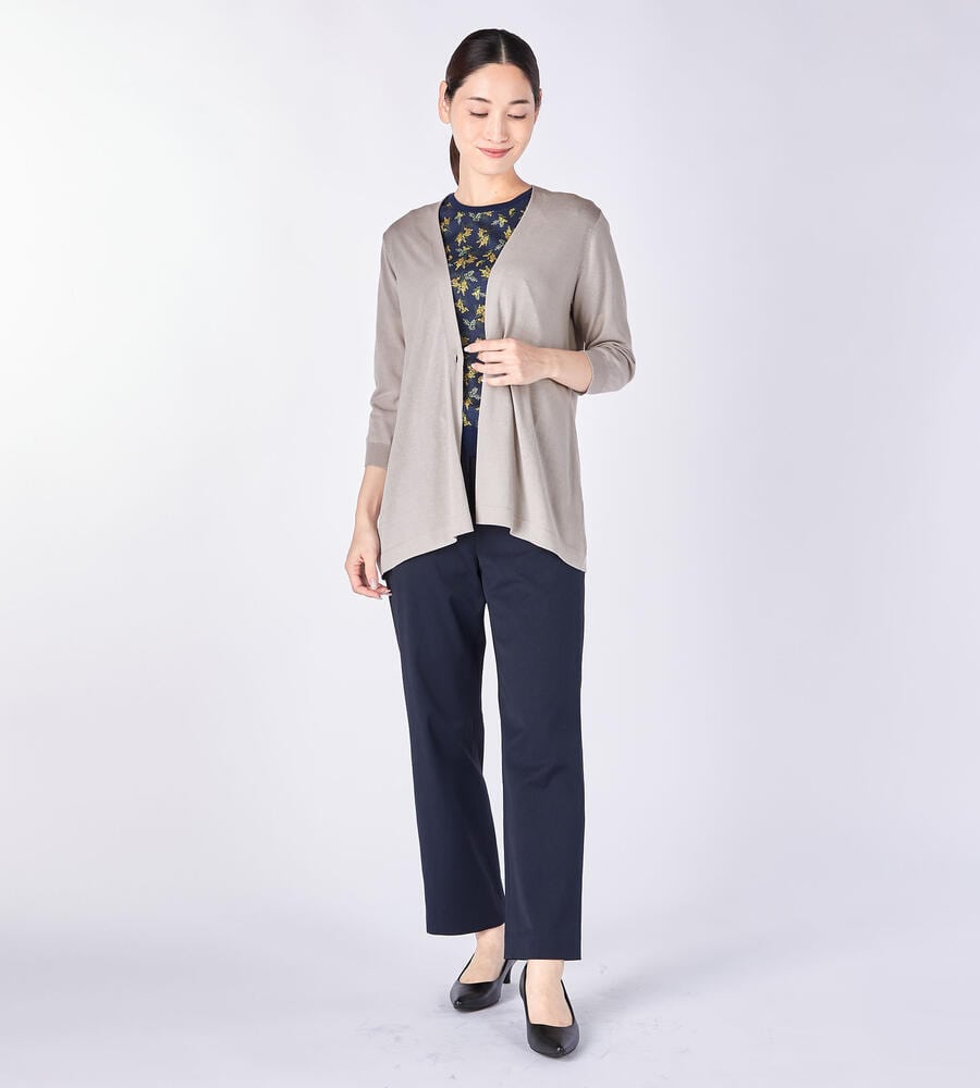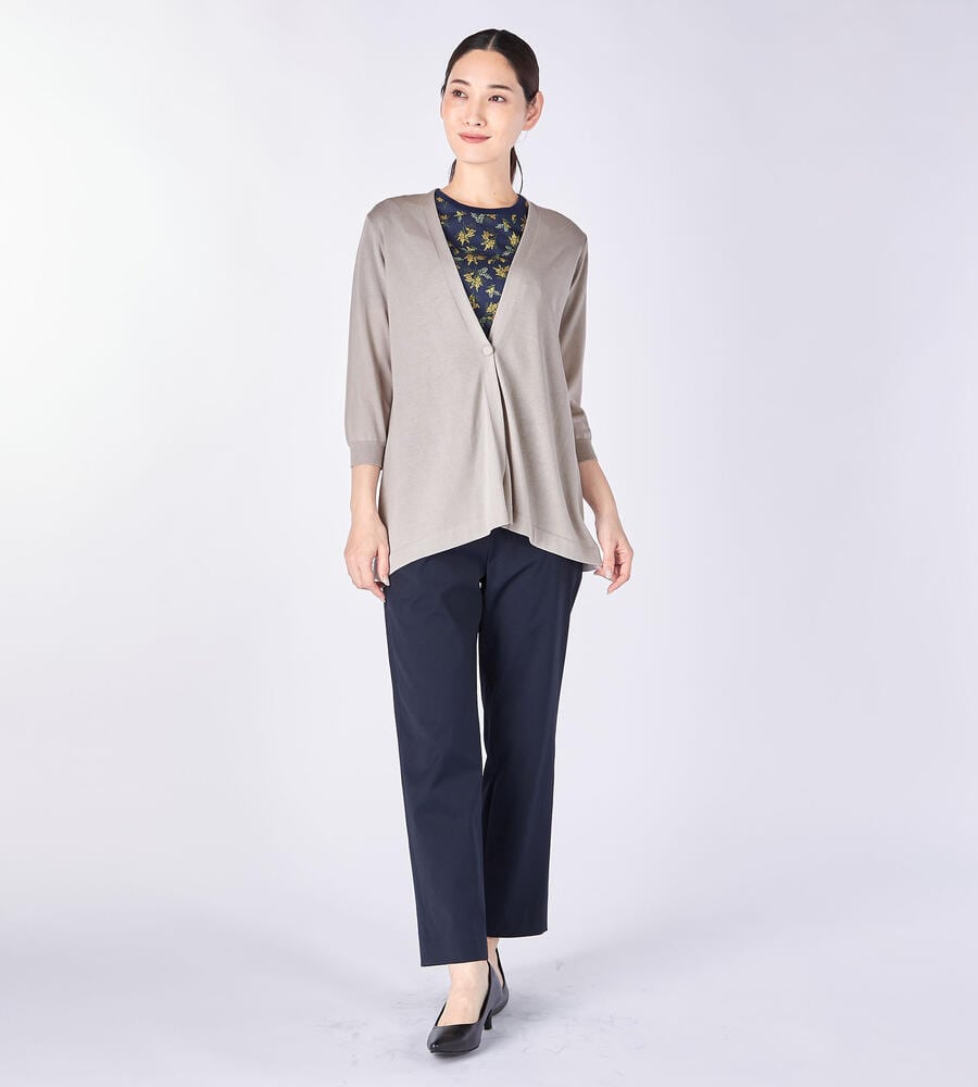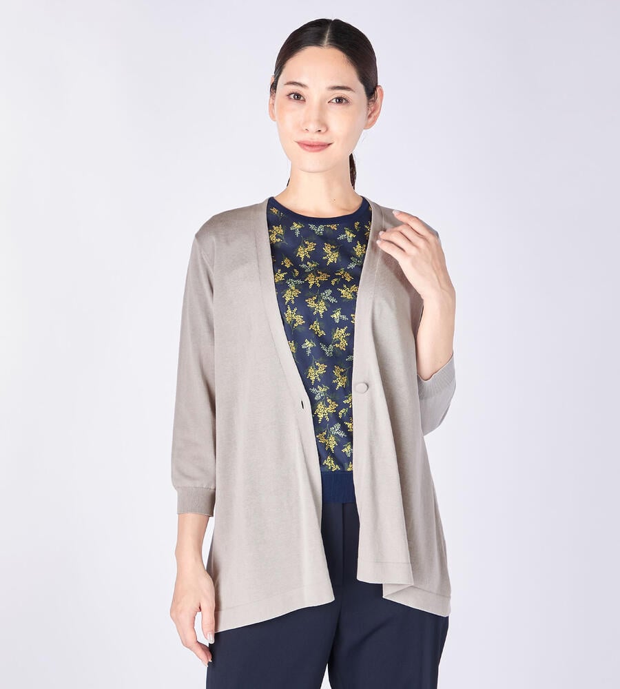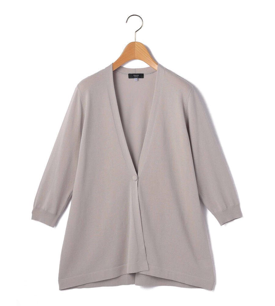なめらかな生地感で肌触りのよい天竺素材で仕立てた7分袖ニットカーディガン。上品な雰囲気を演出するハイゲージな編み目の表面感も魅力。フロントは1つボタンのシンプルなデザインで、様々なスタイリングにマッチします。フレアな裾がフェミニンなムードに。毎日のコーディネートで活躍するアイテムです。