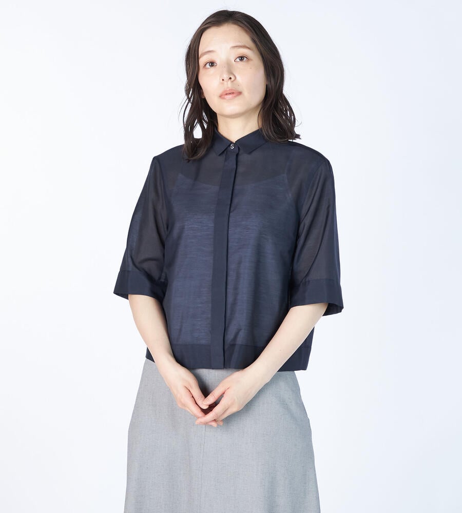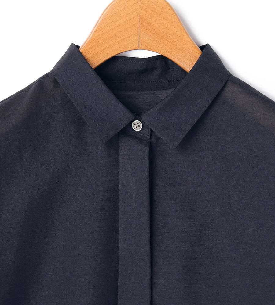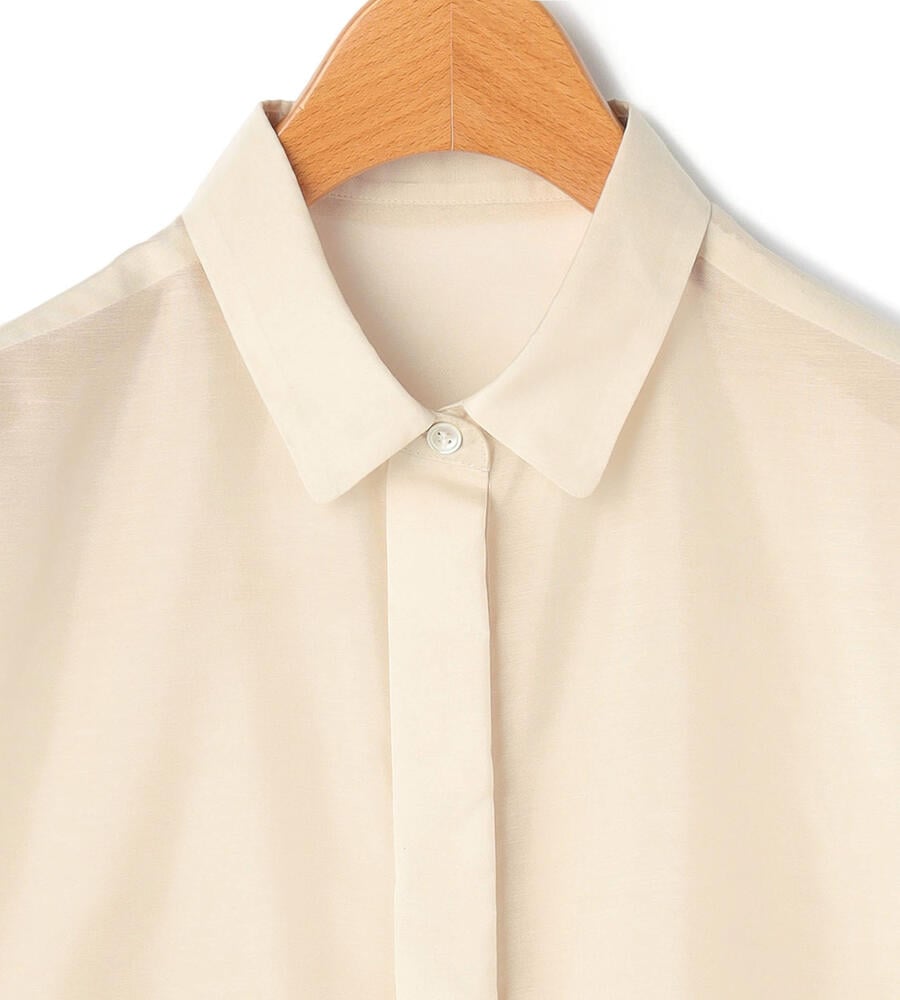 軽やかなハリのあるコットン混の素材を用いたシャツブラウスです。ほんのりとした透け感のある素材で、今年らしい涼しげな着こなしを楽しめます。ゆとりのあるシルエットながらも着丈は短めで、バランスの取れたスタイリングを実現。裾を絞っていないため、腰まわりがすっきりと見えるのも特徴です。
