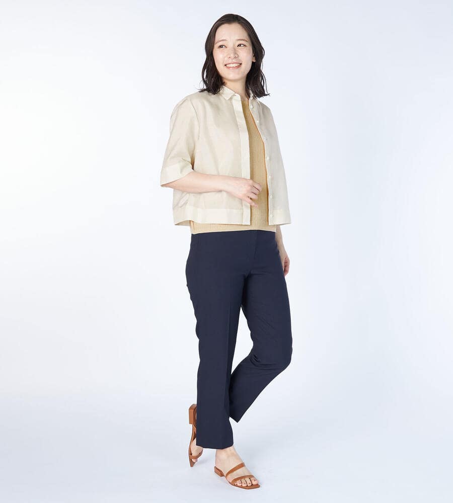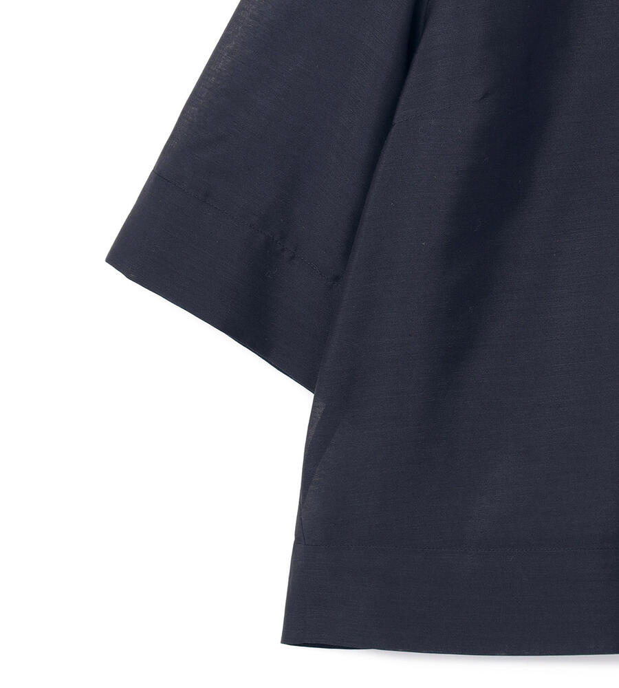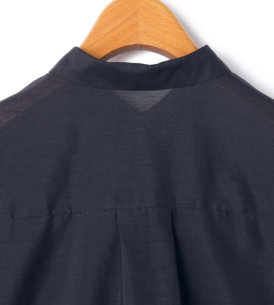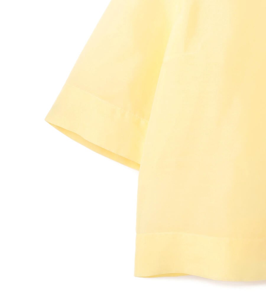 軽やかなハリのあるコットン混の素材を用いたシャツブラウスです。ほんのりとした透け感のある素材で、今年らしい涼しげな着こなしを楽しめます。ゆとりのあるシルエットながらも着丈は短めで、バランスの取れたスタイリングを実現。裾を絞っていないため、腰まわりがすっきりと見えるのも特徴です。