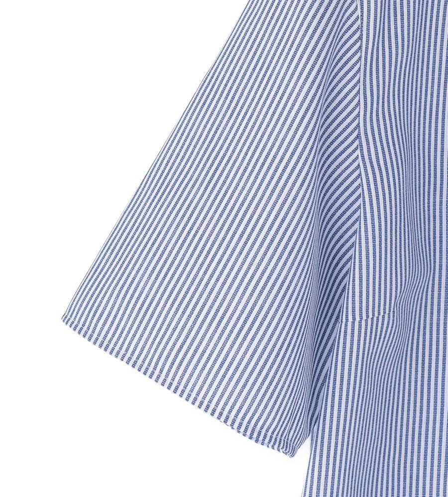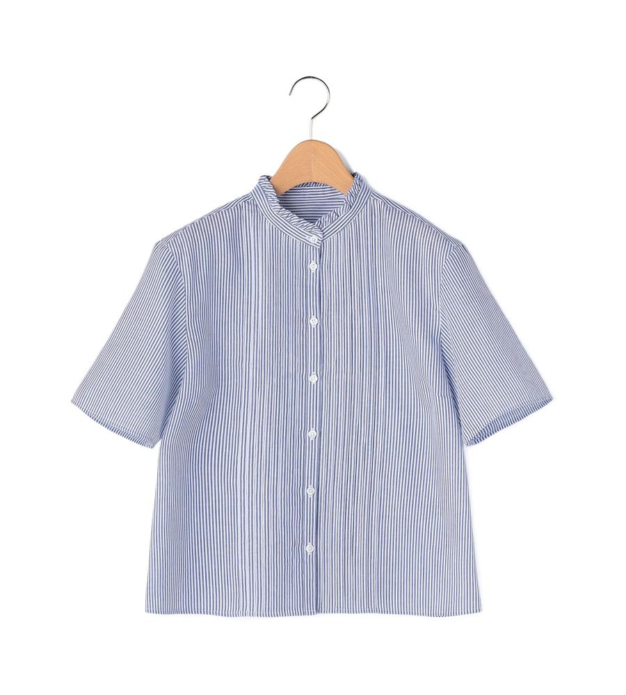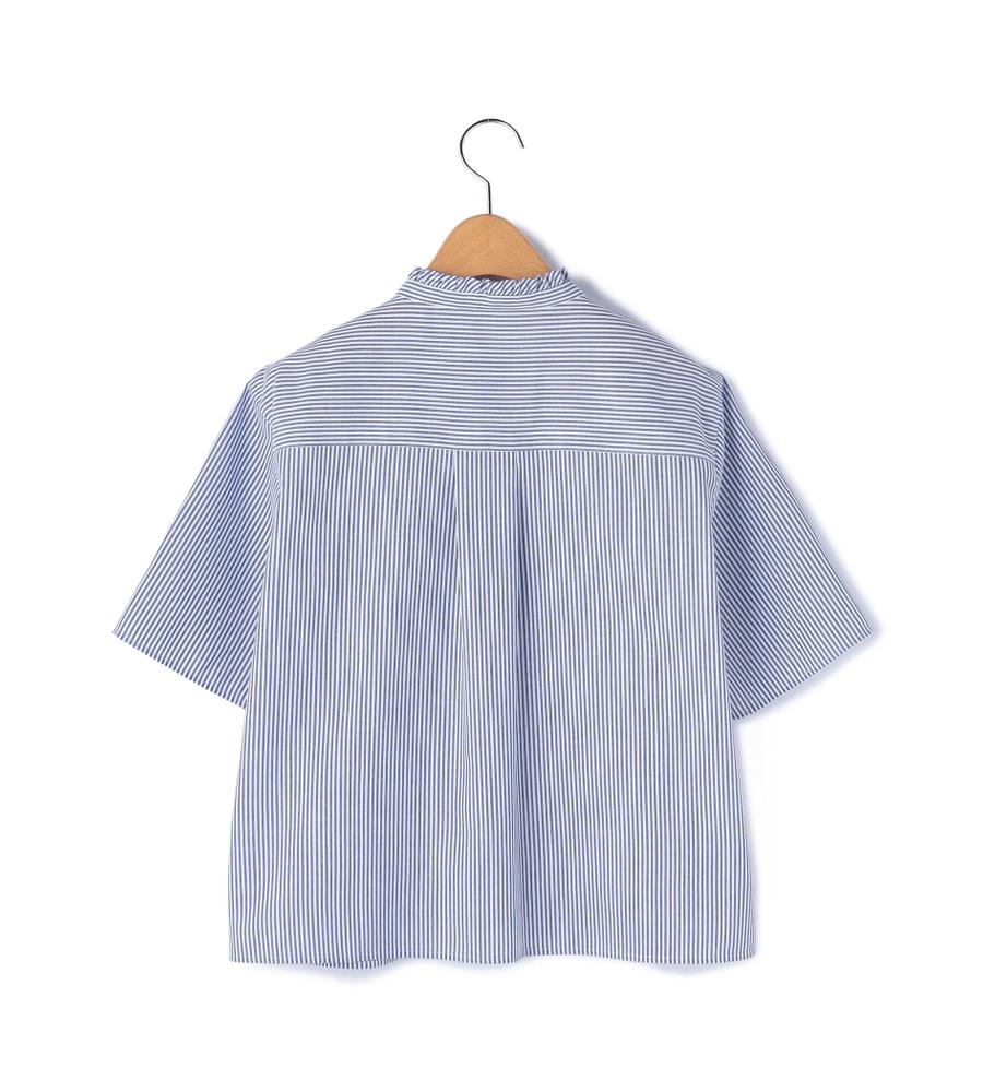 細めのストライプ柄がさわやかなムードの半袖ブラウス。フリルのスタンドカラーが愛らしいデザインポイント。涼やかなパナマ織りのコットン素材で心地よい肌触りの生地感も魅力。ストレートカットの裾で様々なボトムとマッチ。春夏シーズンらしいおしゃれなお出かけコーディネートが実現するアイテムです。