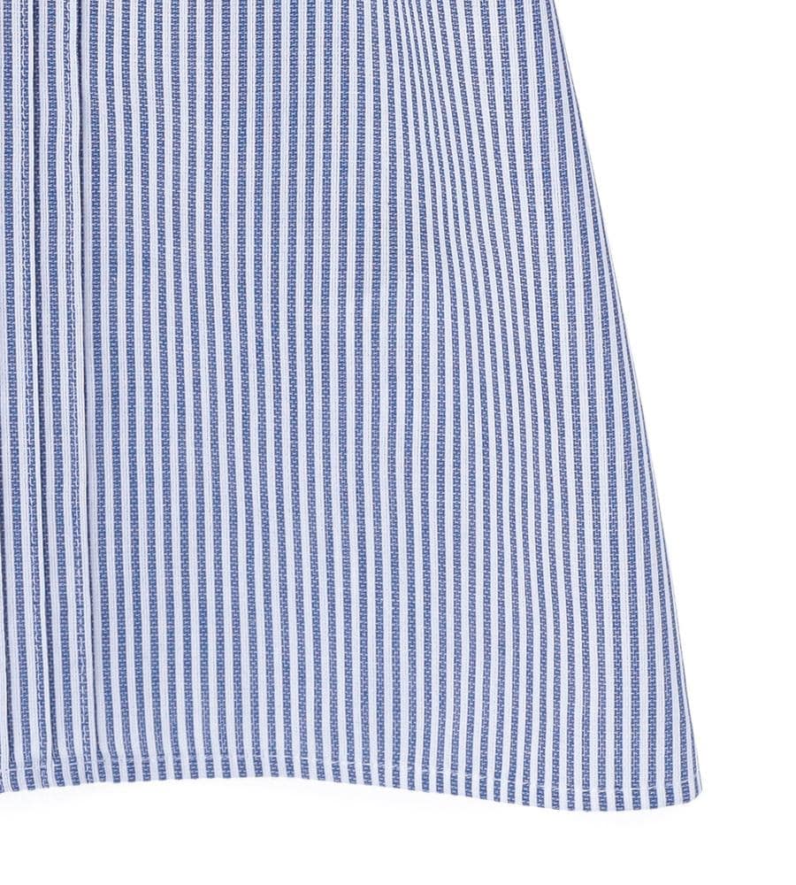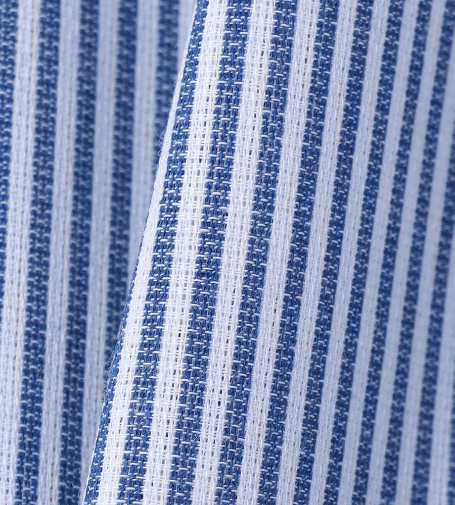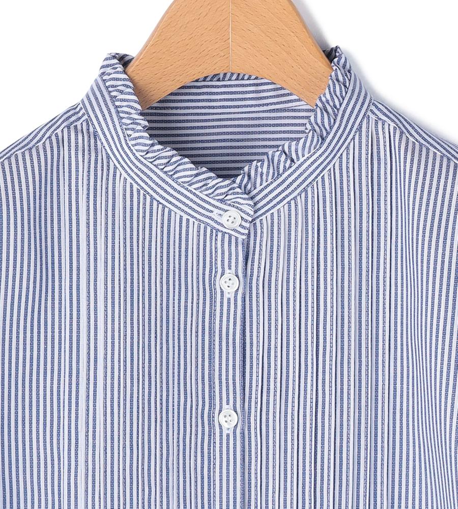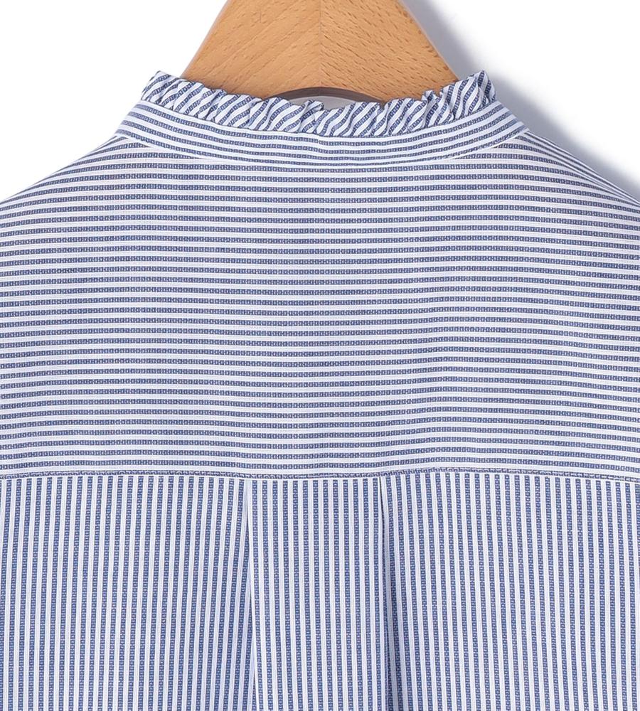細めのストライプ柄がさわやかなムードの半袖ブラウス。フリルのスタンドカラーが愛らしいデザインポイント。涼やかなパナマ織りのコットン素材で心地よい肌触りの生地感も魅力。ストレートカットの裾で様々なボトムとマッチ。春夏シーズンらしいおしゃれなお出かけコーディネートが実現するアイテムです。
