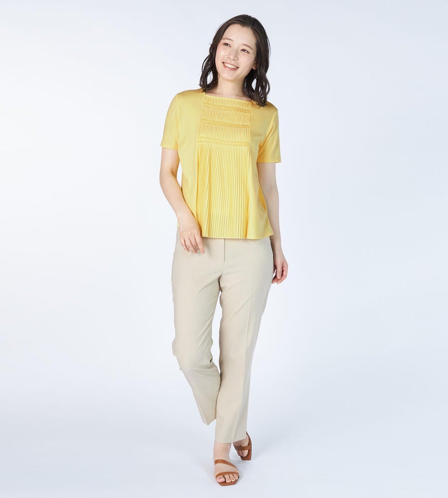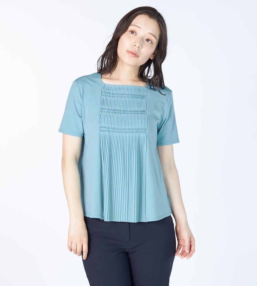 胸元に波打つような繊細なプリーツを施したカットソー。落ち感のあるジャージー素材を用いることで、リラックス感のある着こなしを楽しめます。デコルテが綺麗に見えるスクエアネックを採用。ジャージー素材ながらも華やかで上品なスタイリングを後押しします。パンツスタイルでも女性らしく着こなせるアイテムです。