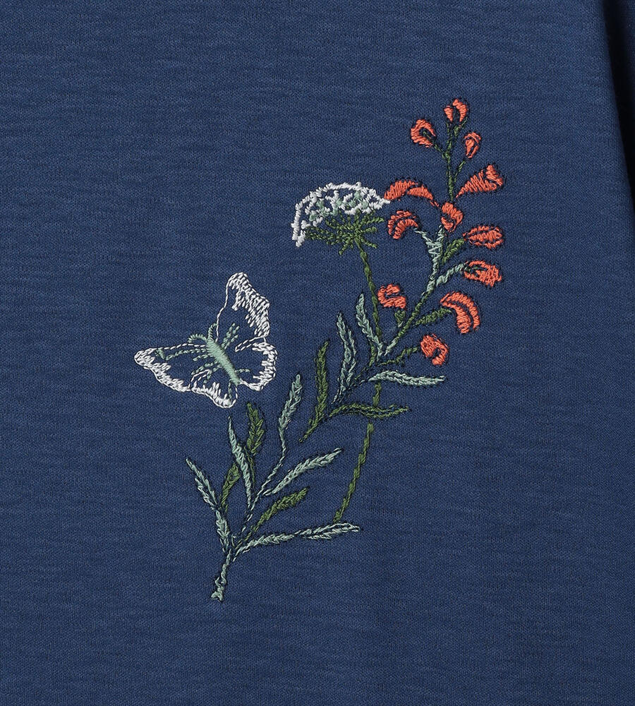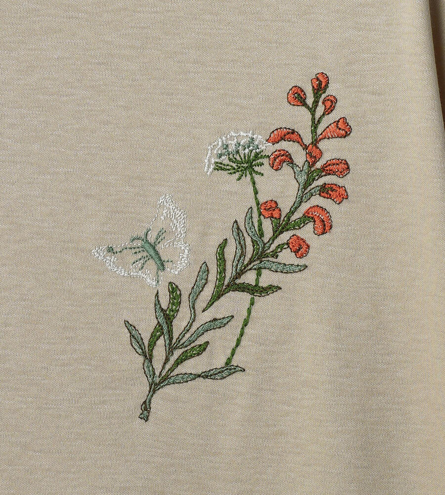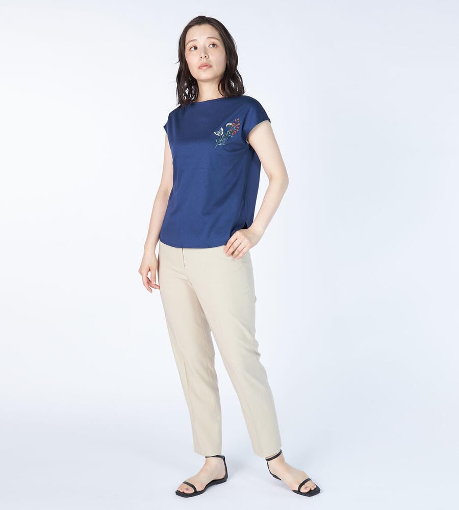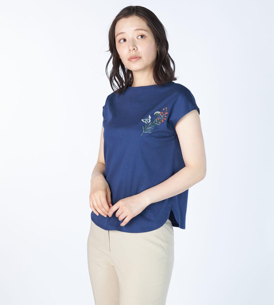 胸元のボタニカルモチーフの刺繍がエレガントなカットソー。仄かな光沢のあるジャージー素材が、着こなしをエレガントに映し出します。肩が隠れるフレンチスリーブと、露出の少ないボートネックで、大人らしい落ち着きをプラス。シンプルなスタイリングでも洗練度高くまとまるアイテムです。ジャケットなどのインナーとしても活躍。
