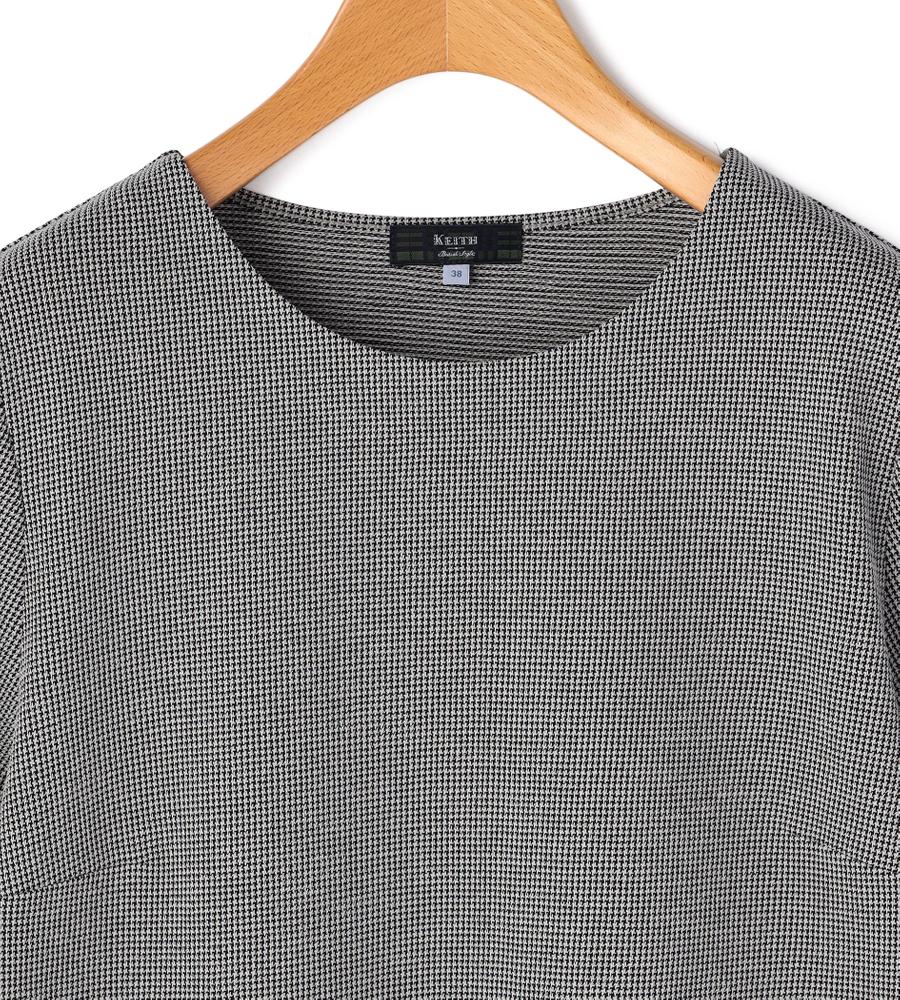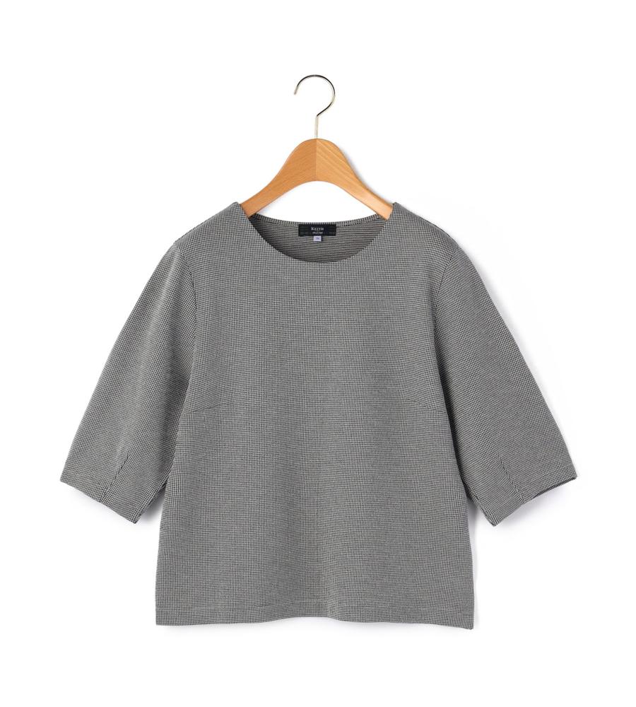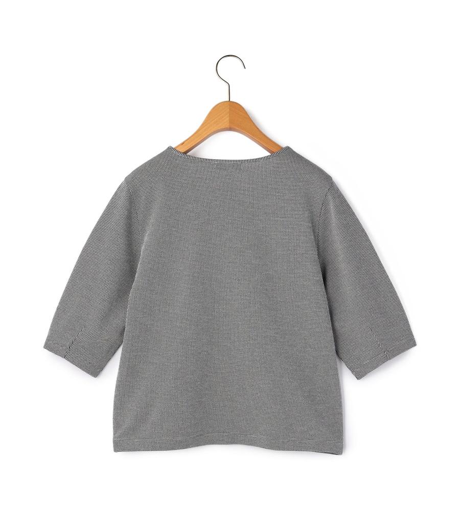 細かな千鳥格子柄がさりげなく華やかなデザインの7分袖カットソー。シンプルながら立体感のあるパターンが美しいシルエットの一枚。丸みのあるボリューム袖が今年らしいデザインポイント。お手持ちのボトムを合わせるだけで、スタイリッシュでシックなコーディネートが完成するエレガントなアイテムです。