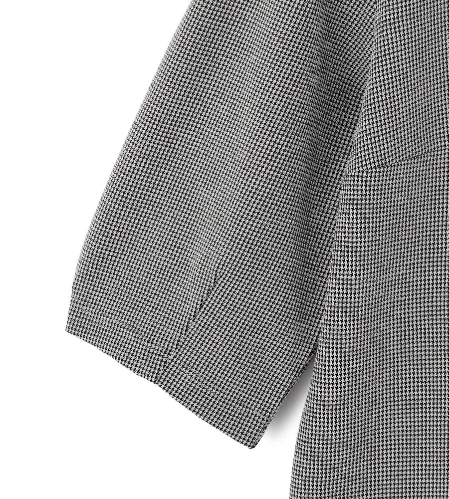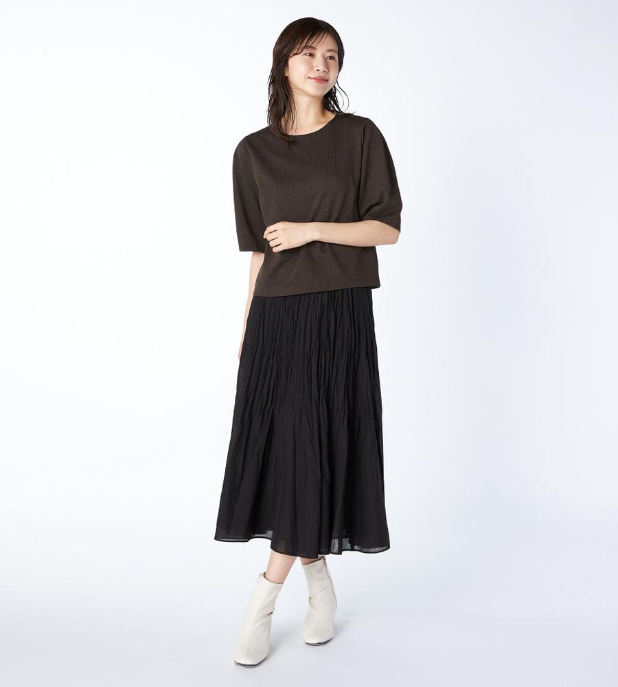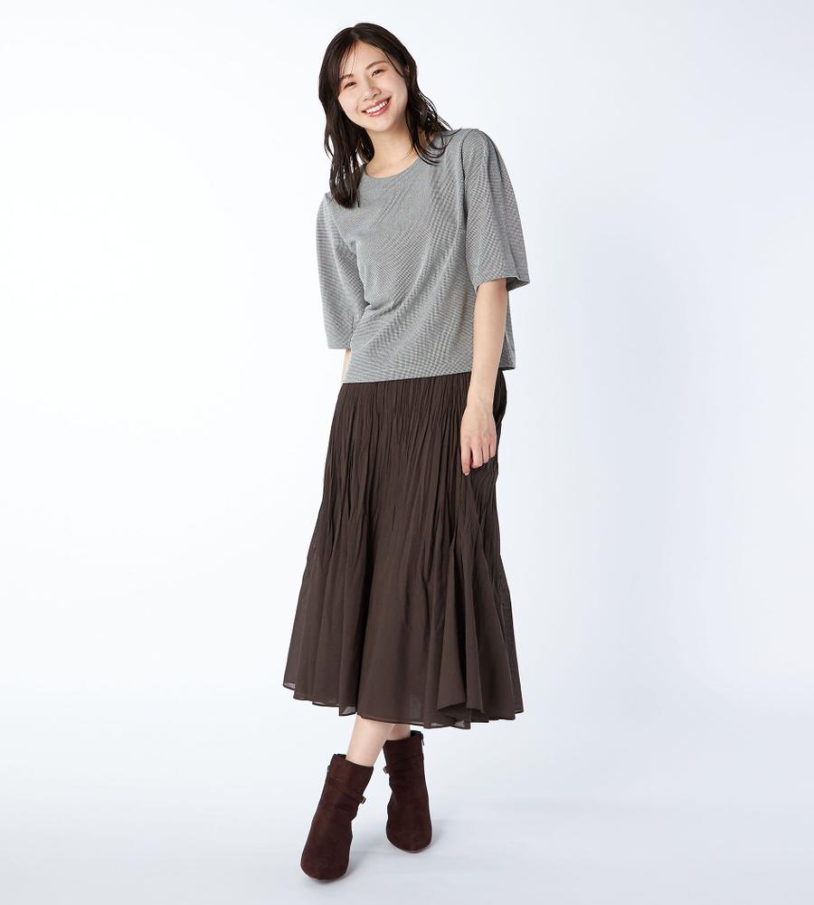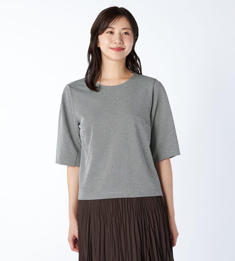 細かな千鳥格子柄がさりげなく華やかなデザインの7分袖カットソー。シンプルながら立体感のあるパターンが美しいシルエットの一枚。丸みのあるボリューム袖が今年らしいデザインポイント。お手持ちのボトムを合わせるだけで、スタイリッシュでシックなコーディネートが完成するエレガントなアイテムです。