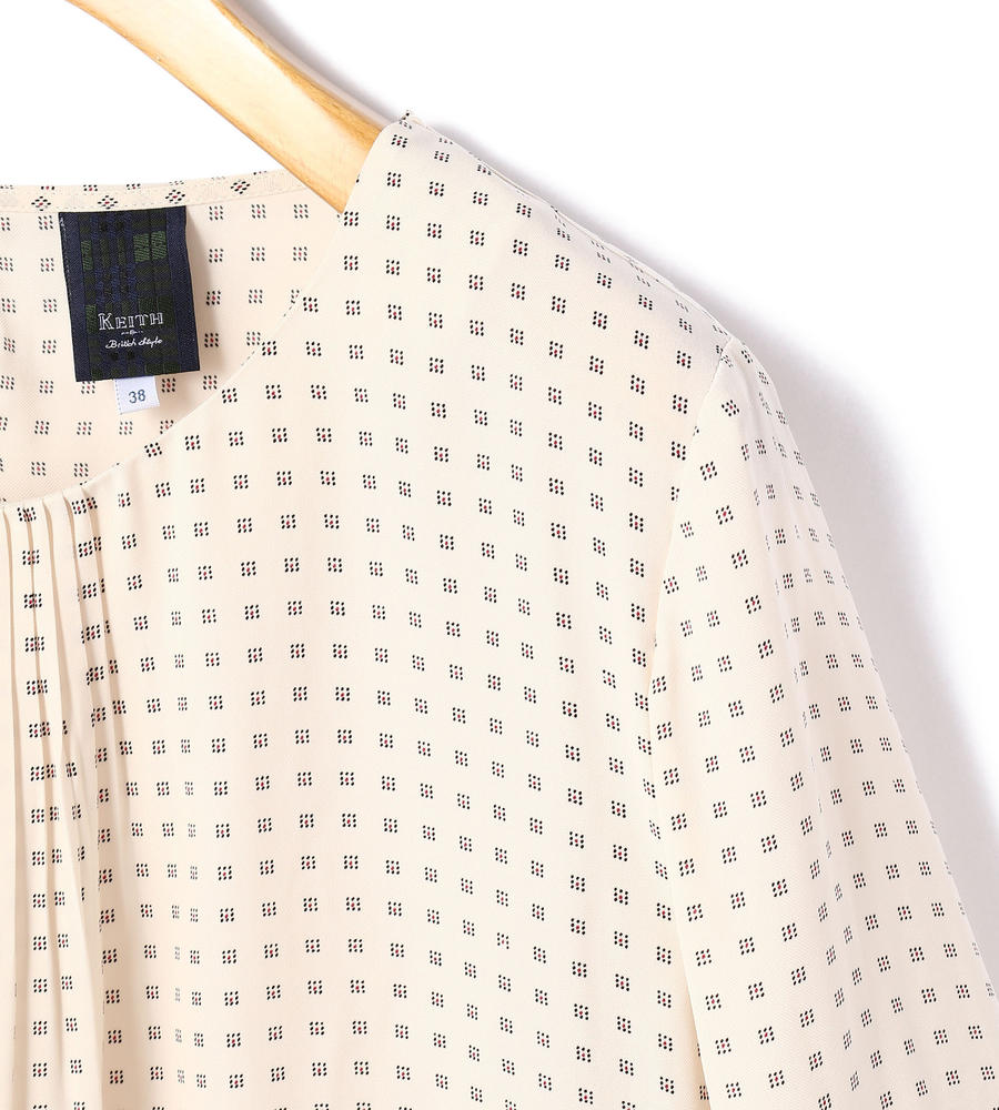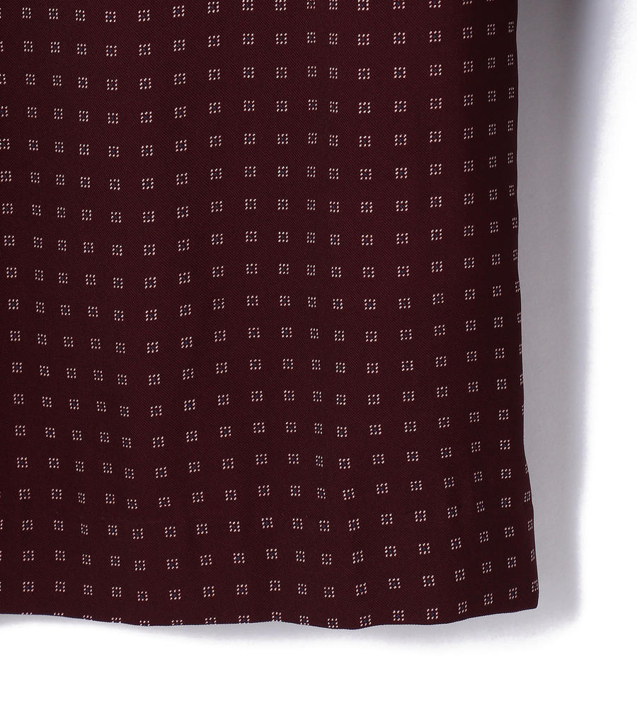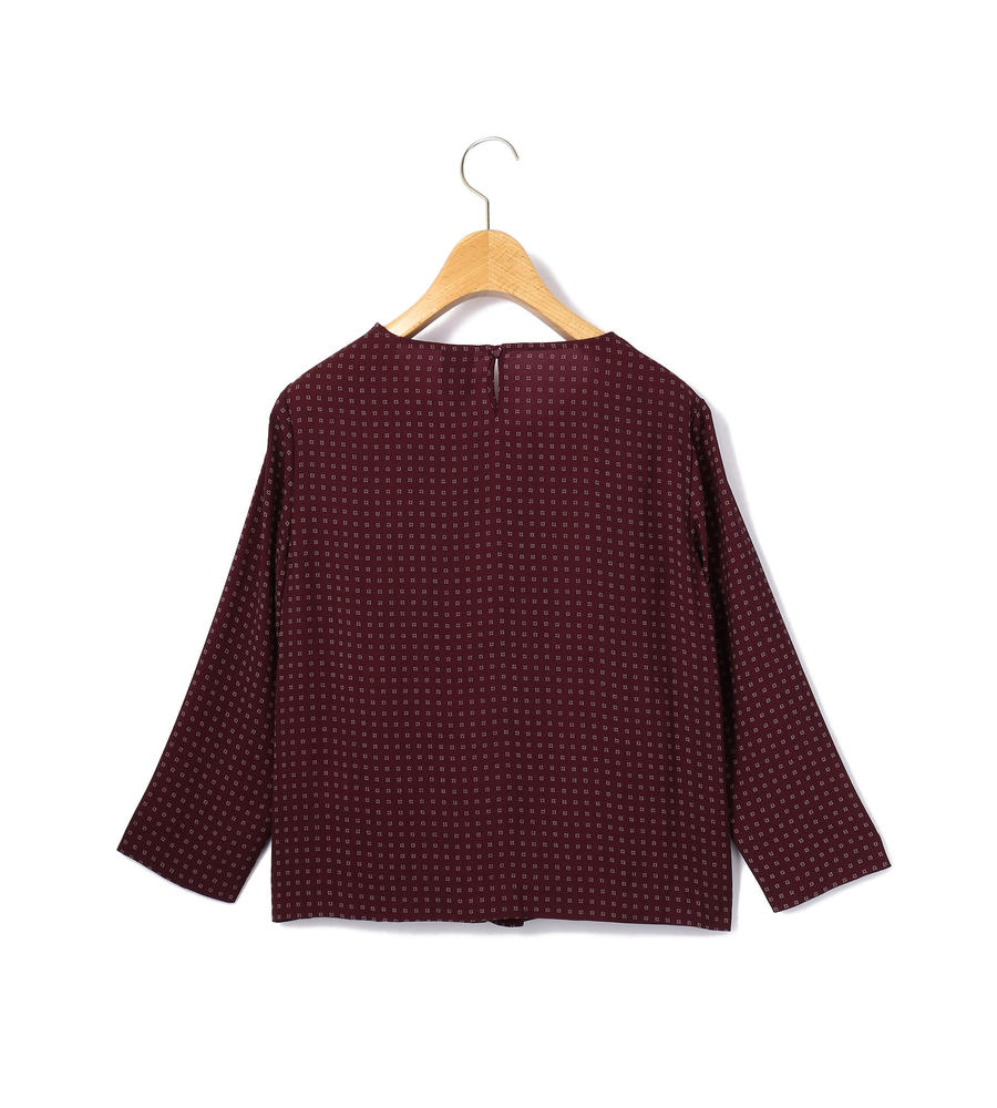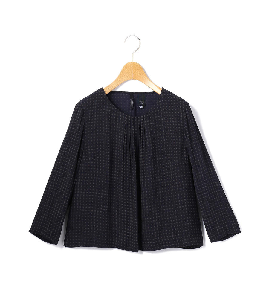 レトロなテイストのスクエア小紋柄をちりばめたノーカラーブラウス。すっきりと開いたネックラインがデコルテを美しく引き立て、女性らしい魅力を演出。ネック中央から裾に向かって繊細なプリーツをかけ、エレガントな表情に。バックネック中央には涙あきを施し、さりげない抜け感を作り出しています。