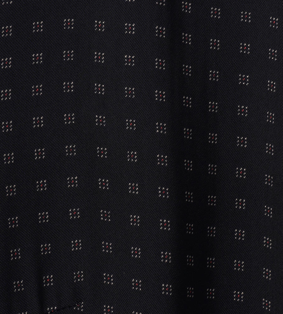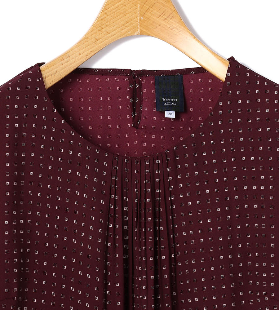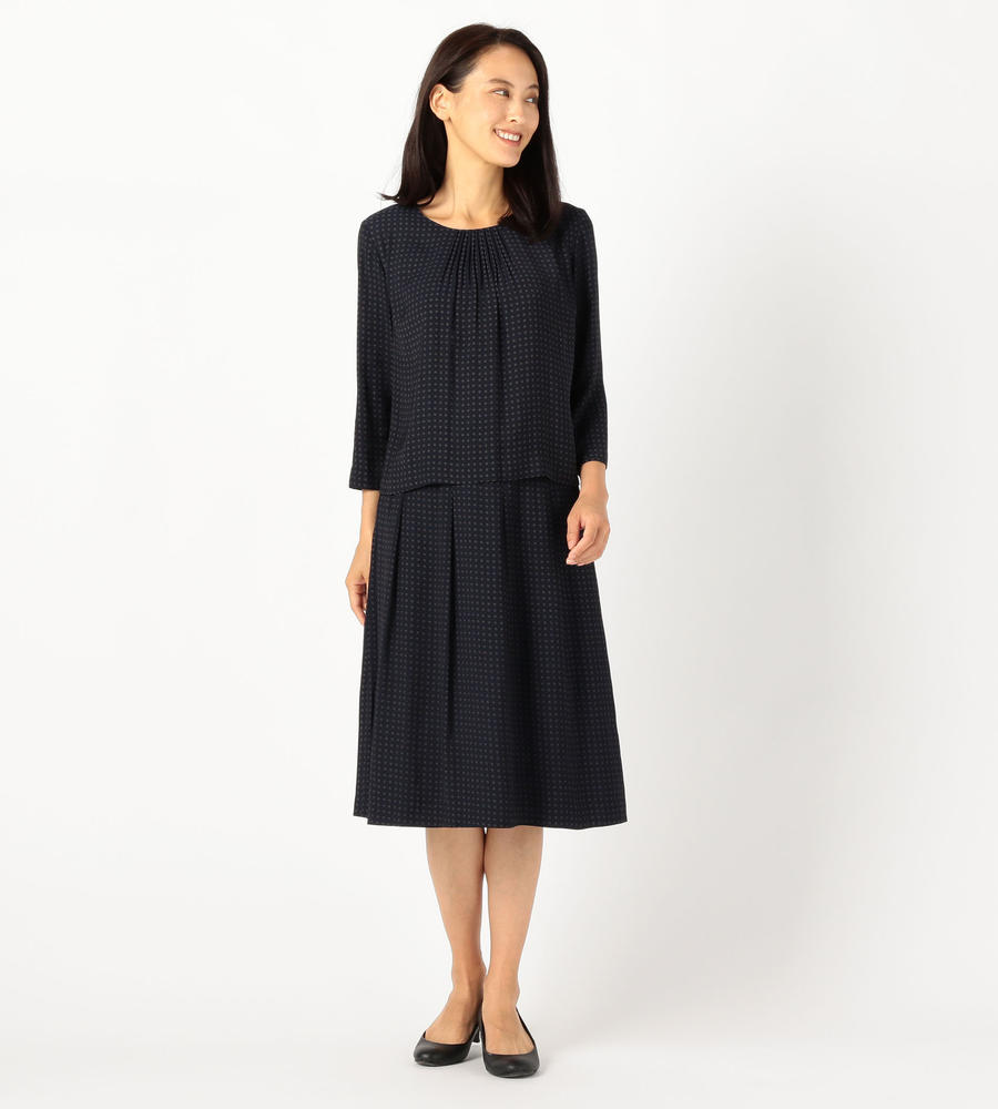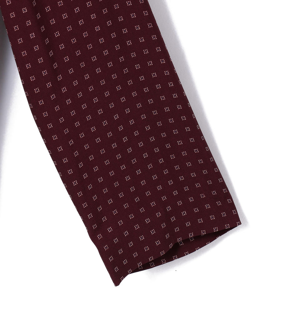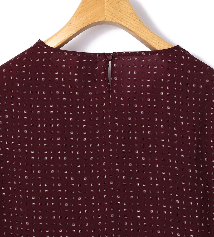 レトロなテイストのスクエア小紋柄をちりばめたノーカラーブラウス。すっきりと開いたネックラインがデコルテを美しく引き立て、女性らしい魅力を演出。ネック中央から裾に向かって繊細なプリーツをかけ、エレガントな表情に。バックネック中央には涙あきを施し、さりげない抜け感を作り出しています。