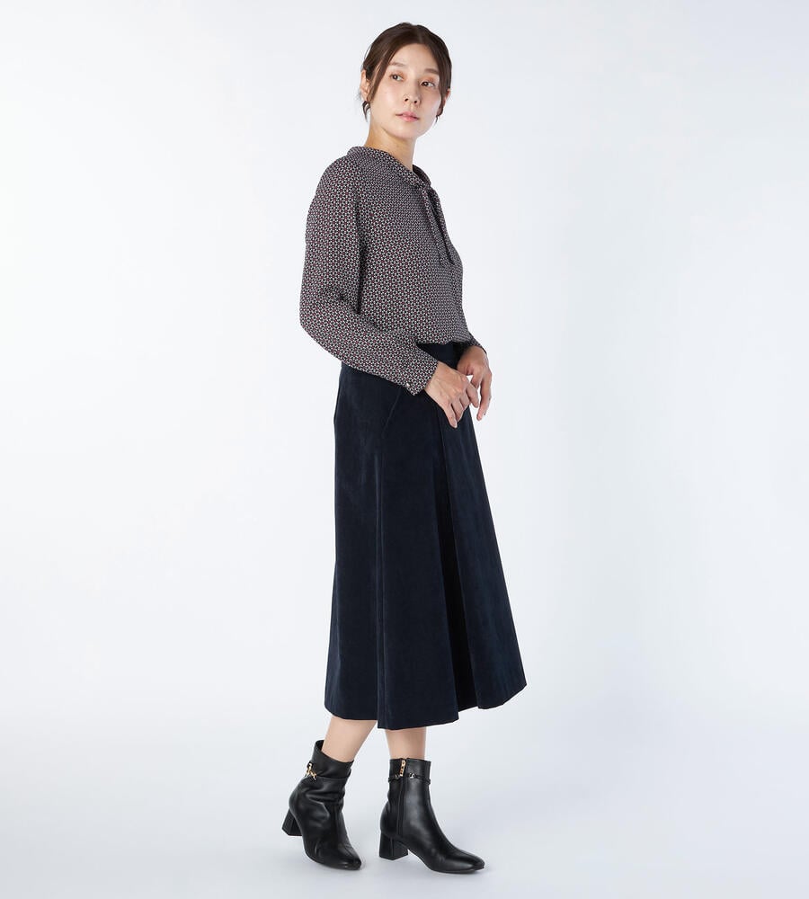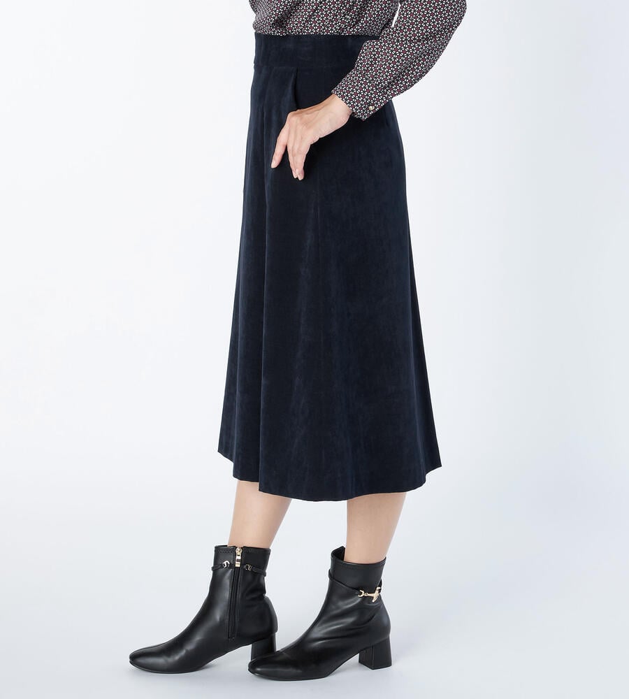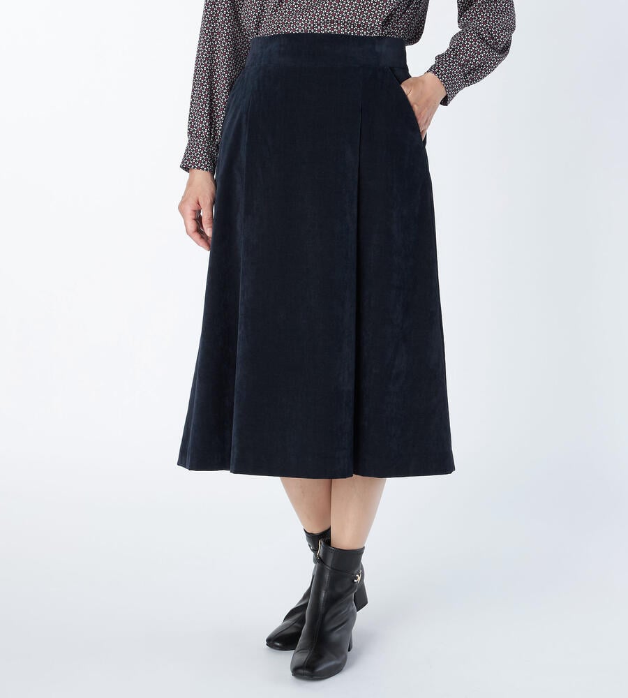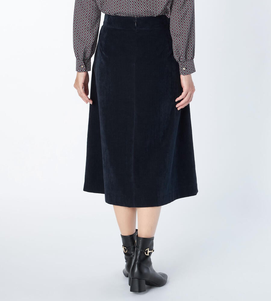 こっくりとした、深みのある風合いを持つ別珍素材のスカートです。裾に掛けて大きく広がる綺麗な台形シルエット。実際に着用することで、クラシカルな装いを楽しめます。膝が隠れる程度の着丈が、淑女の気品たっぷり。足元にブーツなどを合わせると、より季節感のある着こなしが完成します。