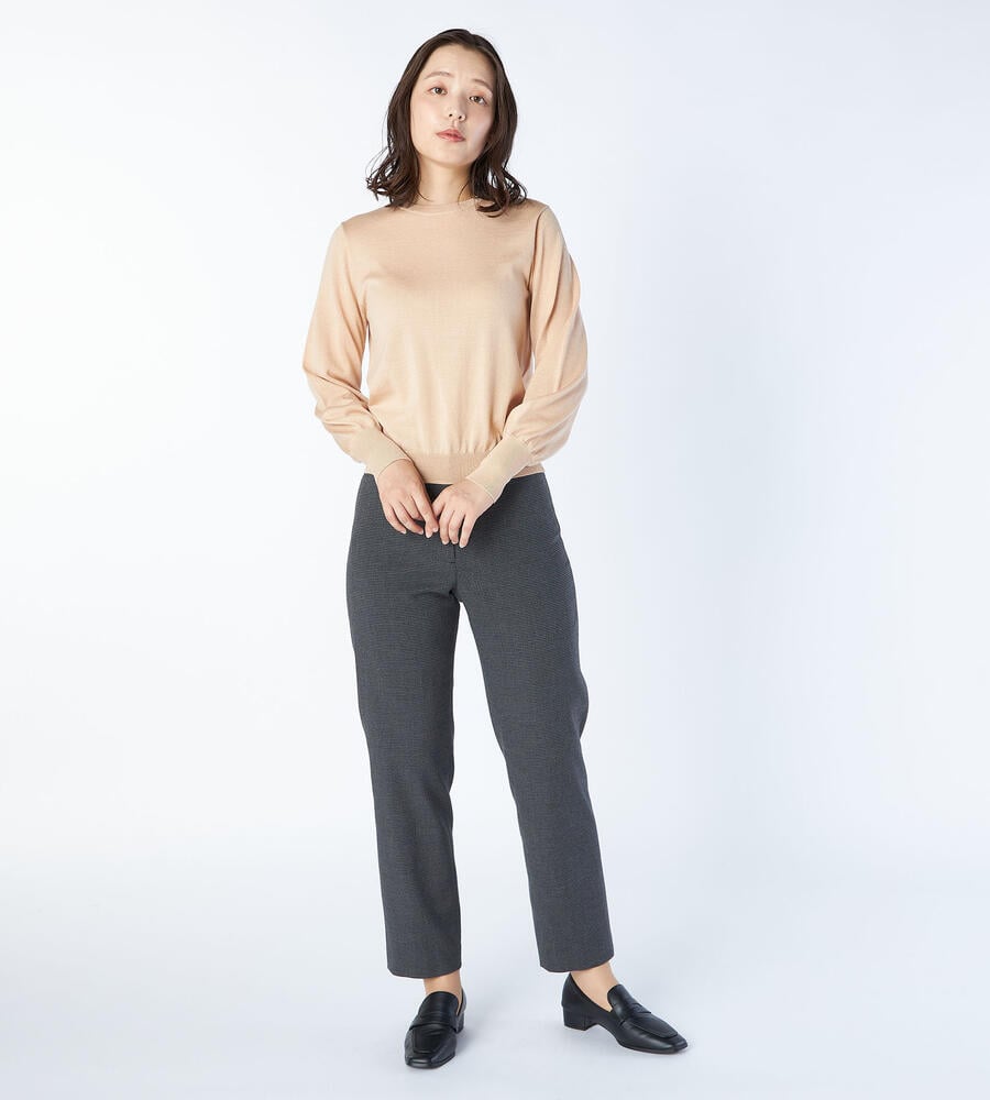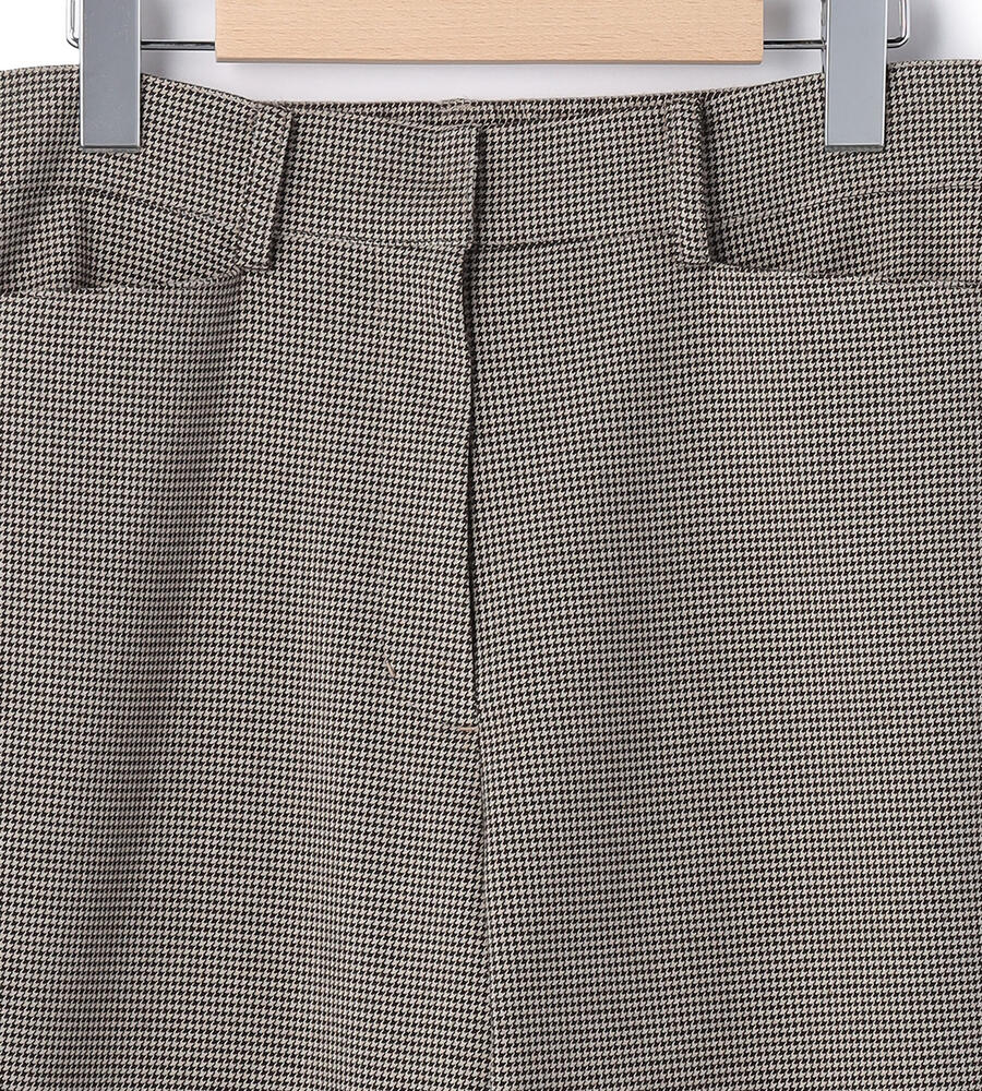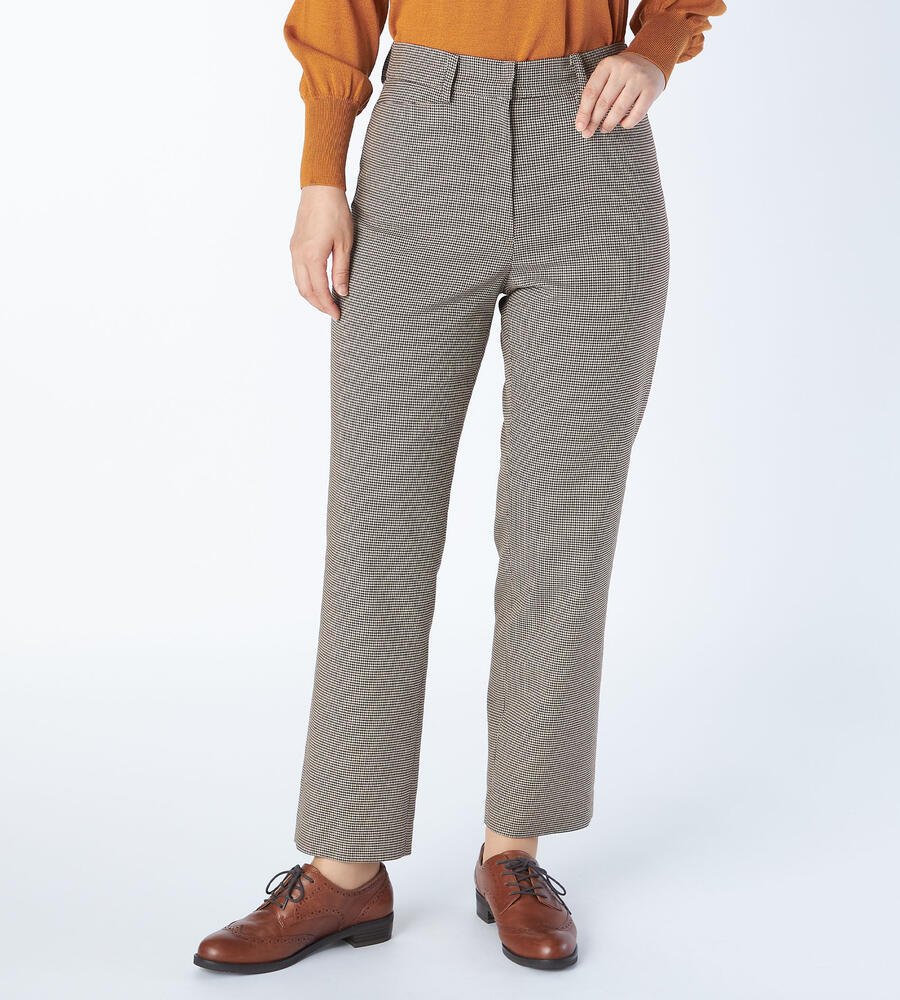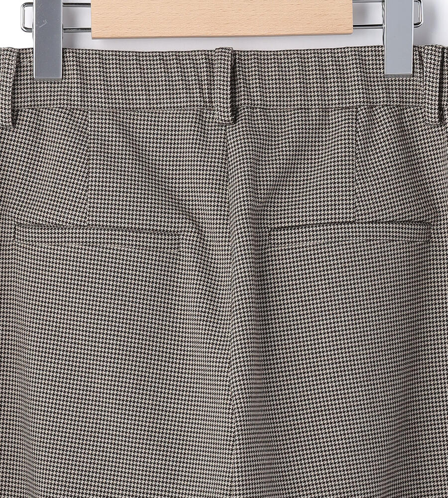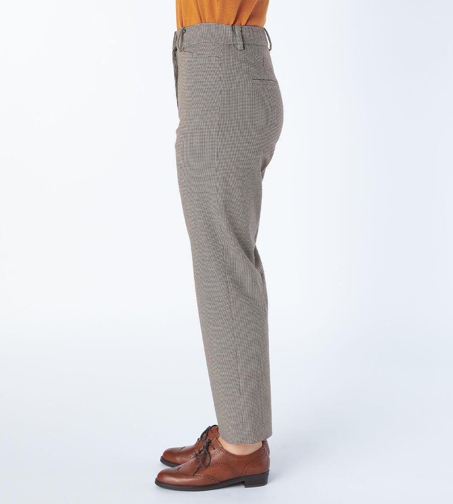 英国テイストを感じさせるハウンドトゥース柄のパンツです。足元に抜け感を出せる9分丈で、軽快な印象を与えます。裾に向かってやや細くなるテーパードシルエット。バックウエストがゴム仕様になっているため、締め付け感が少なくストレスを軽減してくれます。ややハイウエストで、タックインスタイルも様になります。