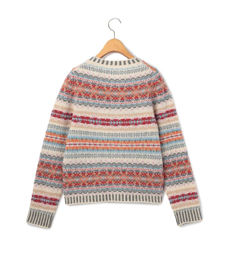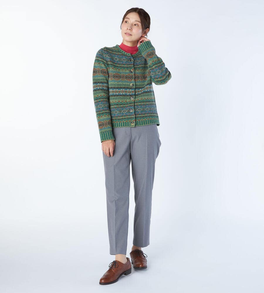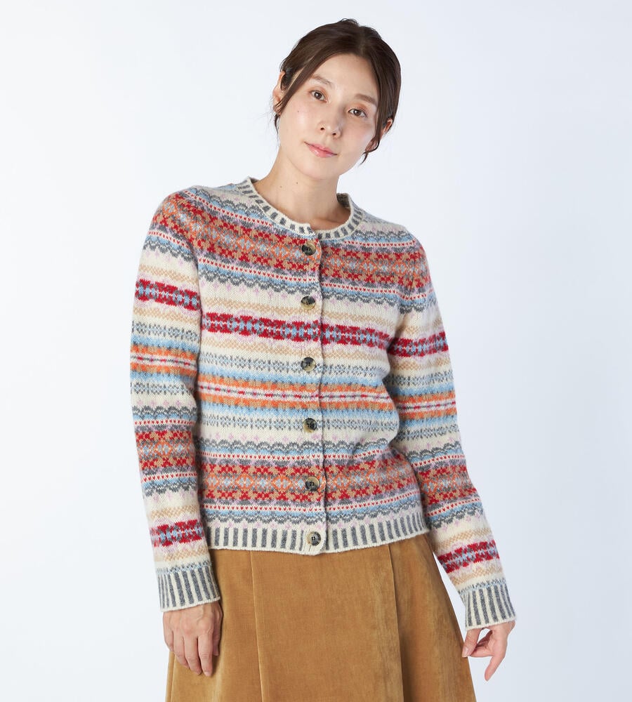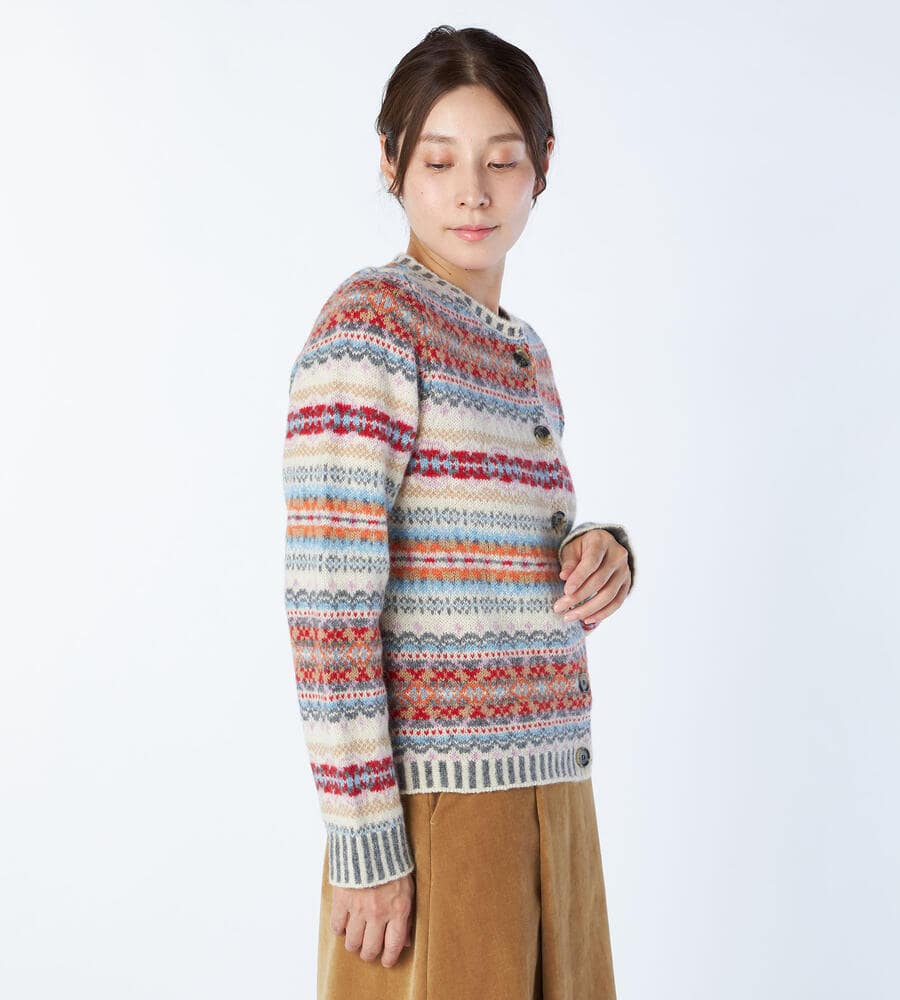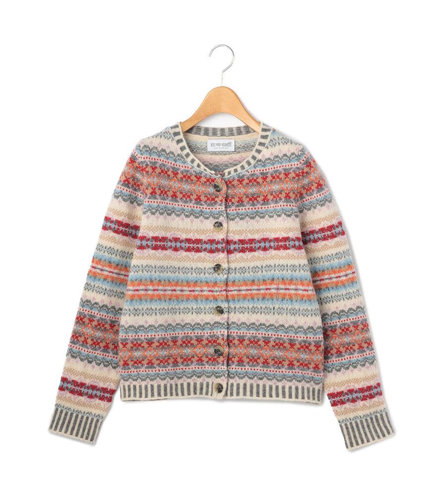 繊細な色使いと温もり溢れる柄使いに目を奪われるニットカーディガン。ウール100%を使用した、素朴ながらも上質なニットが、秋冬らしいクラシカルなスタイリングを実現します。すっきりとしたシルエットと着丈で、合わせるボトムスを選ばないのも特徴。1枚使いで見映えするため、他をシンプルに抑えても十分に着こなしの鮮度が高まります。