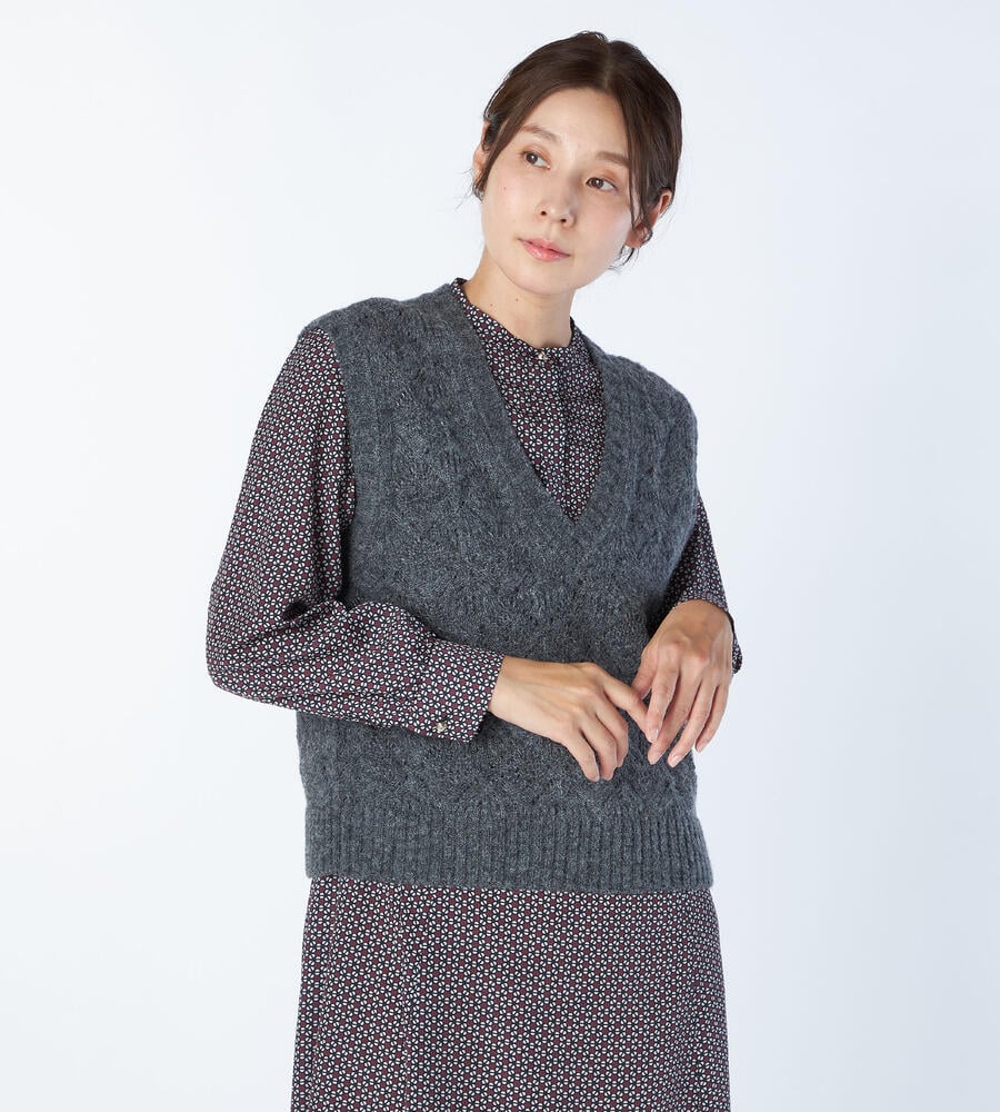 ナイロンをベースにアルパカやウールなどを織り交ぜ、温もりたっぷりに仕上げたニットベスト。レースのような繊細でロマンティックな柄使いで、着こなしをフェミニンに彩ります。インに合わせるトップスが映える、コンパクトなサイジング。シンプルなスタイリングに合わせるだけで、季節感たっぷりの愛らしいコーデが完成します。