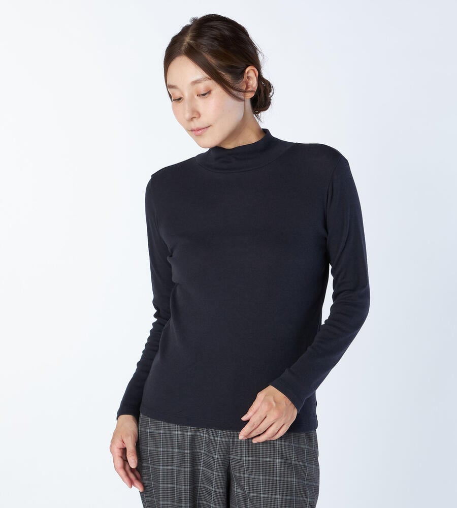 コットンとウールを織り交ぜ、肌当たり良く仕上げたフライス編みのニットトップス。レイヤードスタイルのインナーとしても活躍する、すっきりとしたシルエットとハイネックを採用しています。少し透け感がありながらも暖かな着心地を味わえるのも特徴。ベストやカーディガンなどのインナーに最適です。