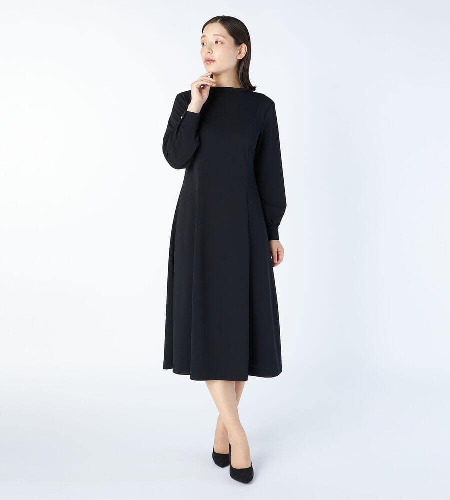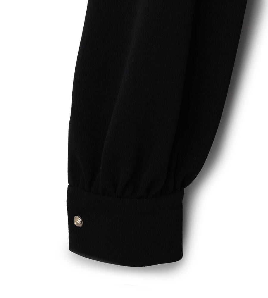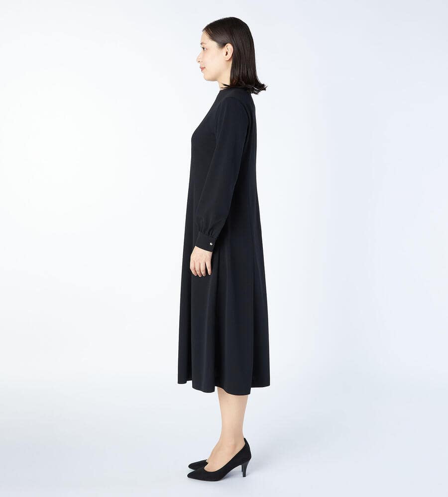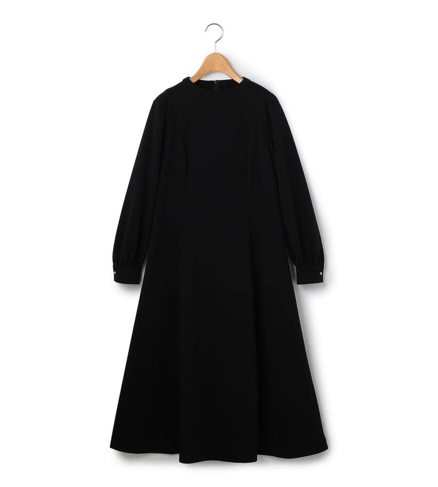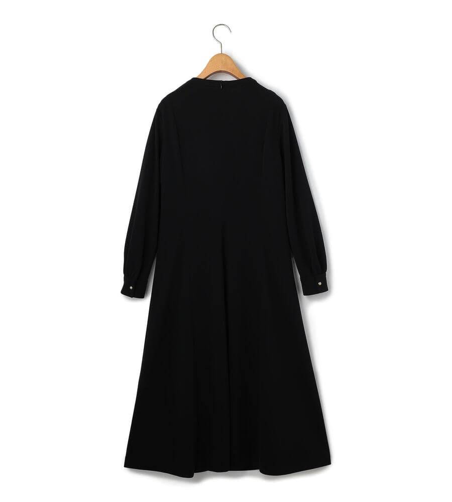 クラシカルなムードのミディ丈長袖ワンピース。高級感と上品さが魅力のジョーゼット生地で仕立てた一枚。シルバーのカフスボタンがさりげないアクセントのシンプルシックなデザイン。ドレープ感のあるスカートがエレガントでフェミニンなシルエット。パーティーやオケージョンシーンに映えるアイテムです。