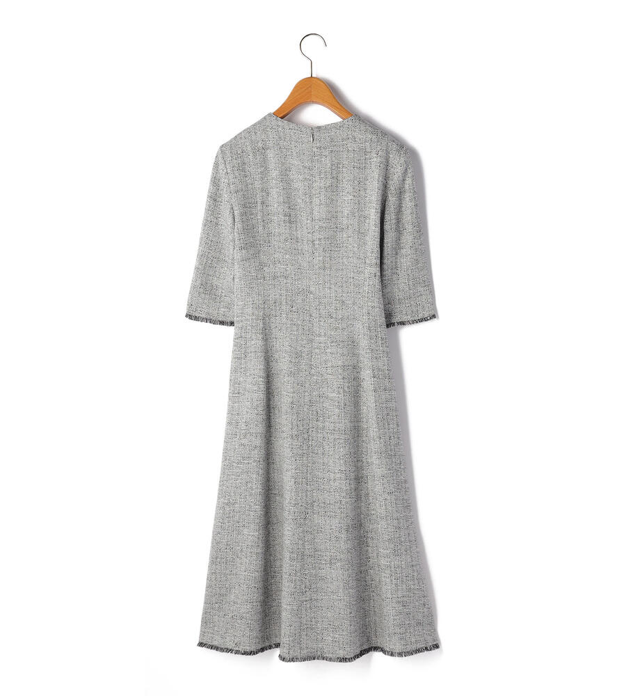 袖口と裾にほどこしたショートフリンジがアクセントになったスプリングツィードワンピース。裾に向かって広がるフィット&フレアシルエットが美しく、しなやかでエレガントなスタイルが完成。同素材のノーカラージャケットを合わせたセットアップコーディネートも素敵です。
