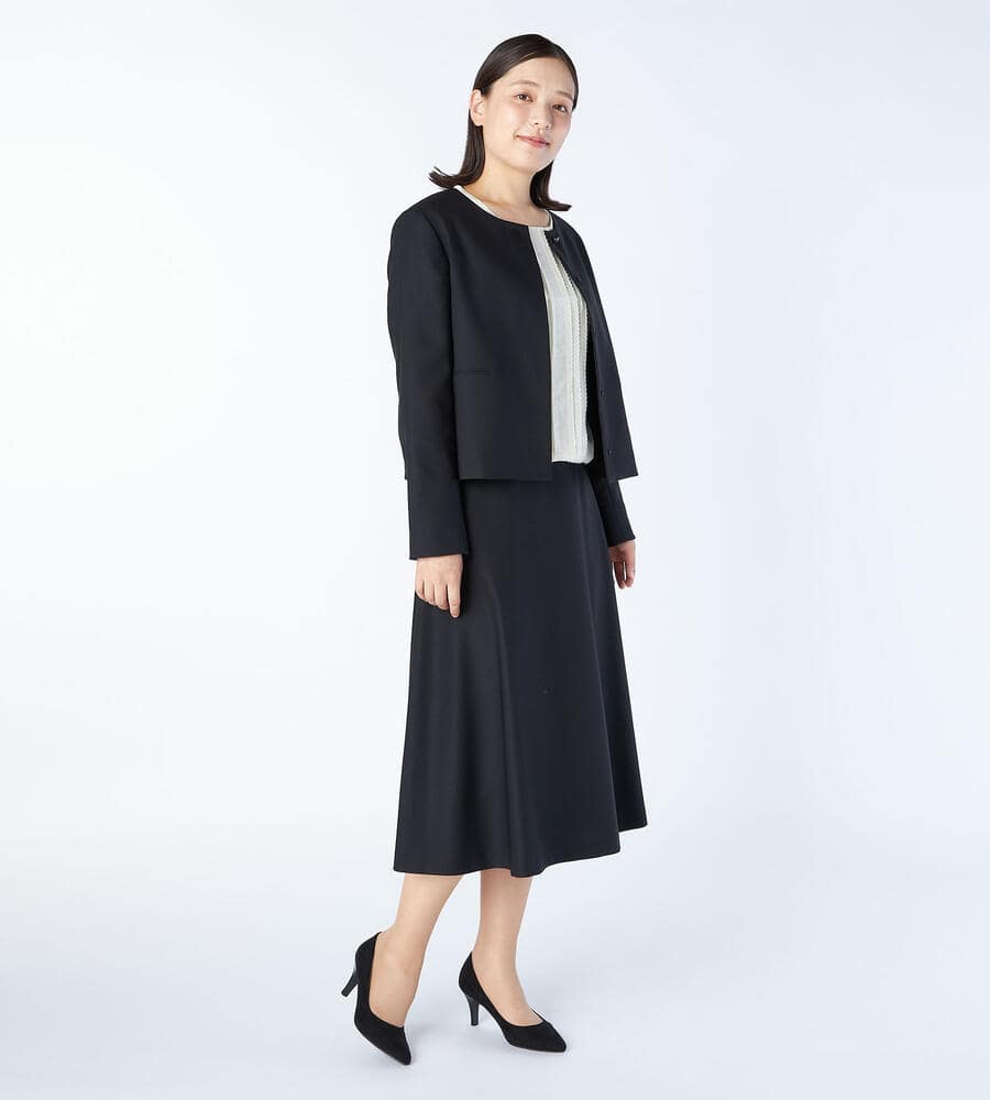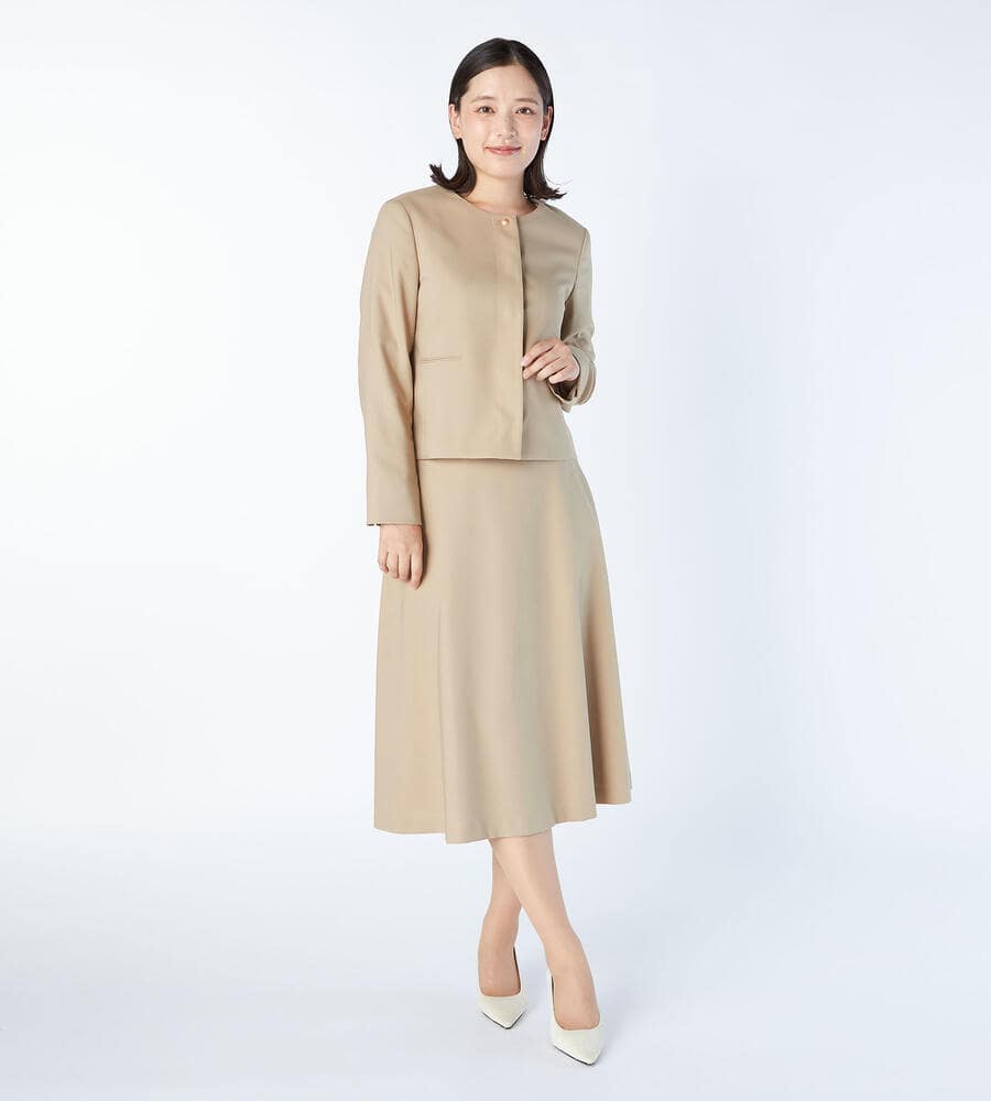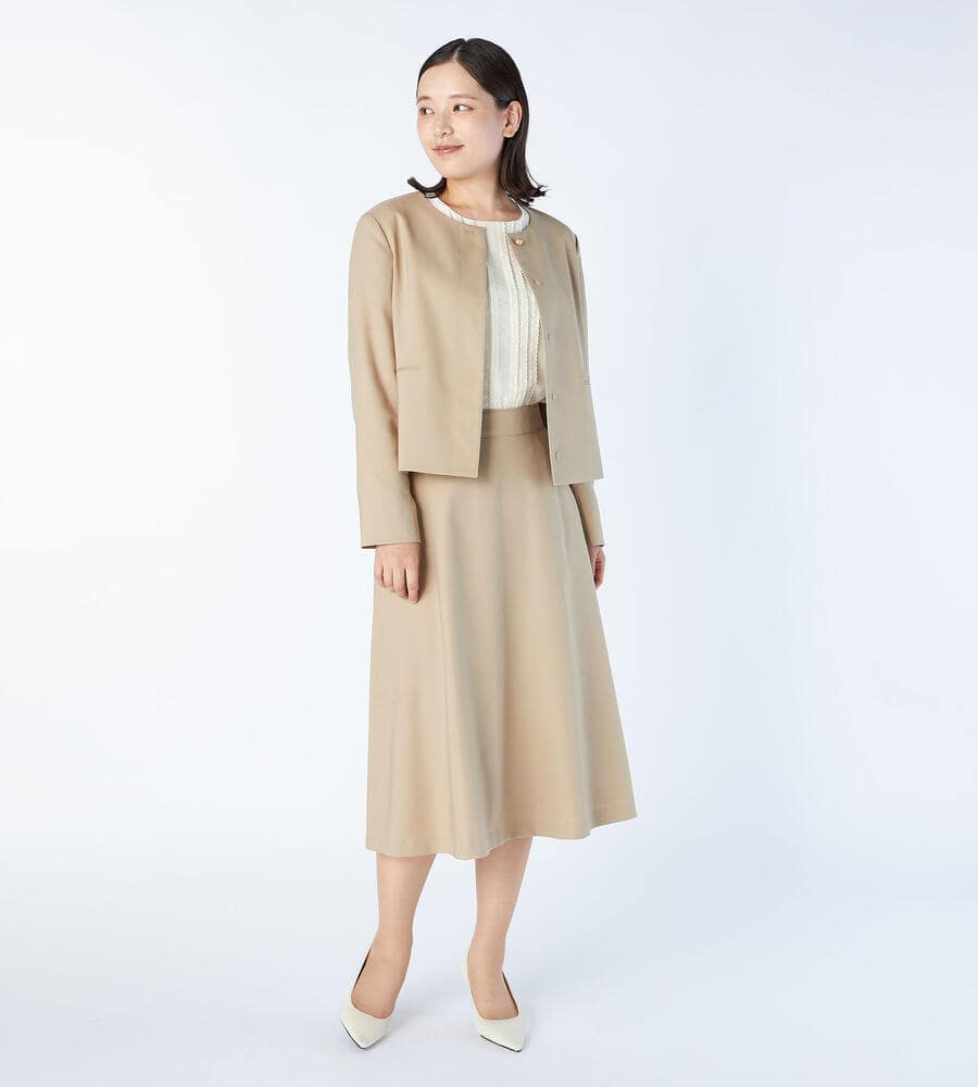 シンプルなデザインと美しいシルエットから大人の余裕を感じるフレアスカート。シューズと合わせた際のバランスを大切に、膝下をキレイに見せる着丈にこだわり仕上げました。サイドファスナー仕様、フロントウエストにはステッチ入り。同素材のジャケットとセットアップで着こなせるアイテムです。