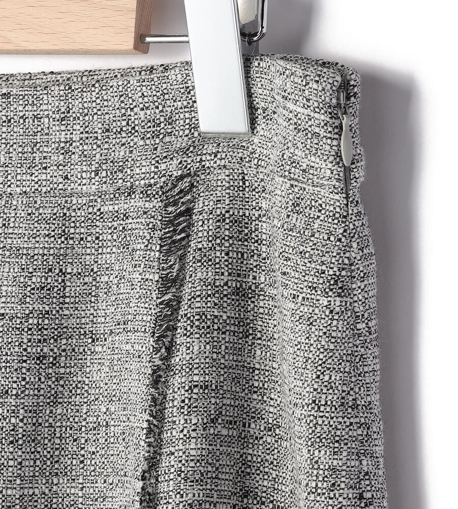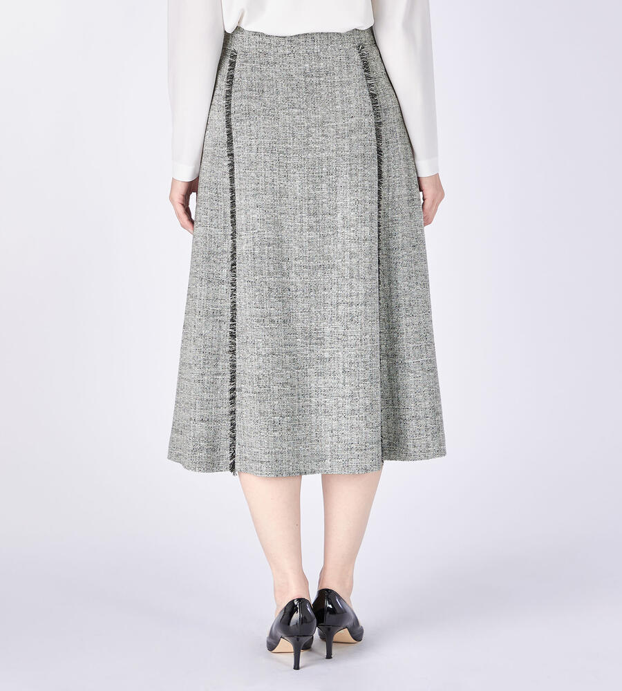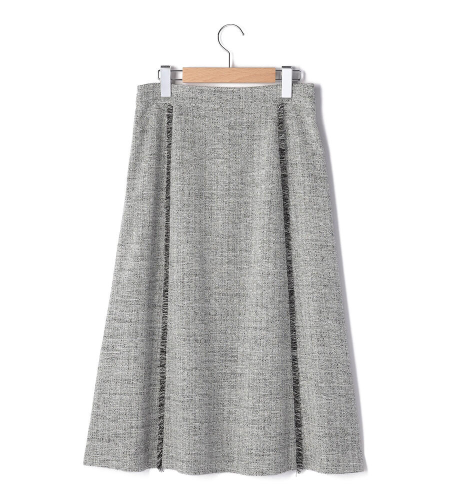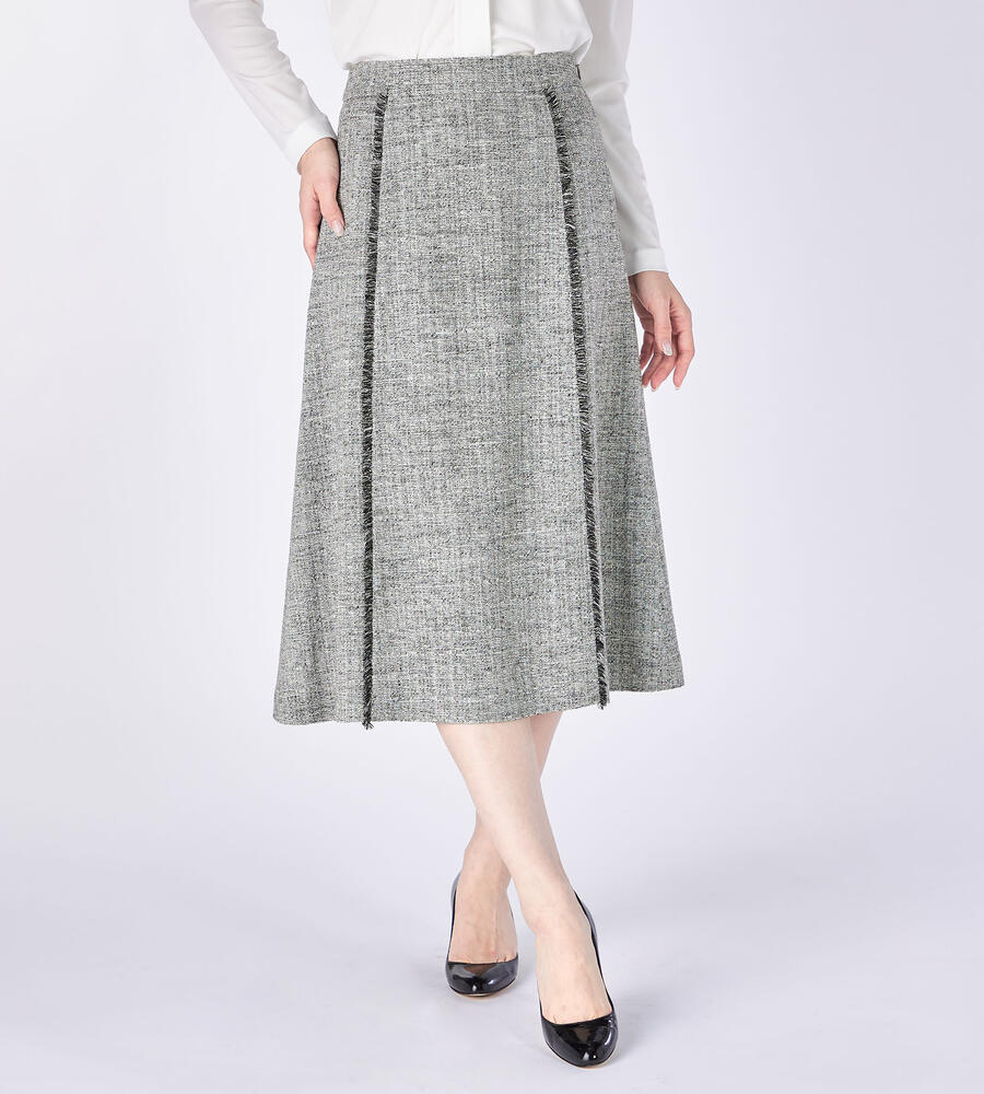 切り替え部分にほどこしたショートフリンジがアクセントになったスプリングツィードスカート。膝下を美しく見せてくれる丈感、裾に向かって緩やかに広がるAラインシルエットがエレガントな印象に。サイドファスナー仕様。同素材のノーカラージャケットと合わせたセットアップスタイルもおすすめです。