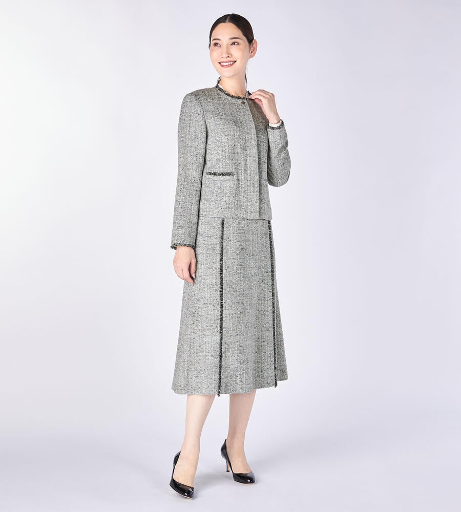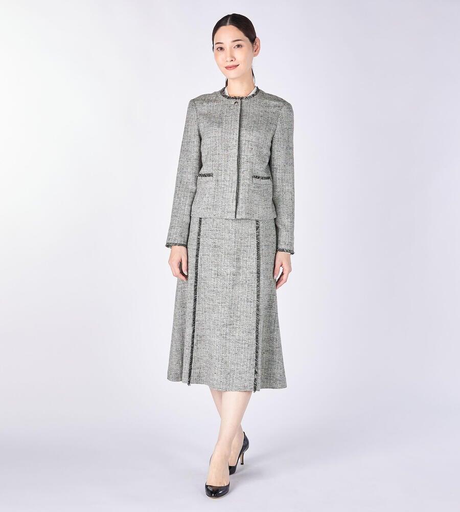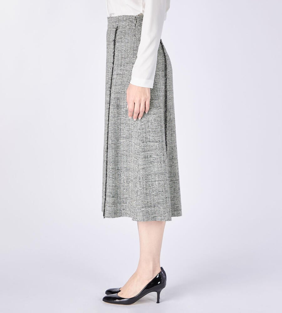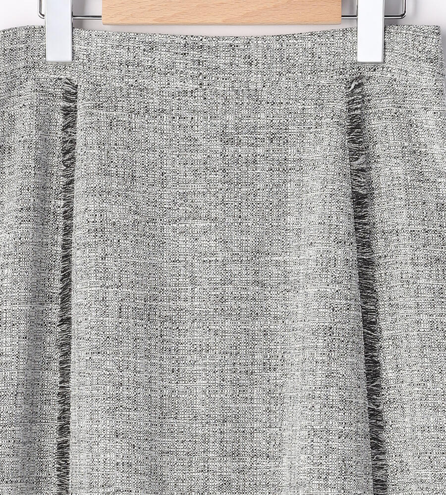 切り替え部分にほどこしたショートフリンジがアクセントになったスプリングツィードスカート。膝下を美しく見せてくれる丈感、裾に向かって緩やかに広がるAラインシルエットがエレガントな印象に。サイドファスナー仕様。同素材のノーカラージャケットと合わせたセットアップスタイルもおすすめです。