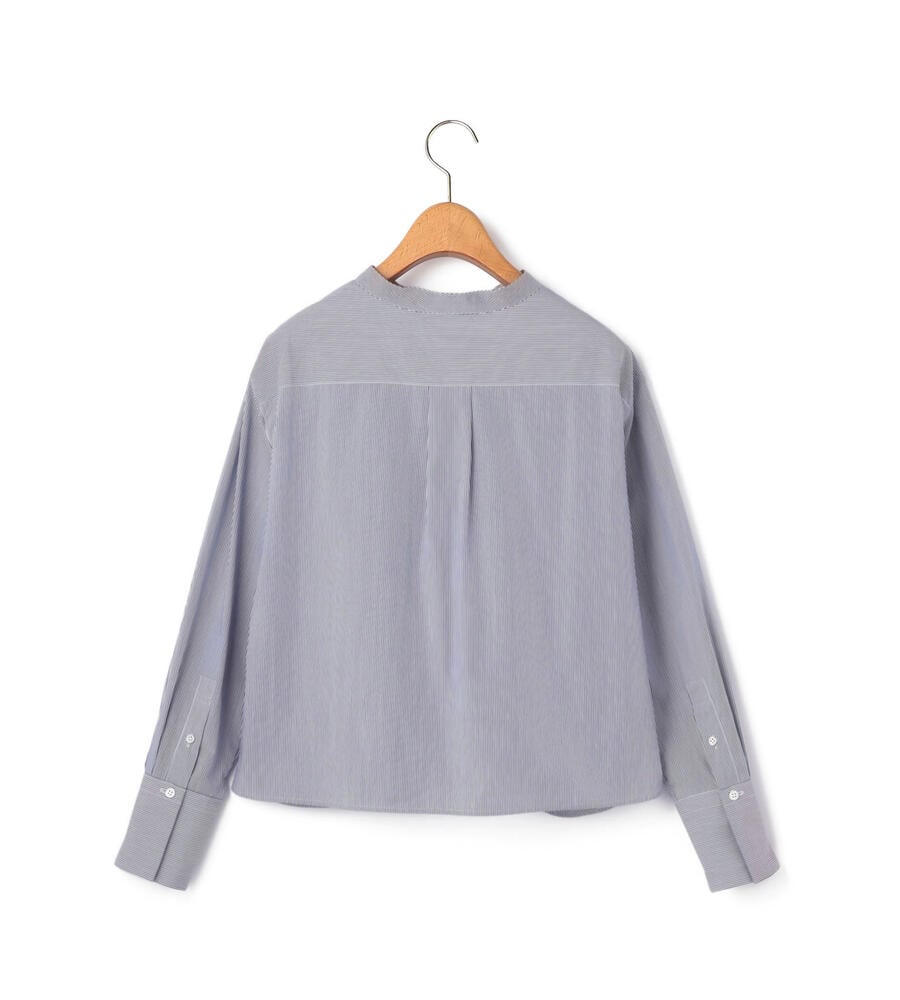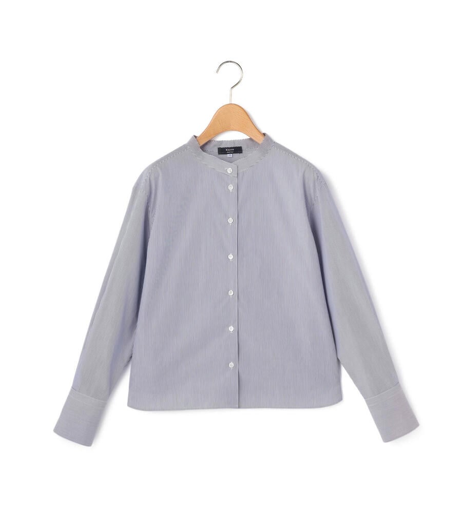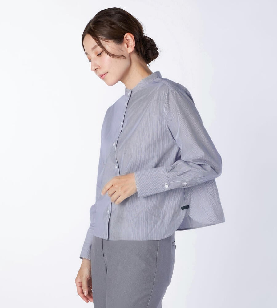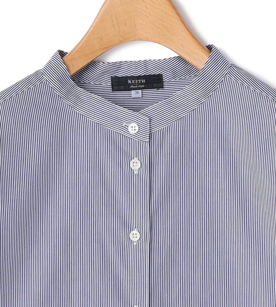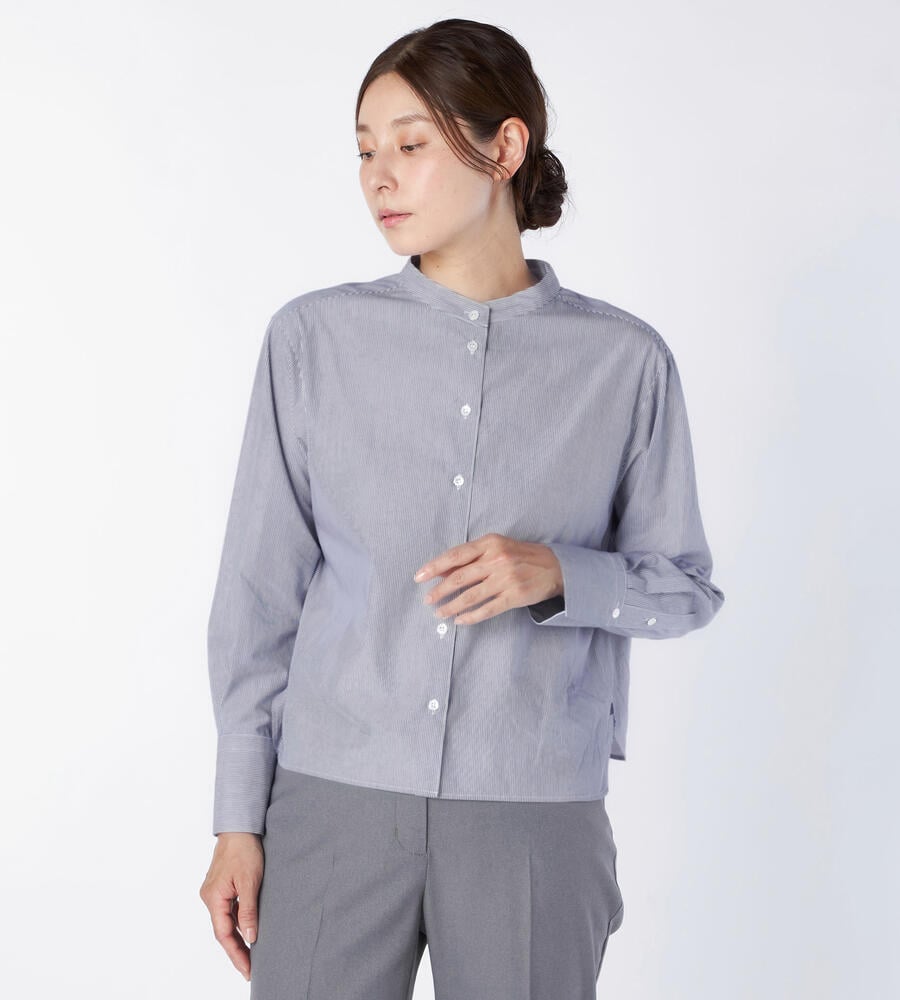 細ストライプ柄をあしらった綿100%素材の長袖シャツです。すっきりしたバンドカラーと軽やかな着丈がデザインのポイント。チェック柄のガゼットもさりげなく目をひきます。様々なボトムとバランスが取りやすいため、旬のワイドパンツやロングスカートに合わせたり、ワンピースの羽織りとしても着用できます。
