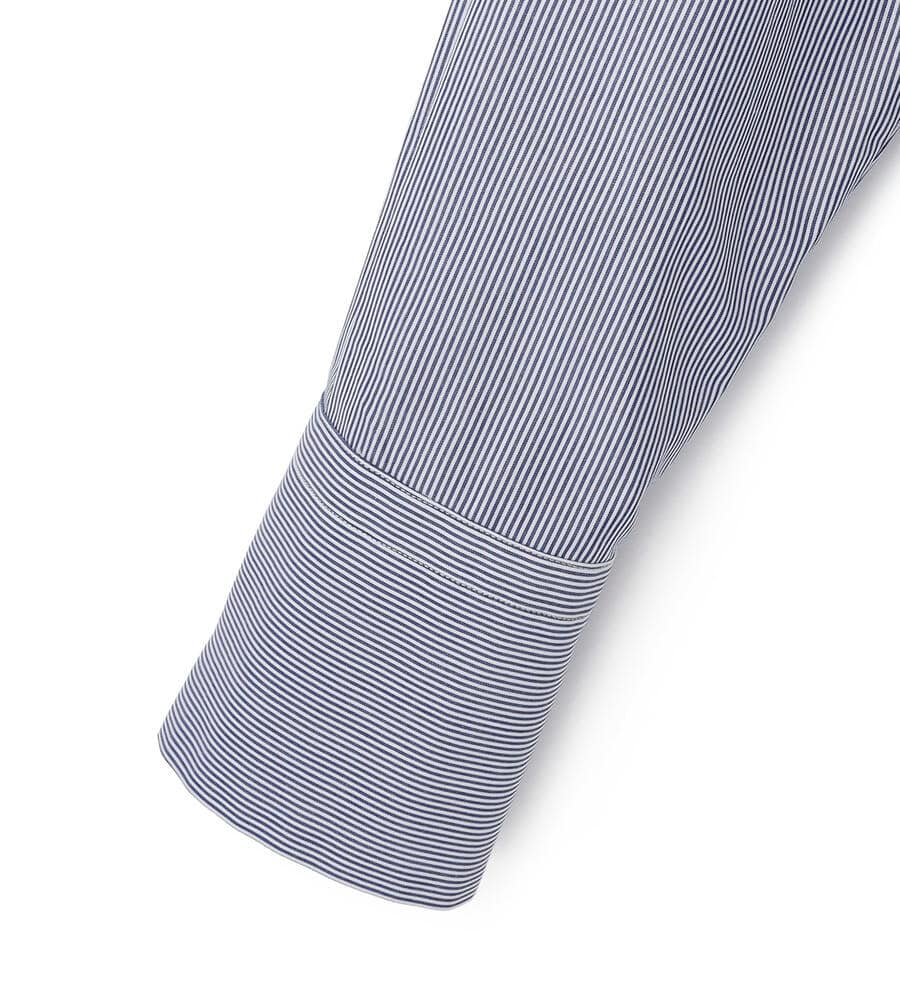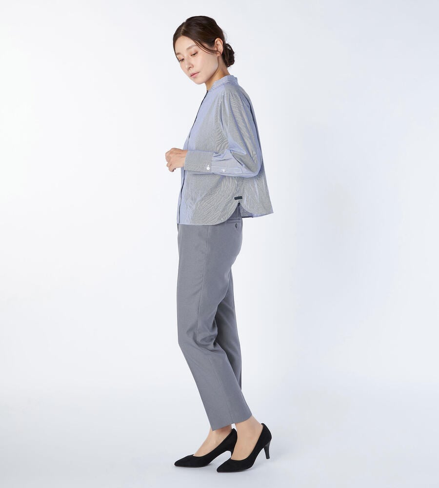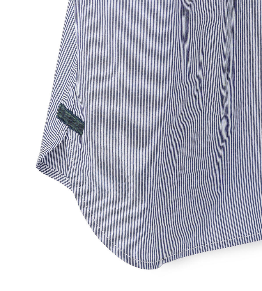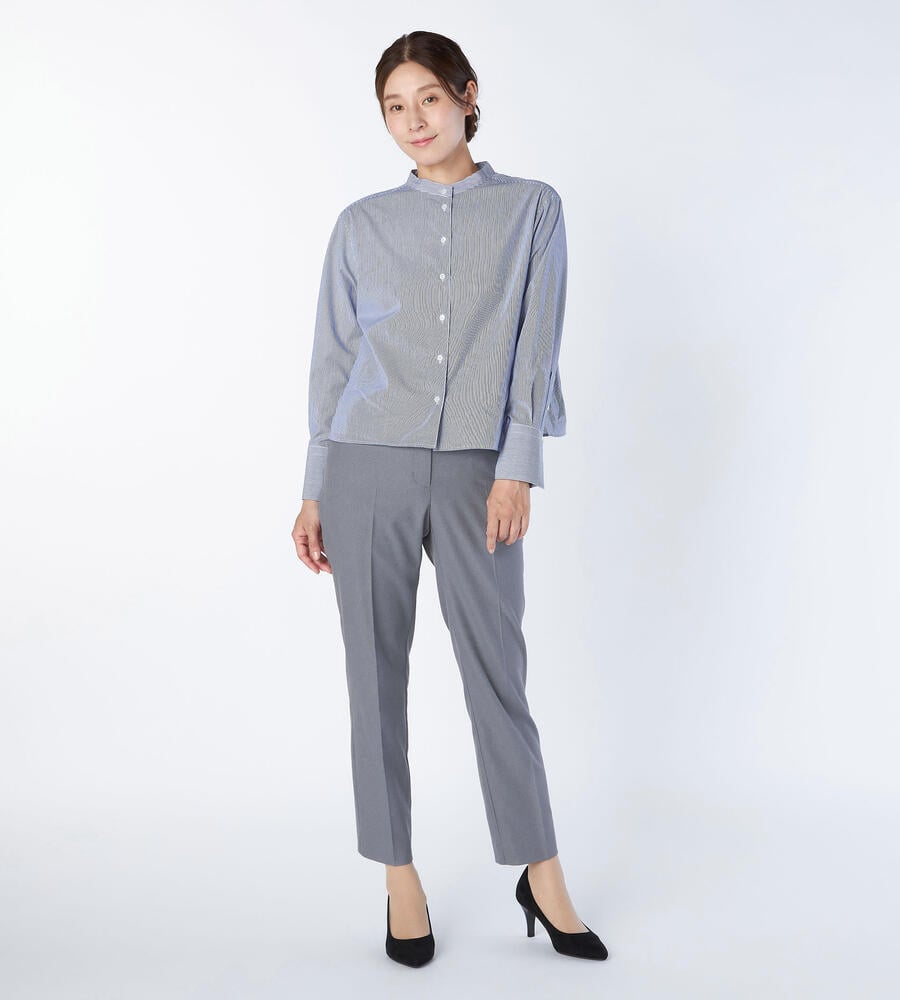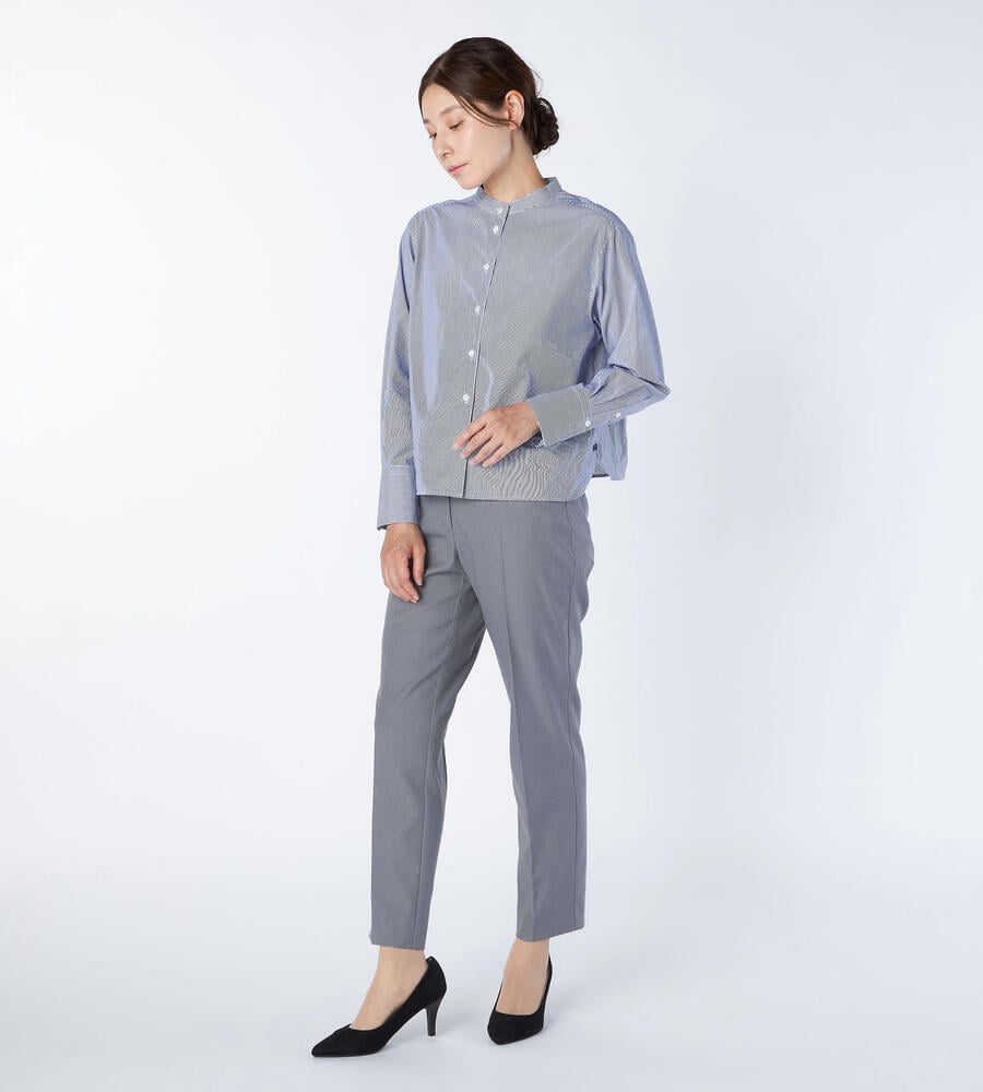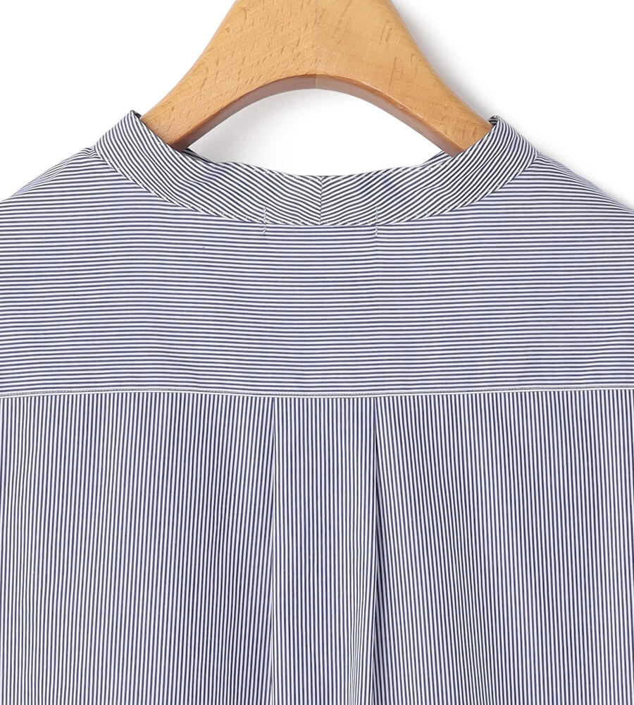 細ストライプ柄をあしらった綿100%素材の長袖シャツです。すっきりしたバンドカラーと軽やかな着丈がデザインのポイント。チェック柄のガゼットもさりげなく目をひきます。様々なボトムとバランスが取りやすいため、旬のワイドパンツやロングスカートに合わせたり、ワンピースの羽織りとしても着用できます。