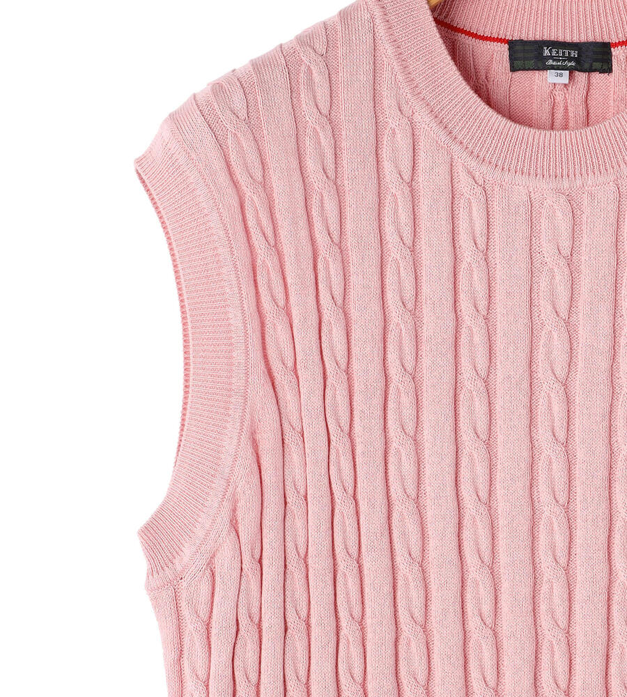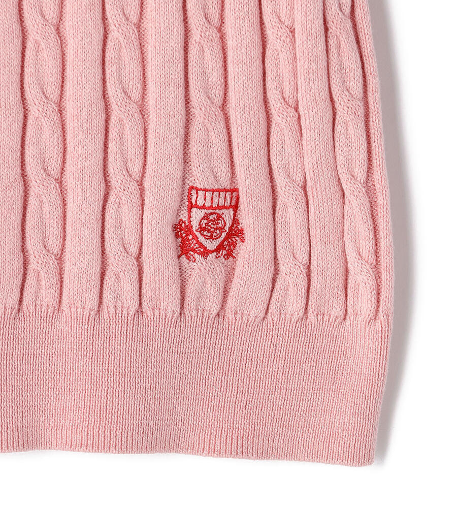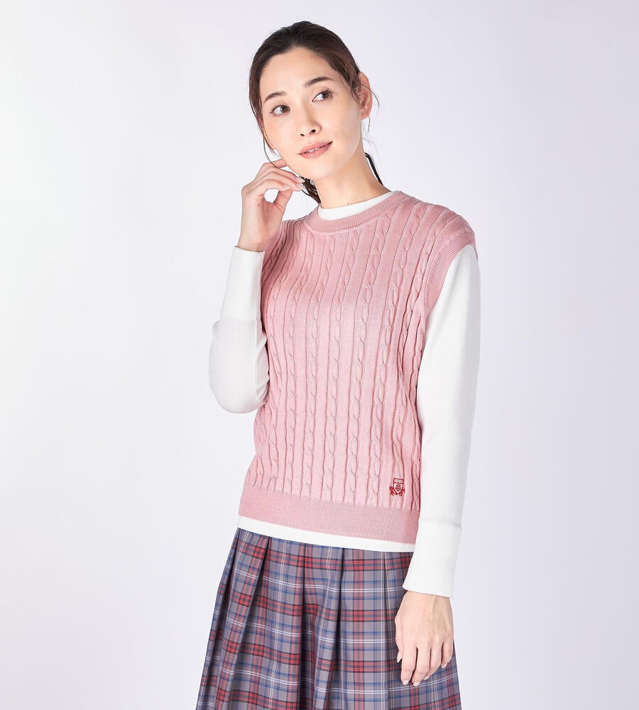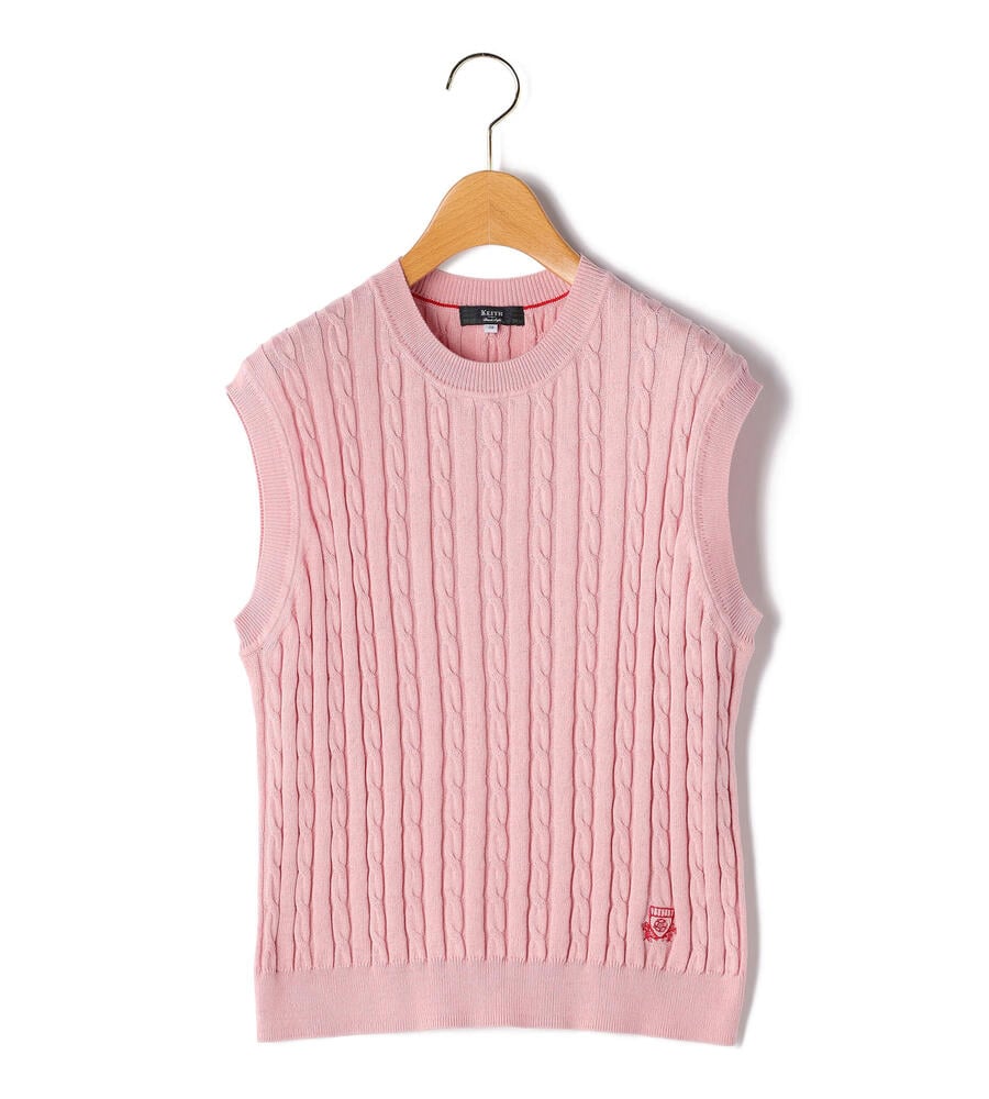 表面感のあるケーブル編みがおしゃれなデザインのニットベスト。密度の高いハイゲージで編まれた気品のある生地感が特徴です。左裾にあしらわれたブランドロゴエンブレムのカラー刺繍がさりげなくおしゃれなデザインアクセント。お手持ちのトップスにプラスして、おしゃれな重ね着コーディネートが完成するアイテムです。