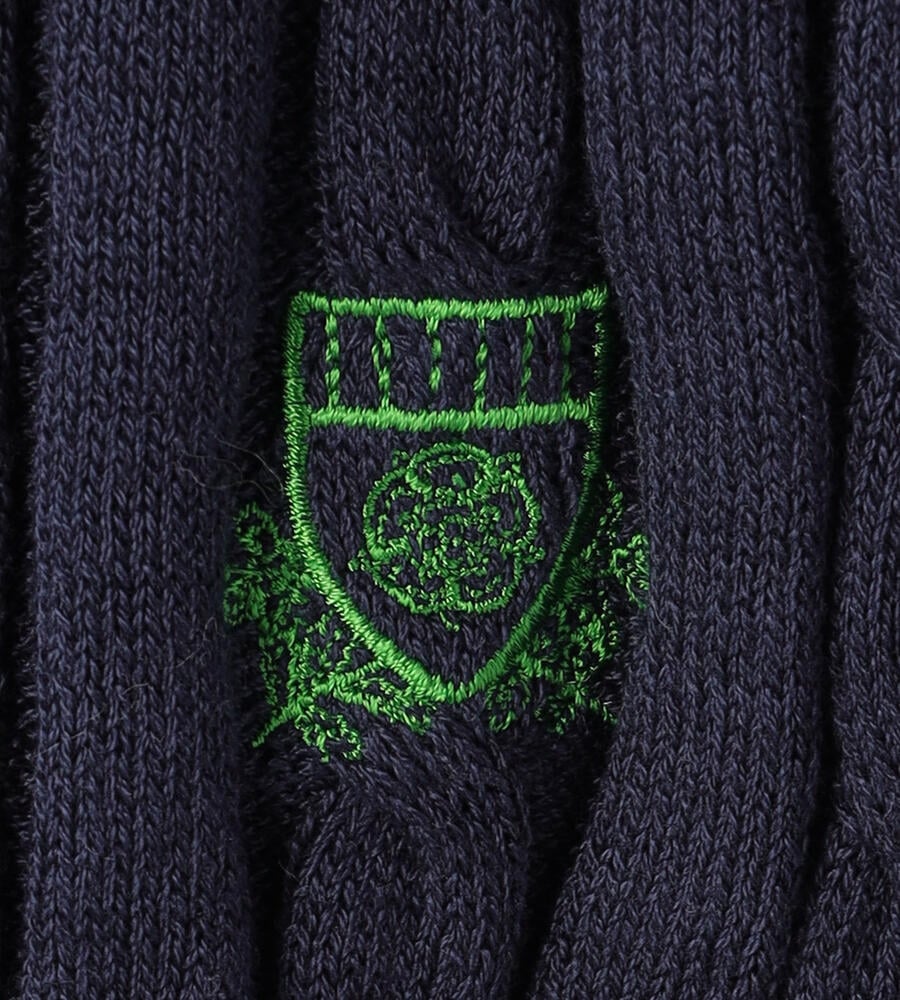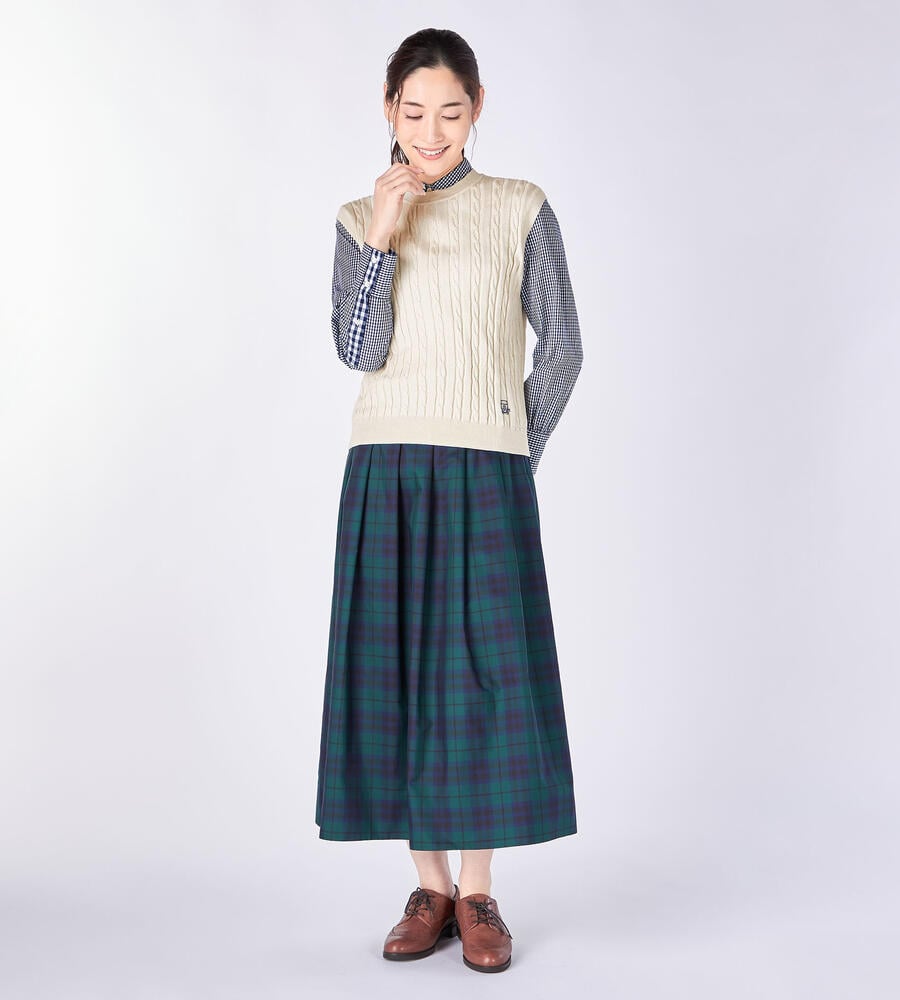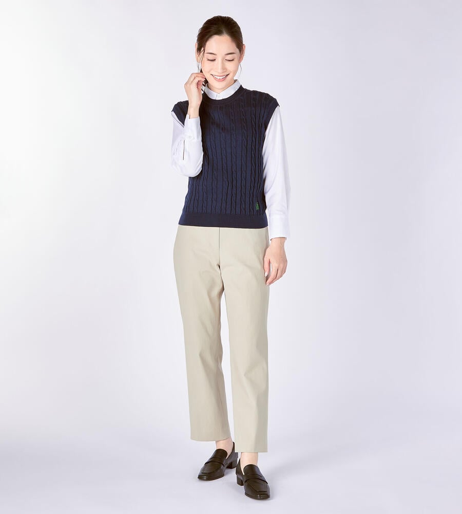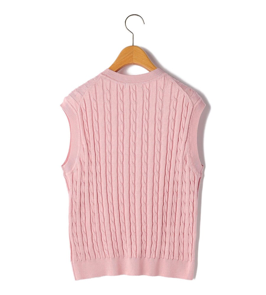 表面感のあるケーブル編みがおしゃれなデザインのニットベスト。密度の高いハイゲージで編まれた気品のある生地感が特徴です。左裾にあしらわれたブランドロゴエンブレムのカラー刺繍がさりげなくおしゃれなデザインアクセント。お手持ちのトップスにプラスして、おしゃれな重ね着コーディネートが完成するアイテムです。