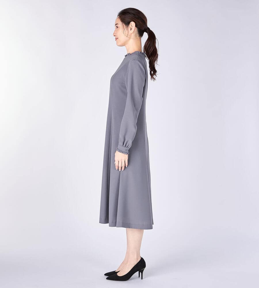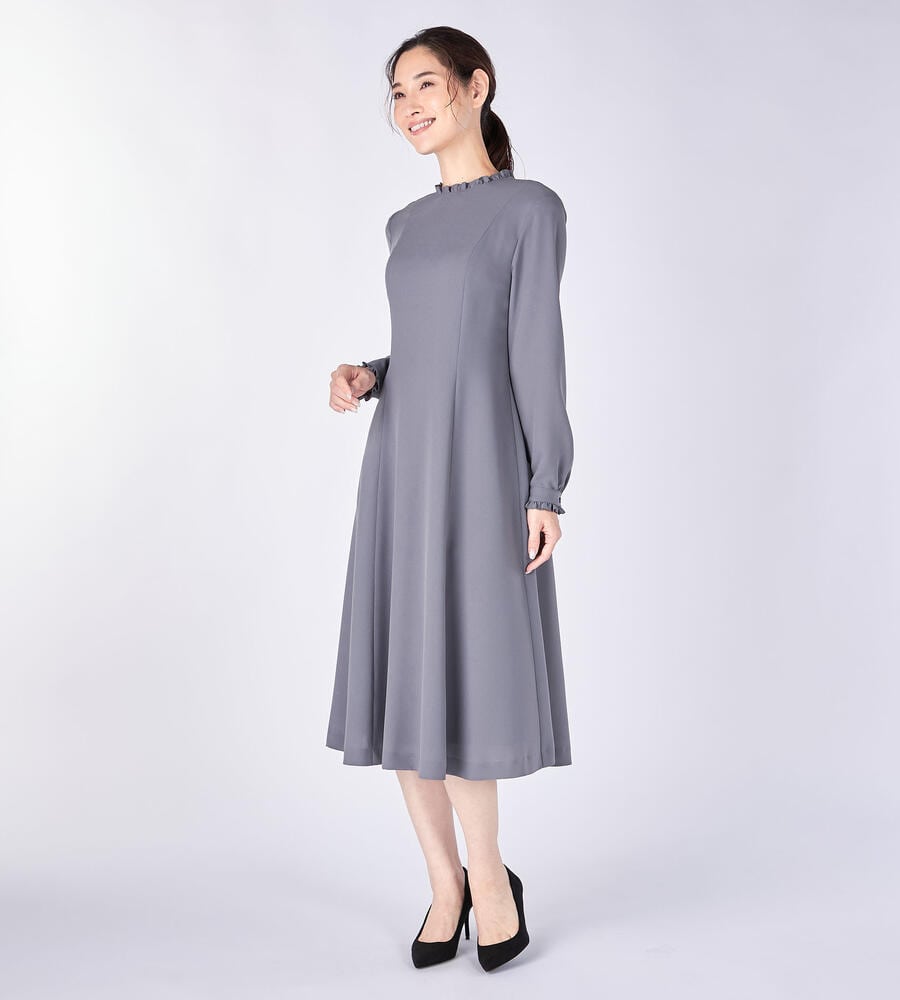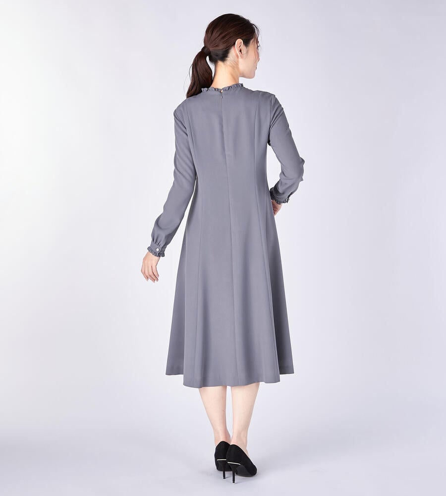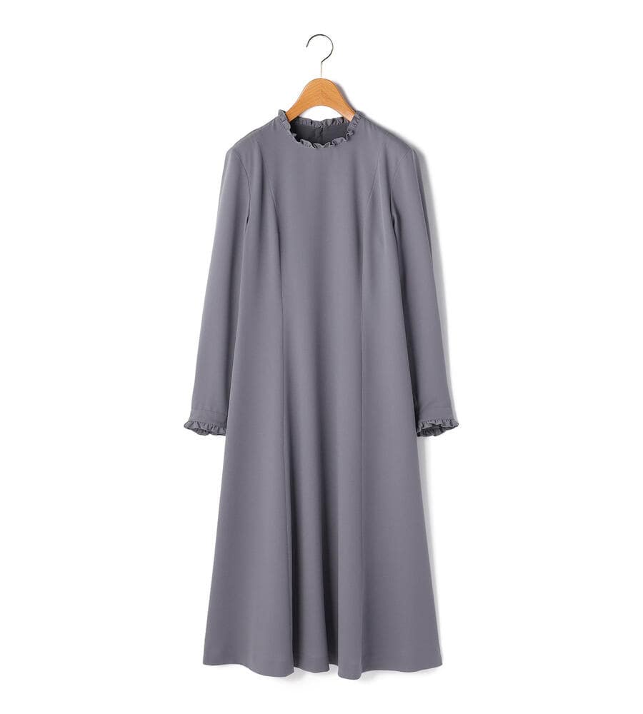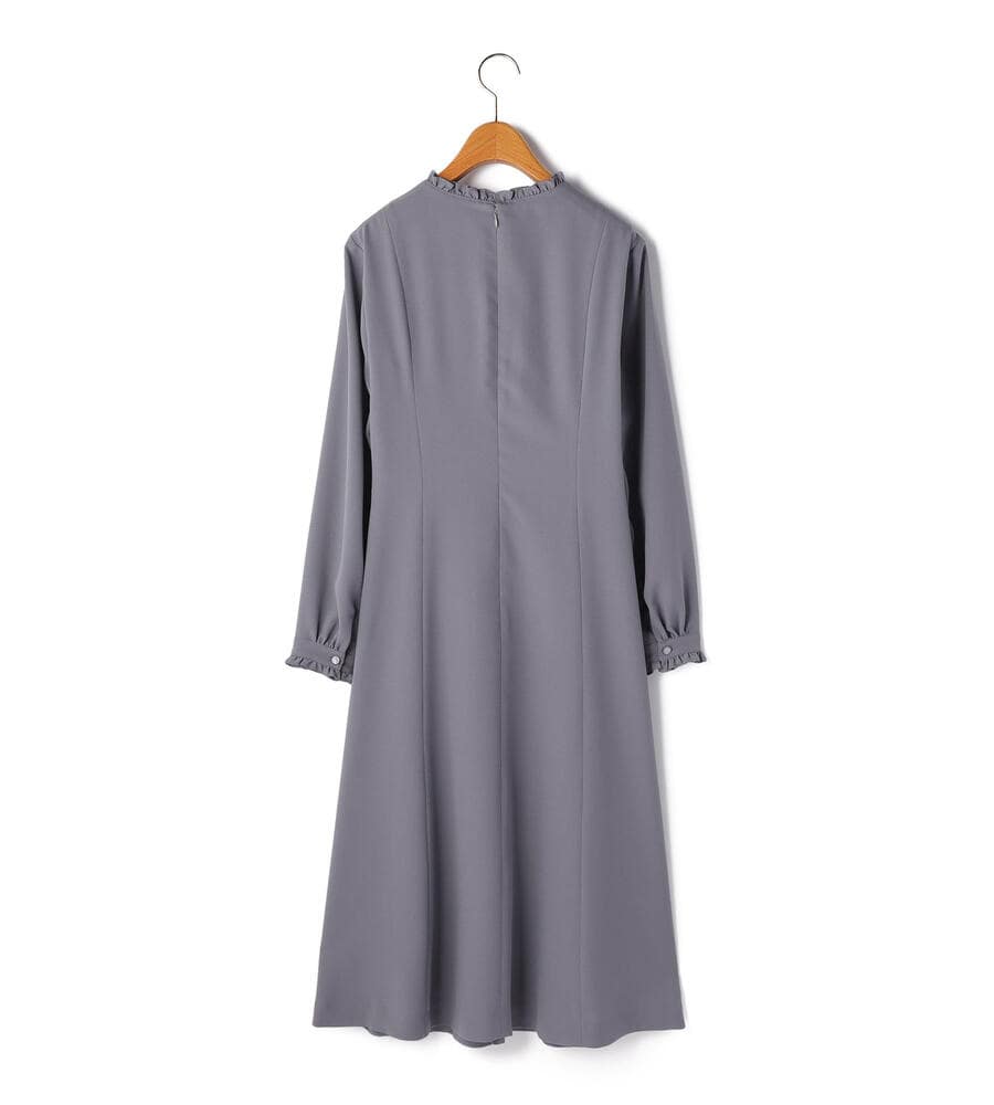 シフォンクレープ生地で仕立てた長袖ワンピース。首周りと袖口のフリルのあしらいがロマンチックなムード。立体感のある美しいシルエットと適度にドレープ感のある膝下丈スカートがフェミニンなデザイン。ブラウスのような袖のくるみボタンがエレガントなデザインポイント。一枚でお出かけスタイリングが実現します。