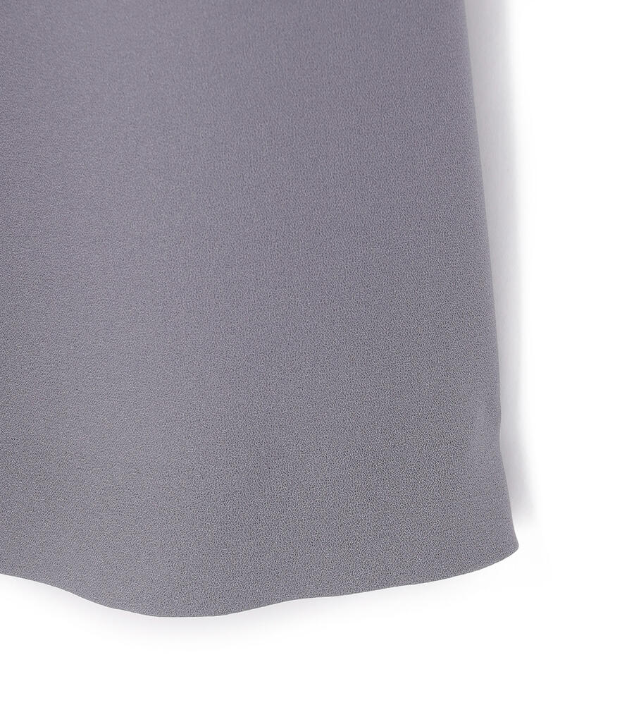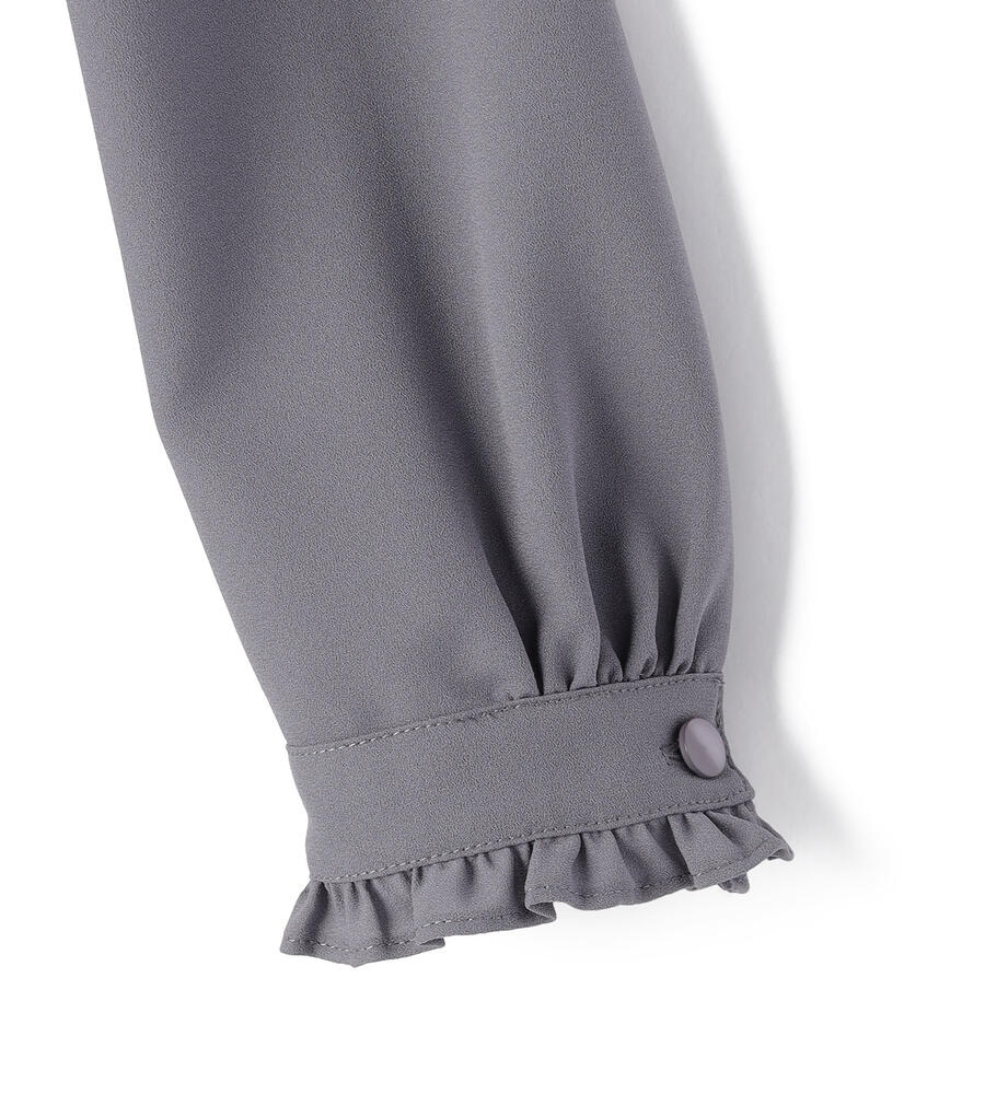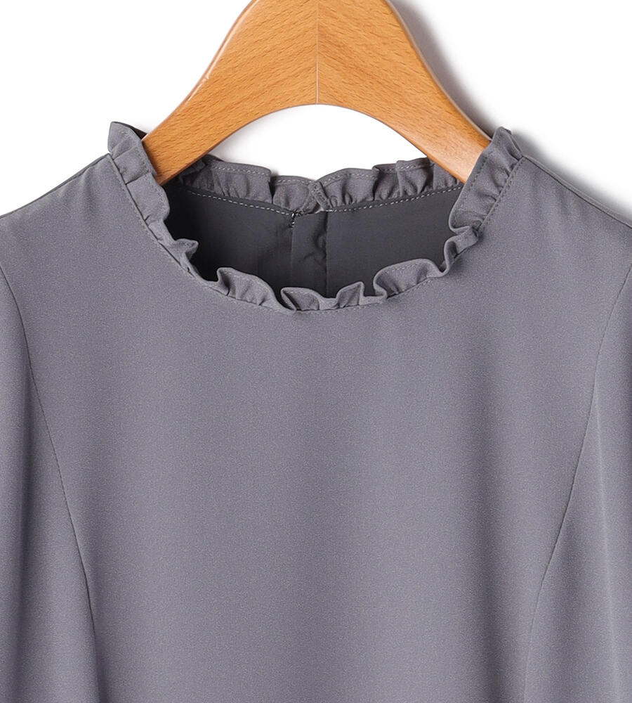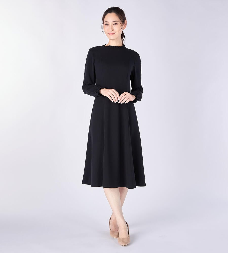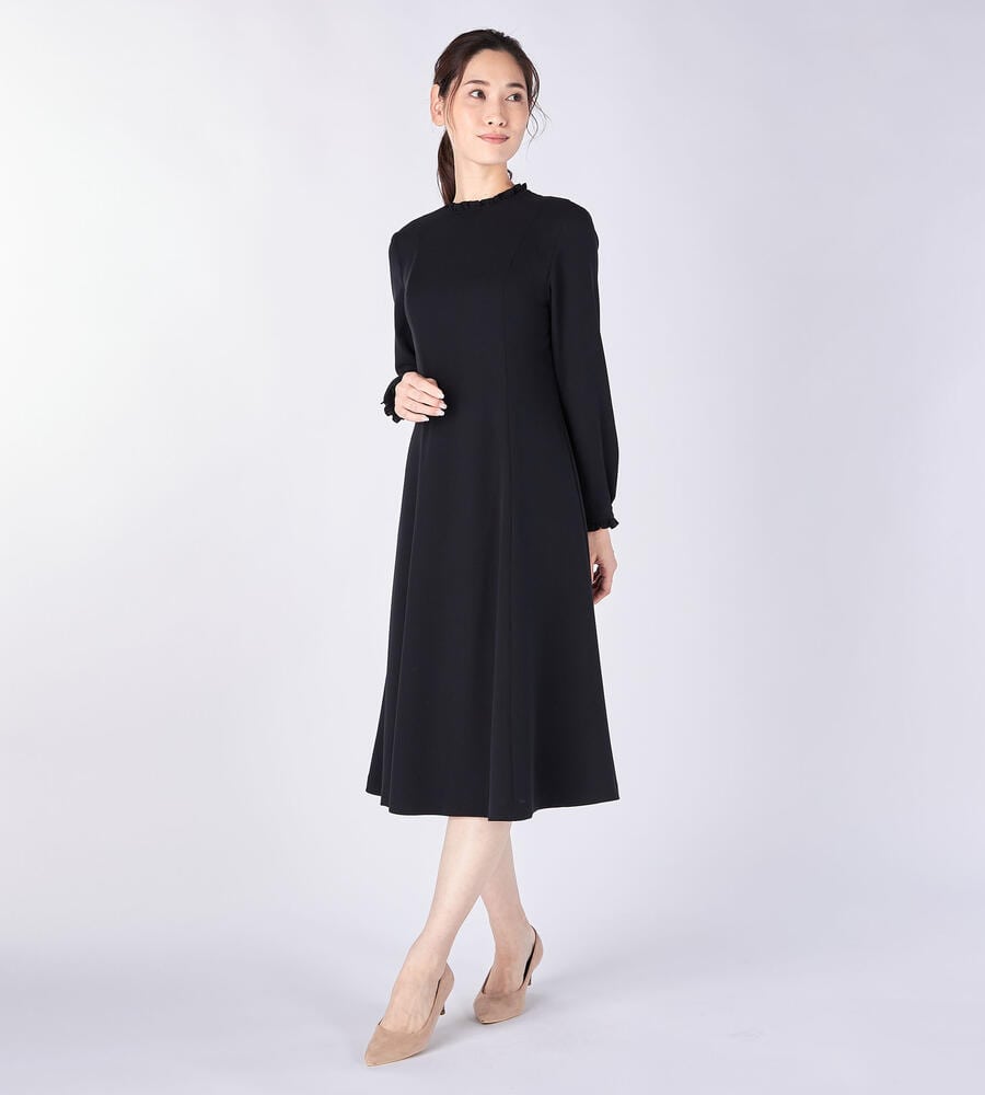 シフォンクレープ生地で仕立てた長袖ワンピース。首周りと袖口のフリルのあしらいがロマンチックなムード。立体感のある美しいシルエットと適度にドレープ感のある膝下丈スカートがフェミニンなデザイン。ブラウスのような袖のくるみボタンがエレガントなデザインポイント。一枚でお出かけスタイリングが実現します。