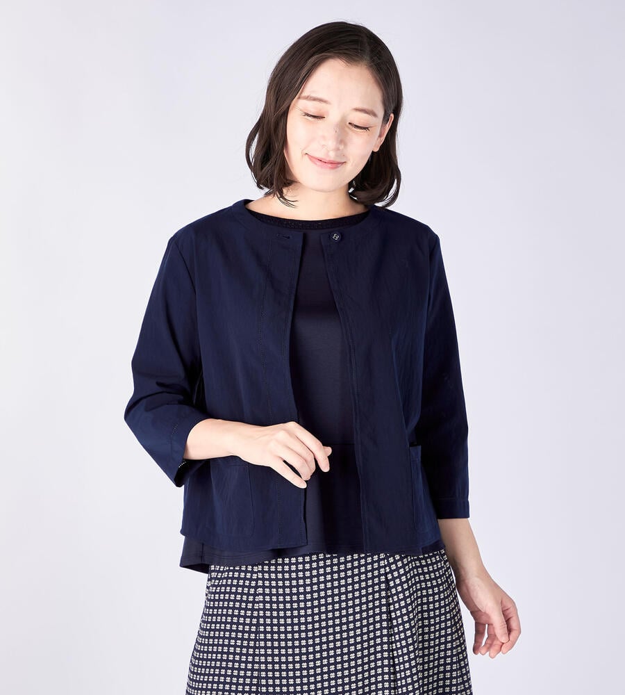 シンプルでありながらも洗練されたスタイルを叶えてくれるクールクロスジャケット。首もとの1つボタンがワンポイントになっており、袖先やポケットには透かしディテールが施されています。涼しげな素材感、手首の見える袖丈が軽やかさを演出してくれるアイテムです。