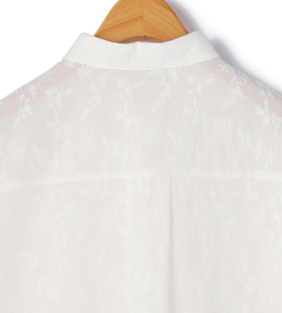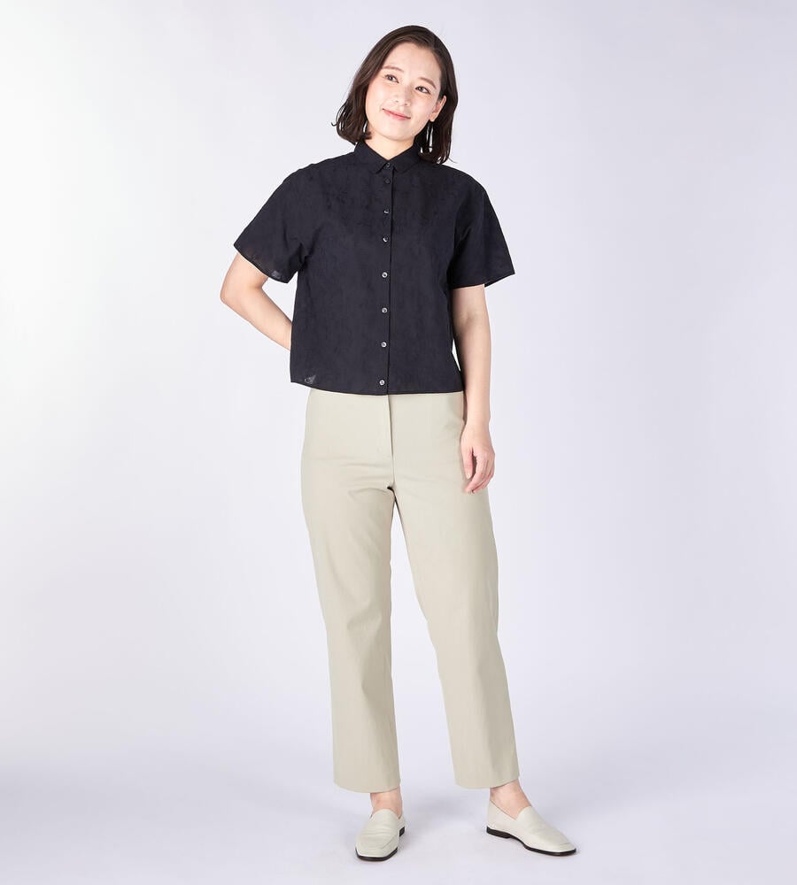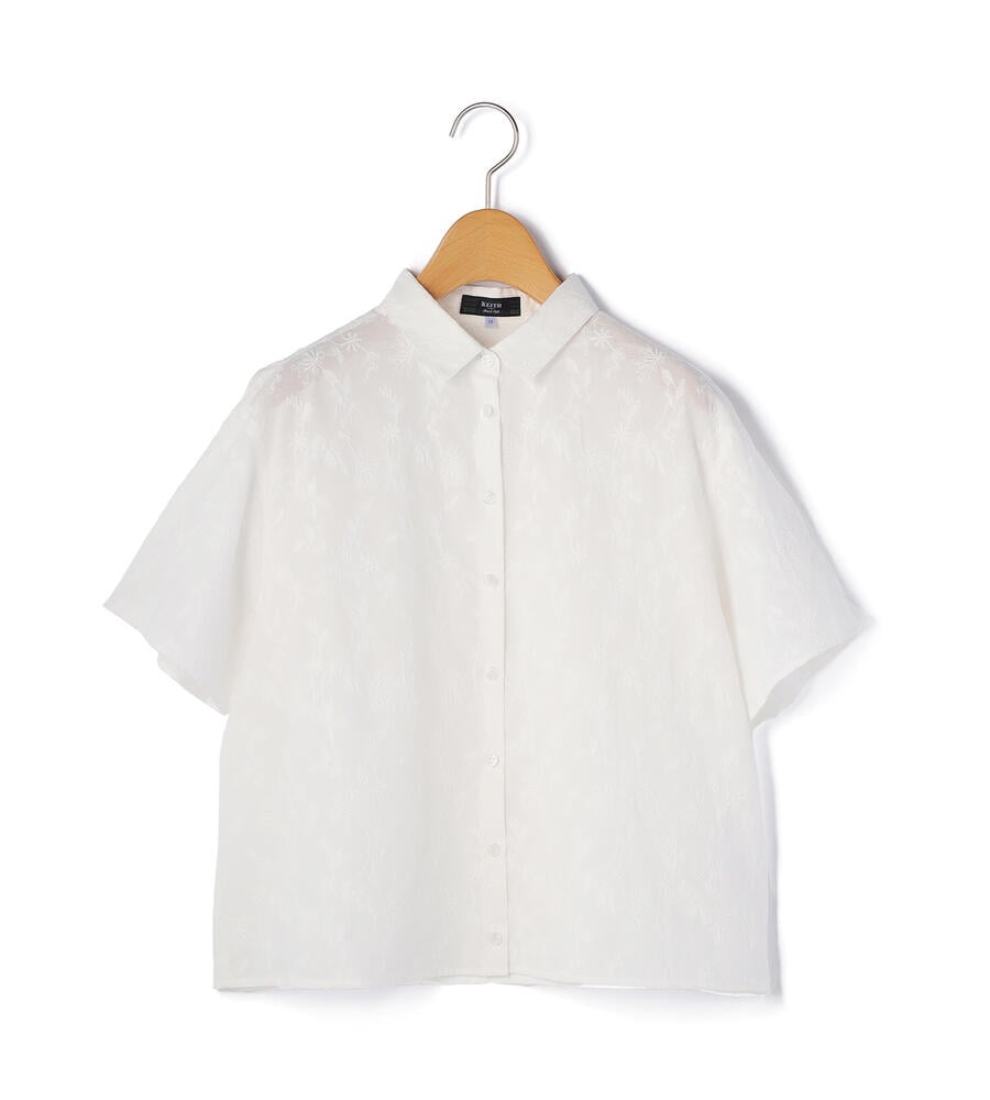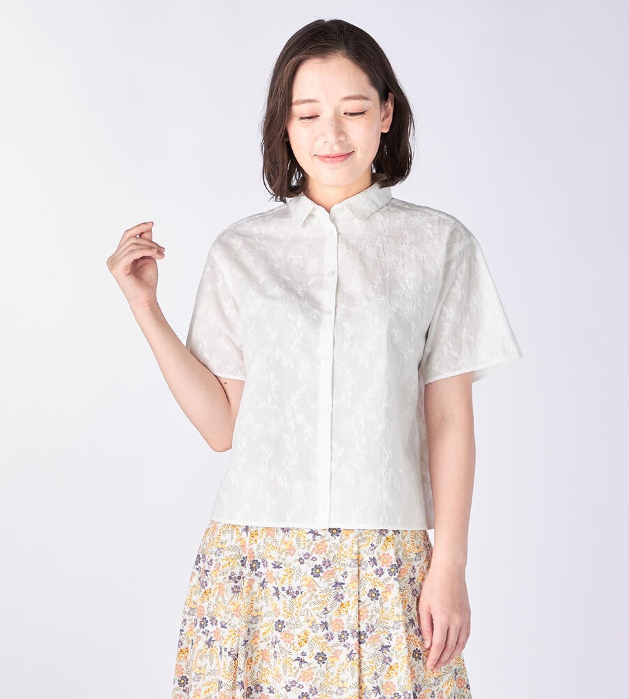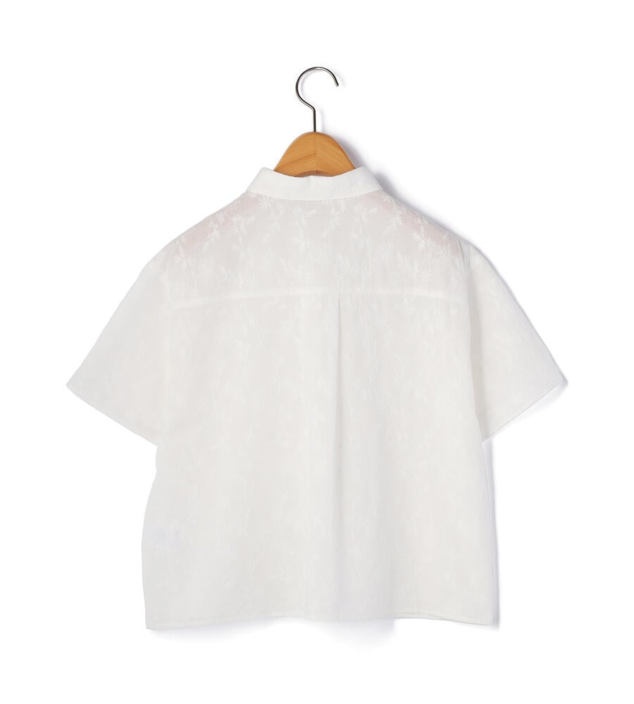 エレガントなムード満点のボタニカルモチーフのエンブロイダリー生地の半袖ブラウス。背中にタックを入れたゆとりのあるフィット感の今年らしいシルエット。コンパクトな着丈で様々なボトムとバランスよくマッチするアイテムです。春夏シーズンにぴったりなさわやかなお出かけスタイリングが実現するアイテムです。