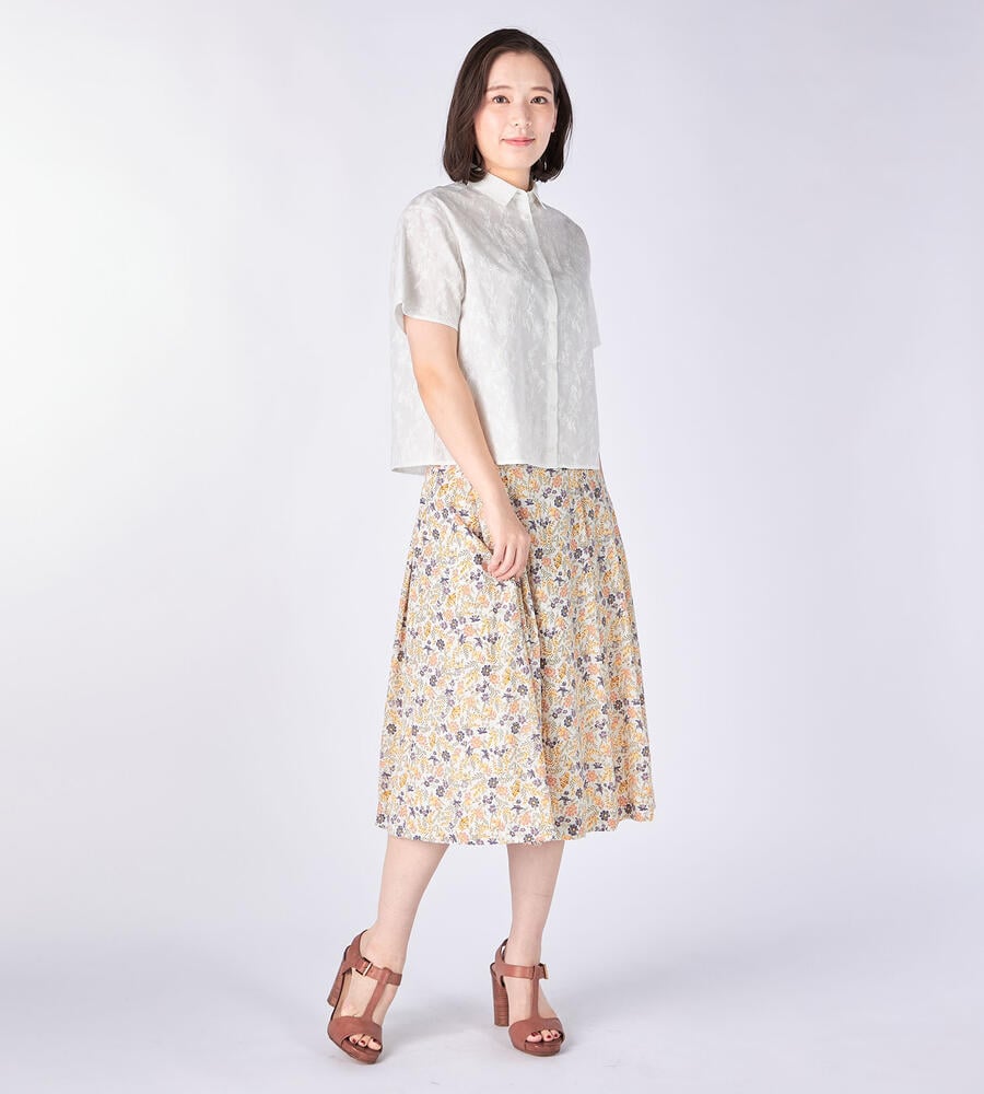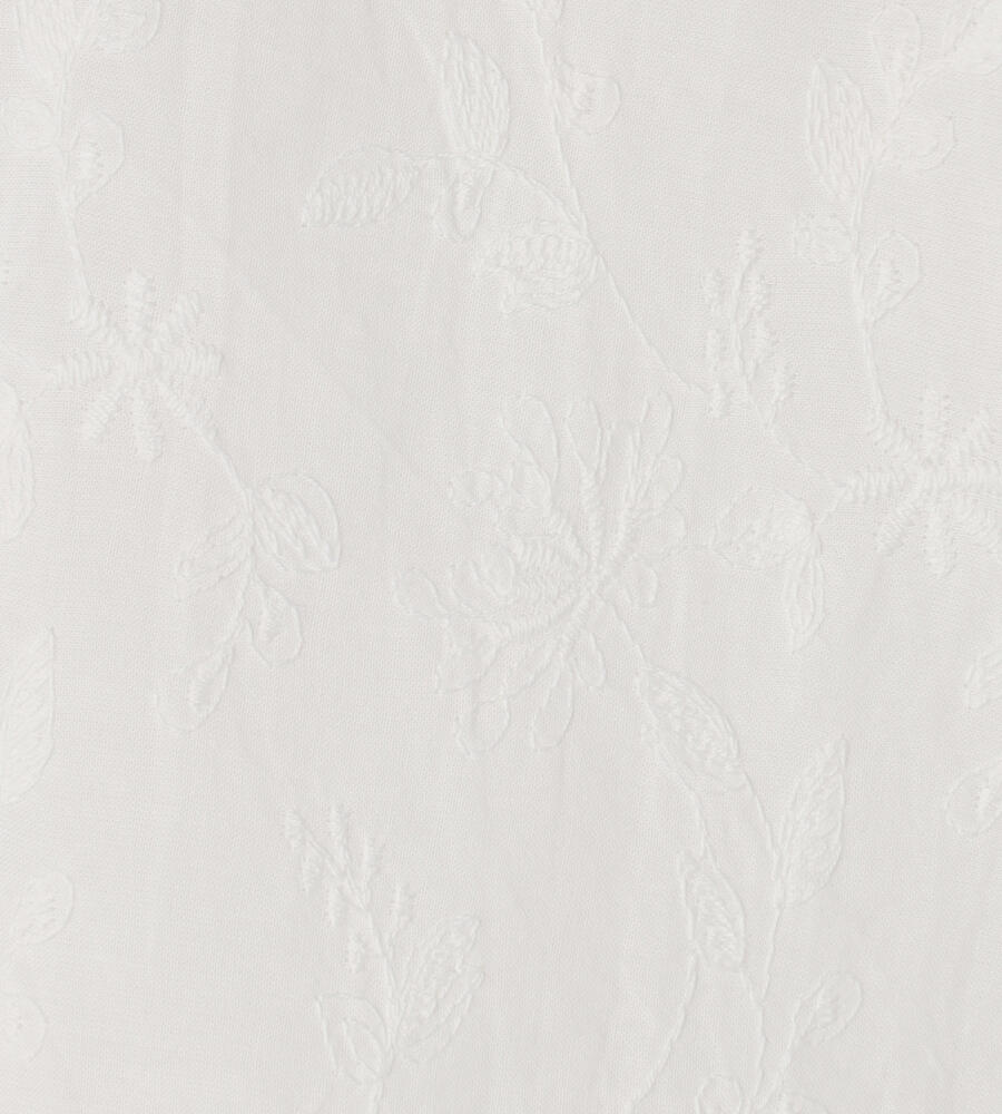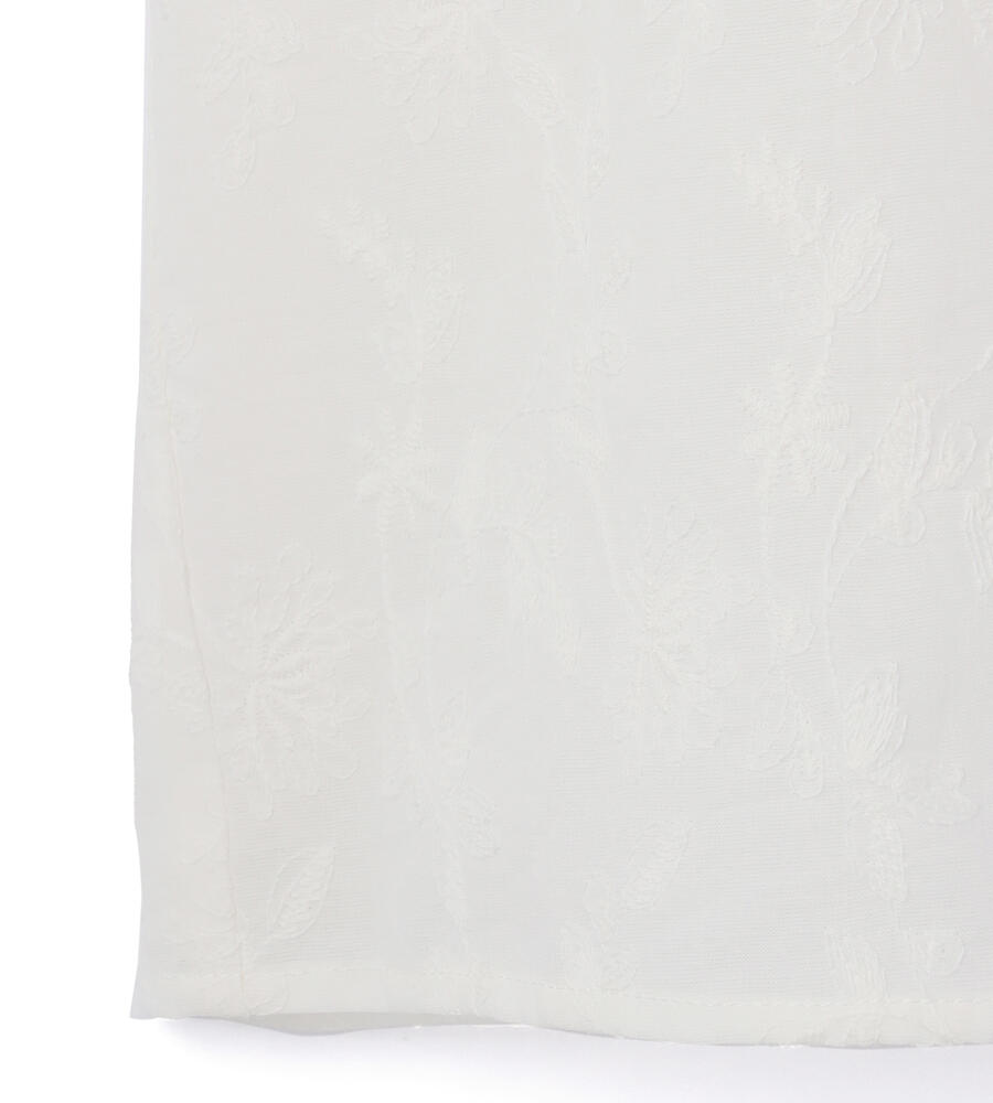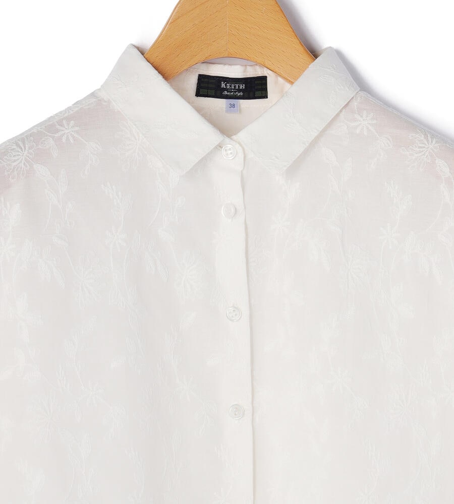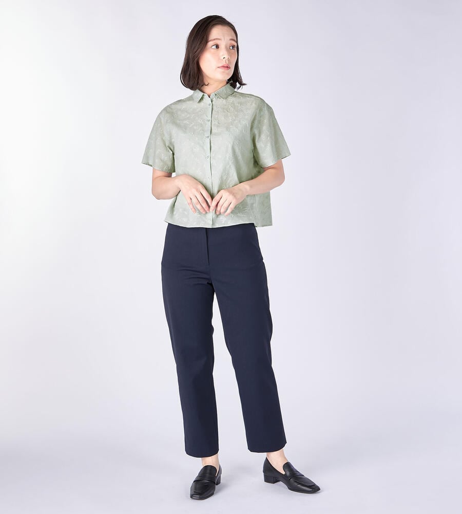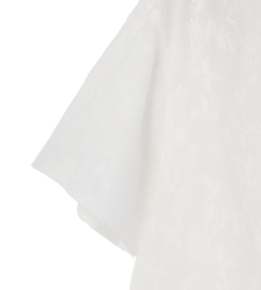 エレガントなムード満点のボタニカルモチーフのエンブロイダリー生地の半袖ブラウス。背中にタックを入れたゆとりのあるフィット感の今年らしいシルエット。コンパクトな着丈で様々なボトムとバランスよくマッチするアイテムです。春夏シーズンにぴったりなさわやかなお出かけスタイリングが実現するアイテムです。