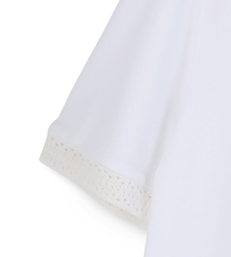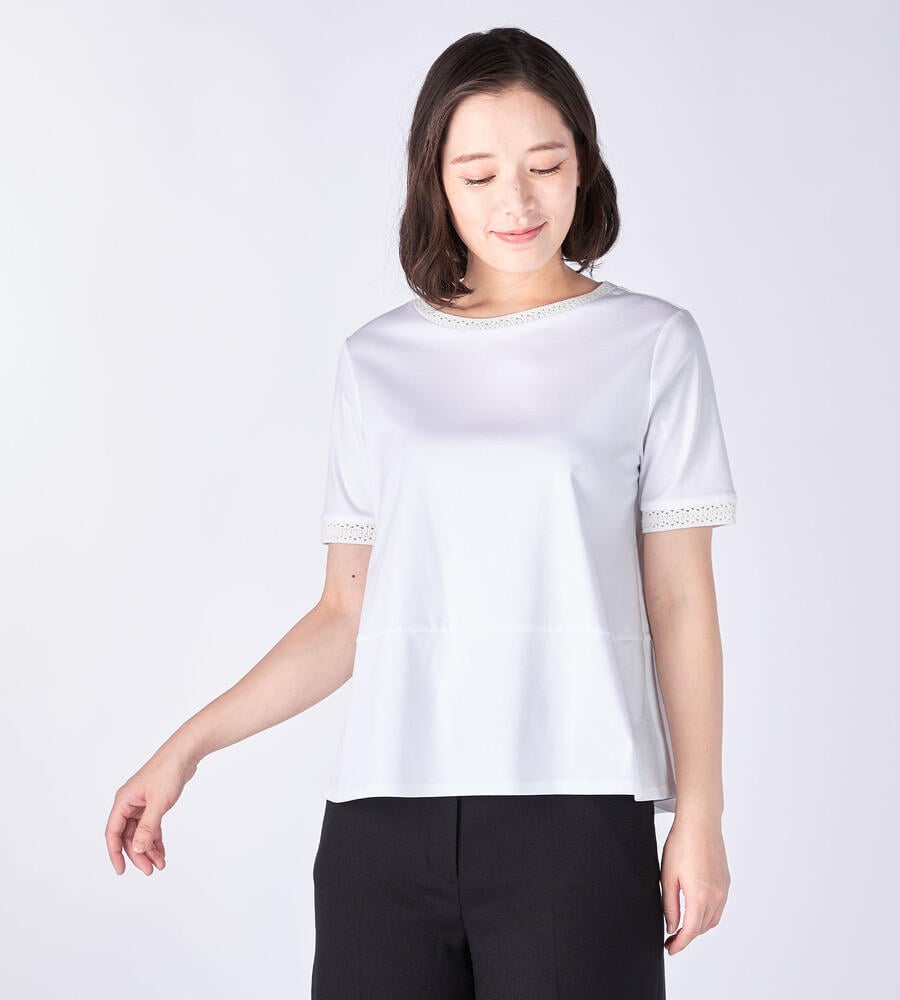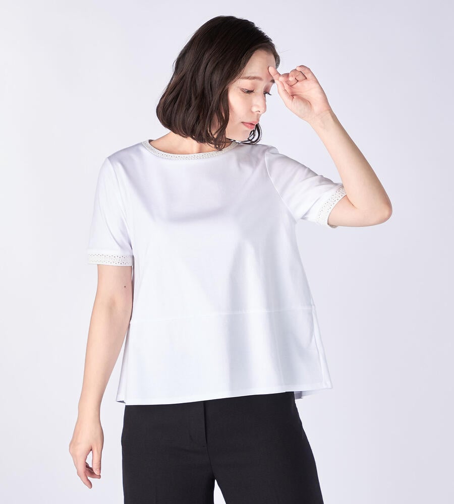 ネックラインと袖口にあしらったクロッシェディテールでフェミニンなエッセンスをプラスしたジャージーカットソー。ウエストに切り替えが施された腰まわりにゆとりのあるシルエットは、リラックスして着こなせるのも嬉しい。上質な素材から洗練されたムードが漂います。