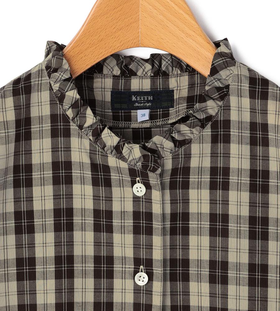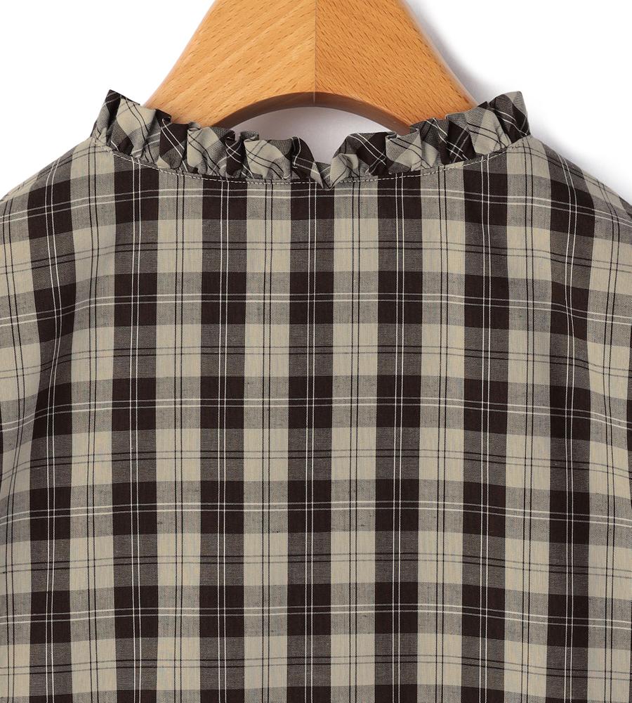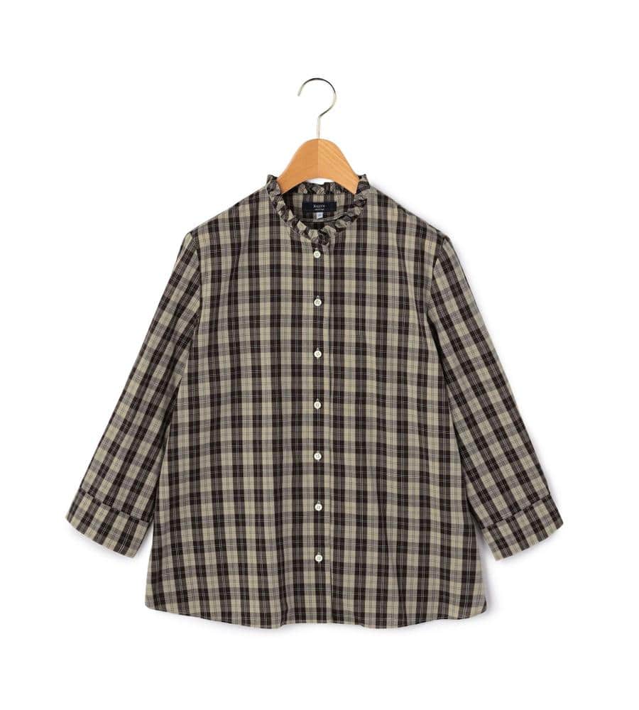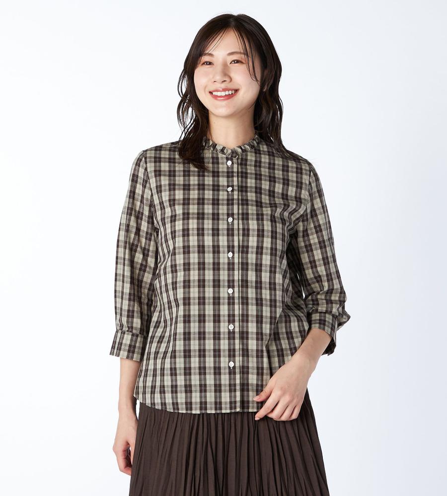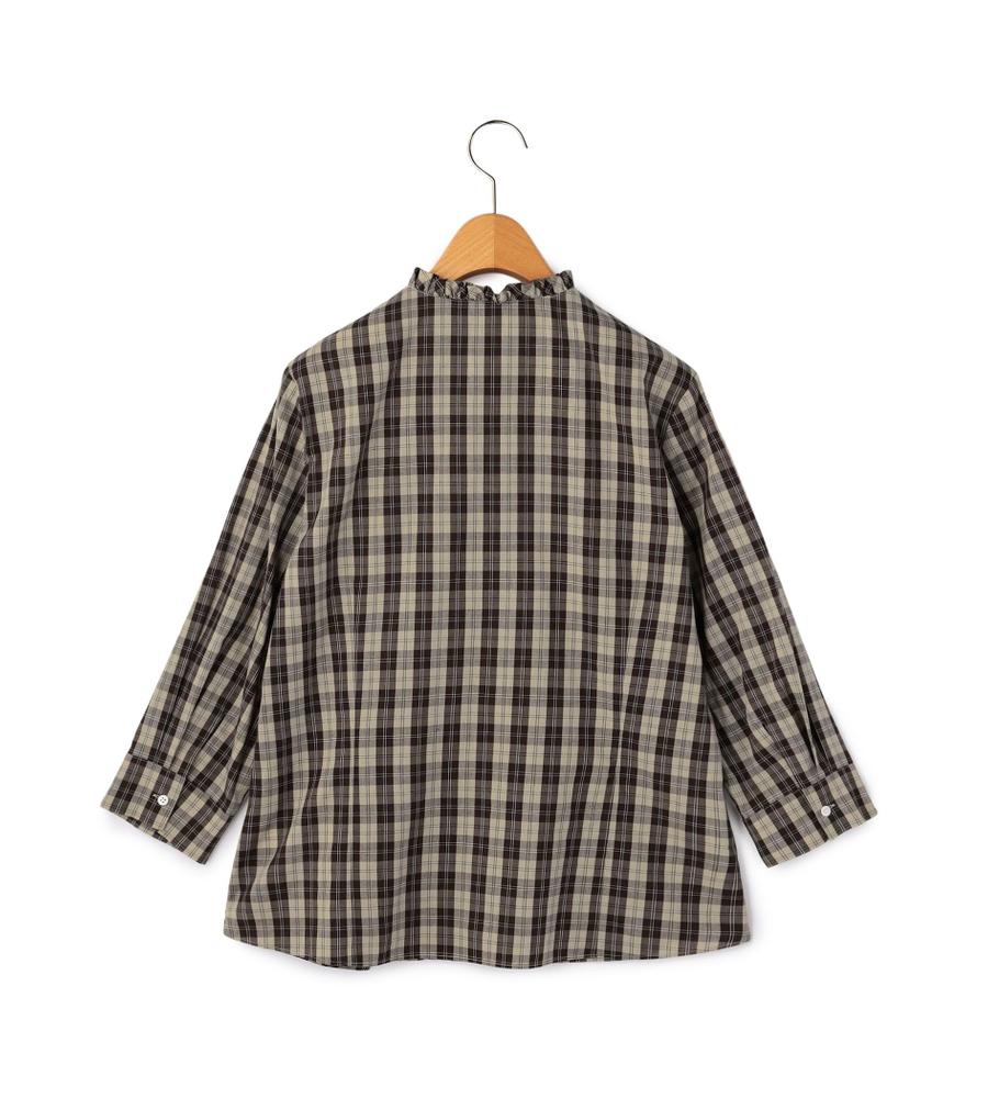 ブロードチェック柄がさりげなく華やかな7分袖ブラウス。フリルのスタンドカラーが愛らしいデザインポイント。コットンとキュプラを混合したエレガントな風合いとひんやりとした肌触りが魅力。ストレートカット裾でパンツ・スカートを選ばず様々なボトムとマッチし、お出かけからデイリーまで幅広く活躍します。
