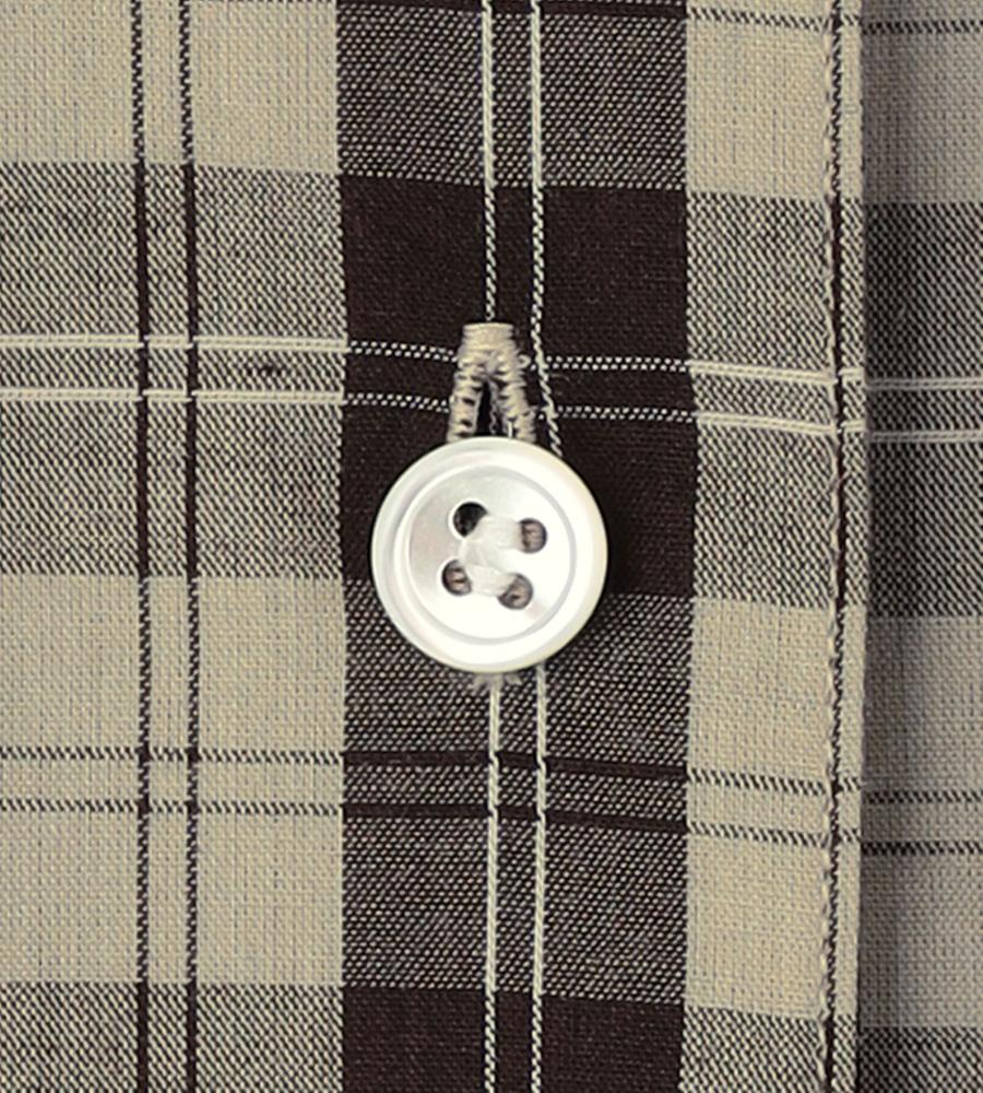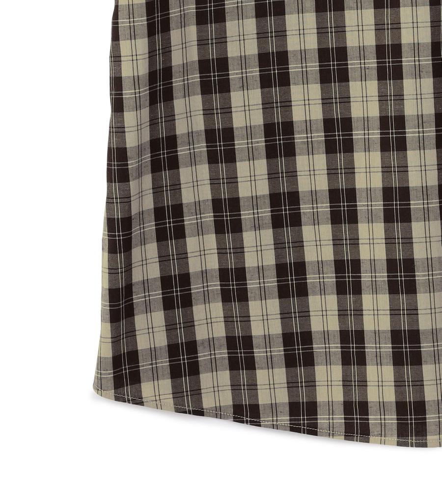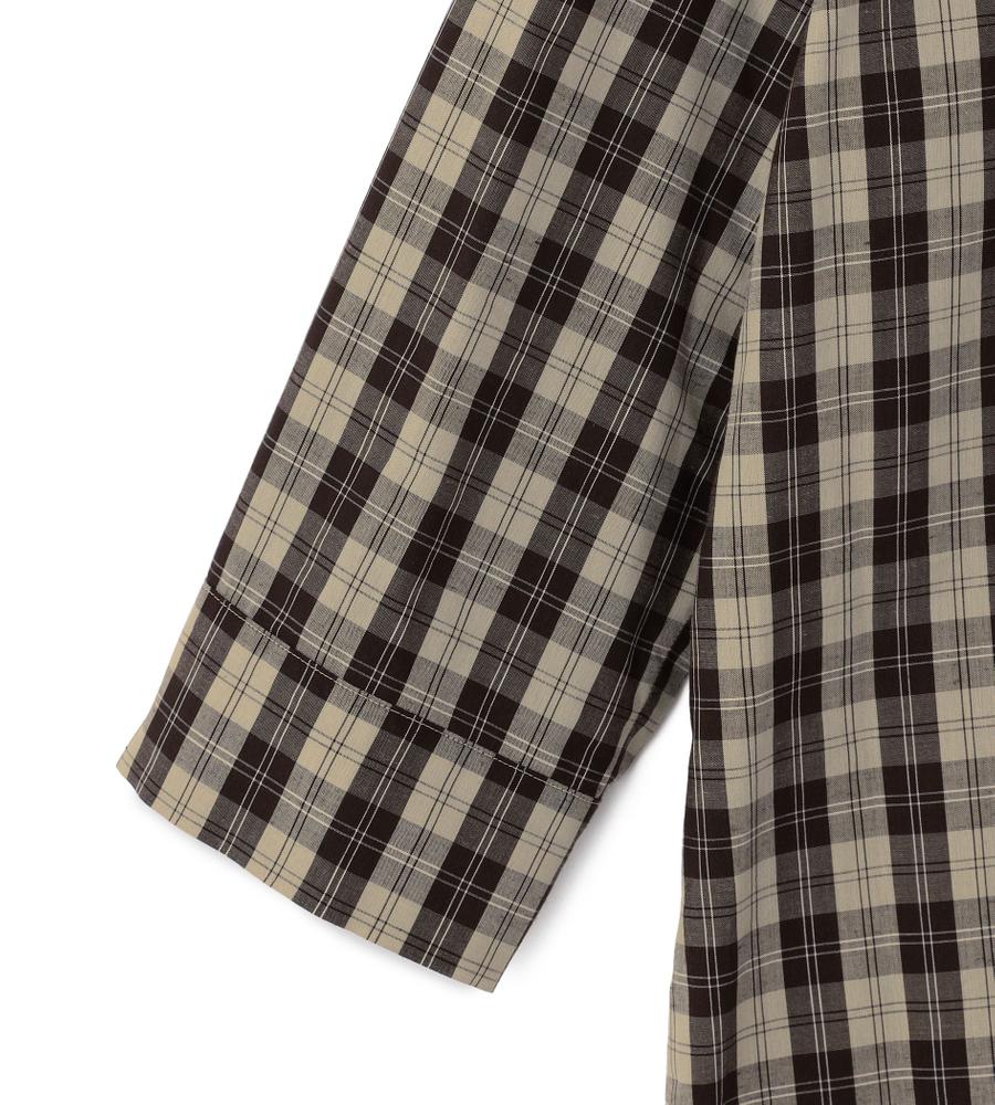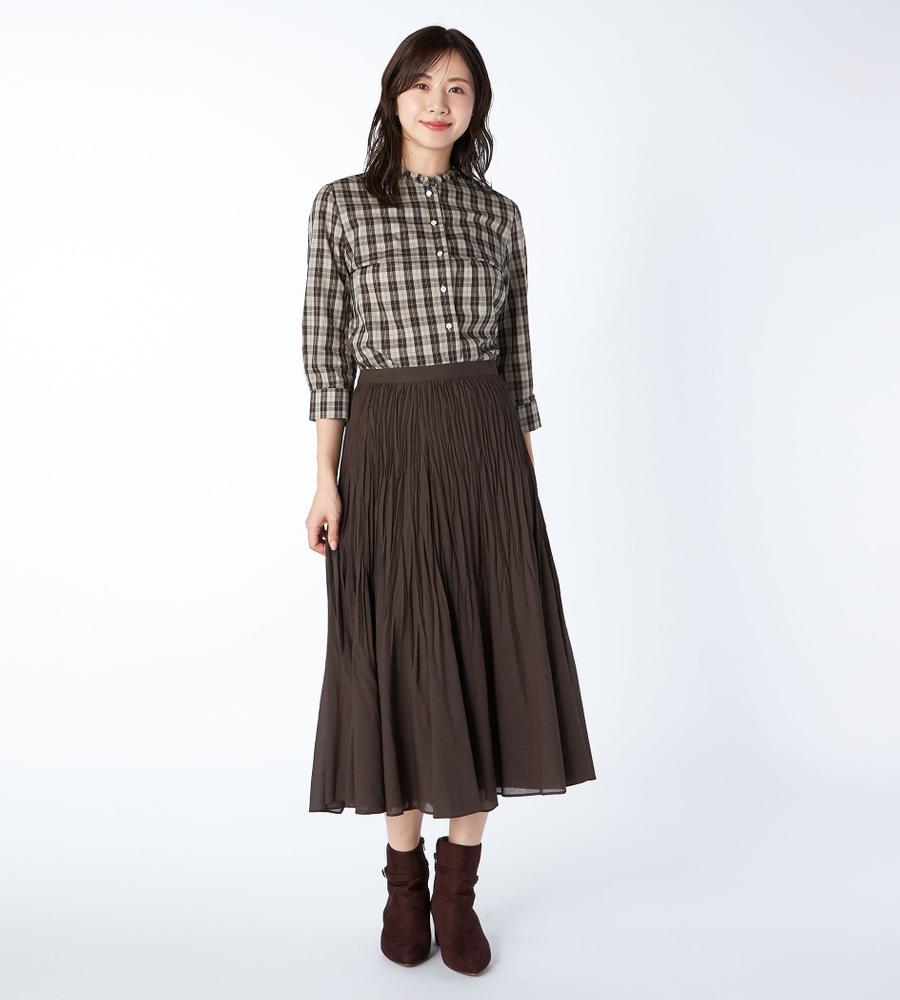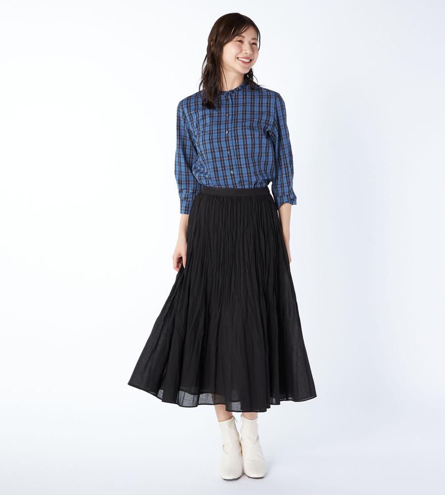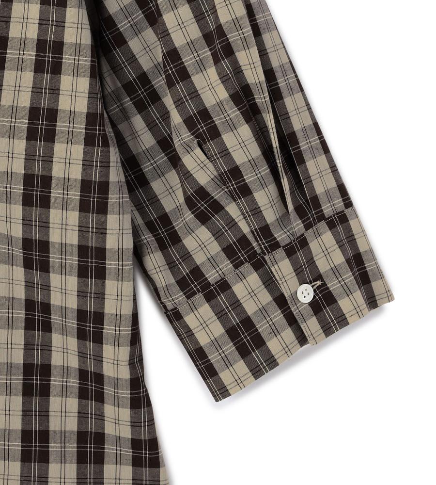 ブロードチェック柄がさりげなく華やかな7分袖ブラウス。フリルのスタンドカラーが愛らしいデザインポイント。コットンとキュプラを混合したエレガントな風合いとひんやりとした肌触りが魅力。ストレートカット裾でパンツ・スカートを選ばず様々なボトムとマッチし、お出かけからデイリーまで幅広く活躍します。