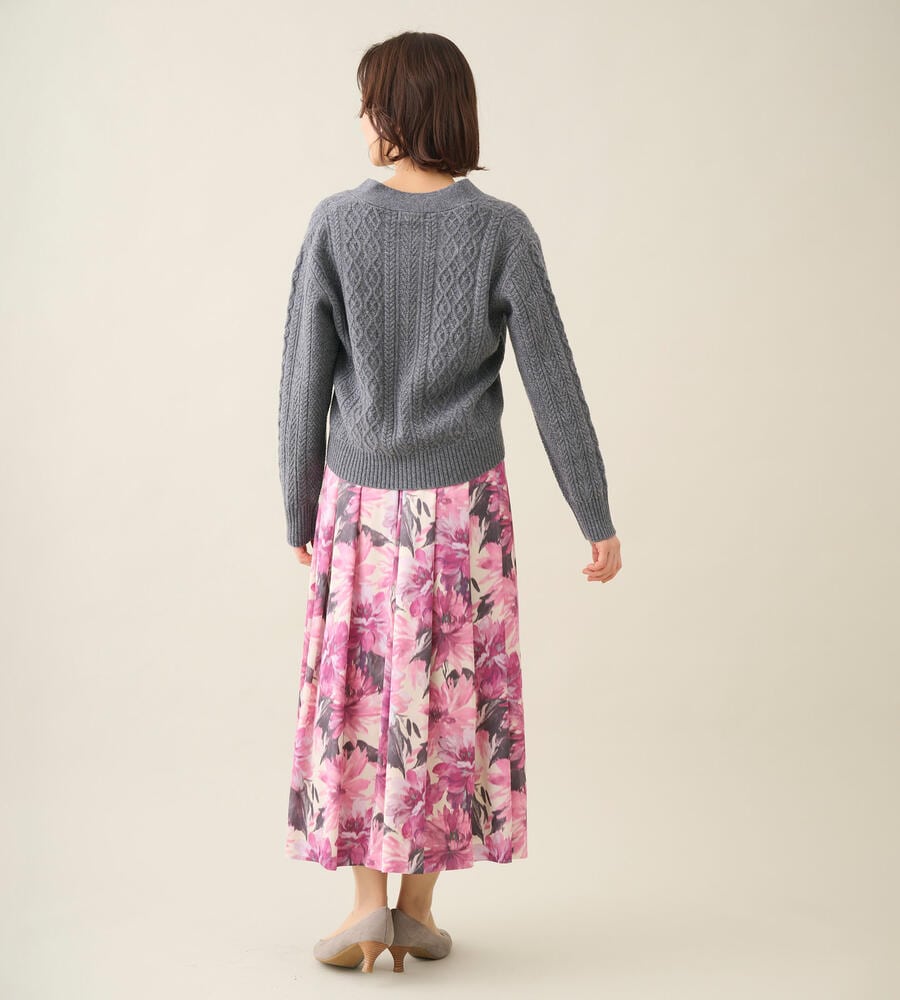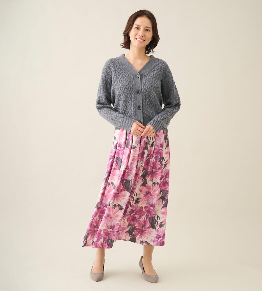 ノスタルジックな雰囲気を纏った、ケーブル編みのニットカーディガン。身頃は真っ直ぐ落ちるストレートシルエットで、Vネックがすっきり感をプラスします。ボタンはやや大きめにして、ベーシックスタイルのアクセントに。ほどよいボリュームで、肌寒くなったときの羽織りに重宝します。プリーツスカートやジーンズなど、幅広いボトムに合わせられるアイテムです。