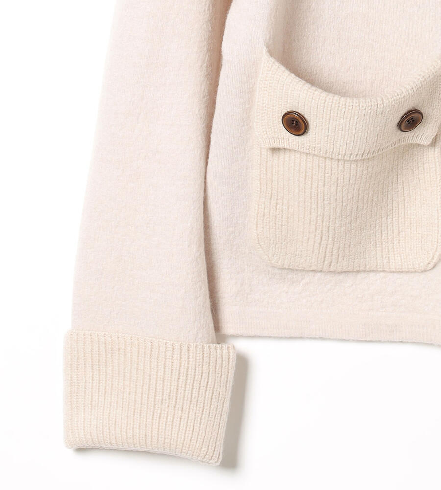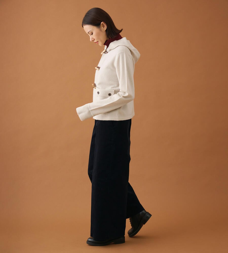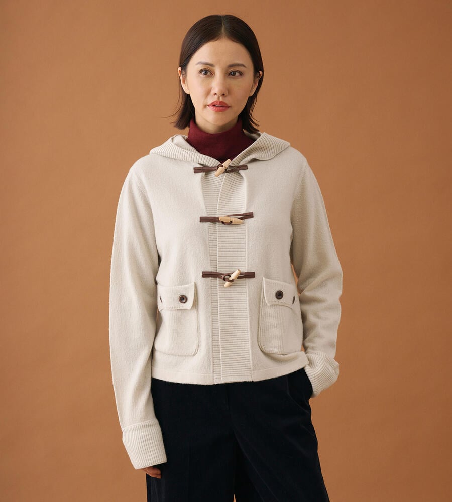 ライトなアウターとしてさらりと羽織れる、フード付きニットジャケットです。毛100%であたたかく、ダッフルコートライクなルックスがポイント。トグルに通す紐はレザーを採用しています。左右に配置した折り返しデザインポケットにはボタンを飾りアクセントに。