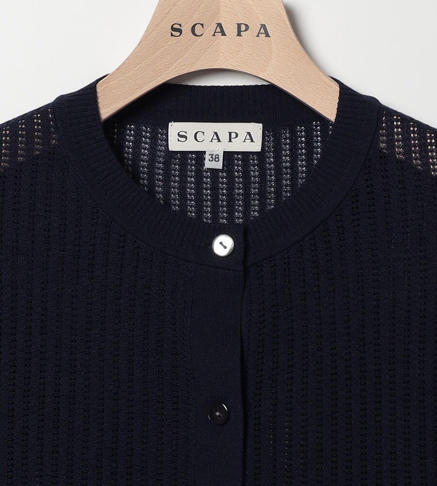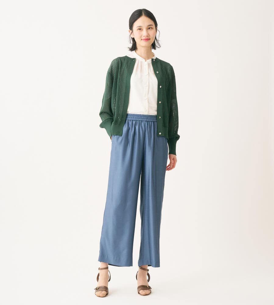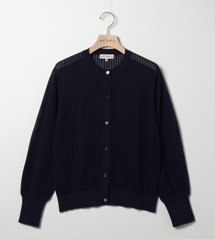 シアーな透かし編みのニットカーディガン。透け過ぎない上品なデザインで、大人のトレンドスタイルにおすすめの一着です。シルエットは適度なゆとりがあり、袖口や裾部分はすっきりとしたリブ仕様。トップス感覚でも羽織りとしても活躍し、同シリーズのニットとアンサンブルでも着用可能です。