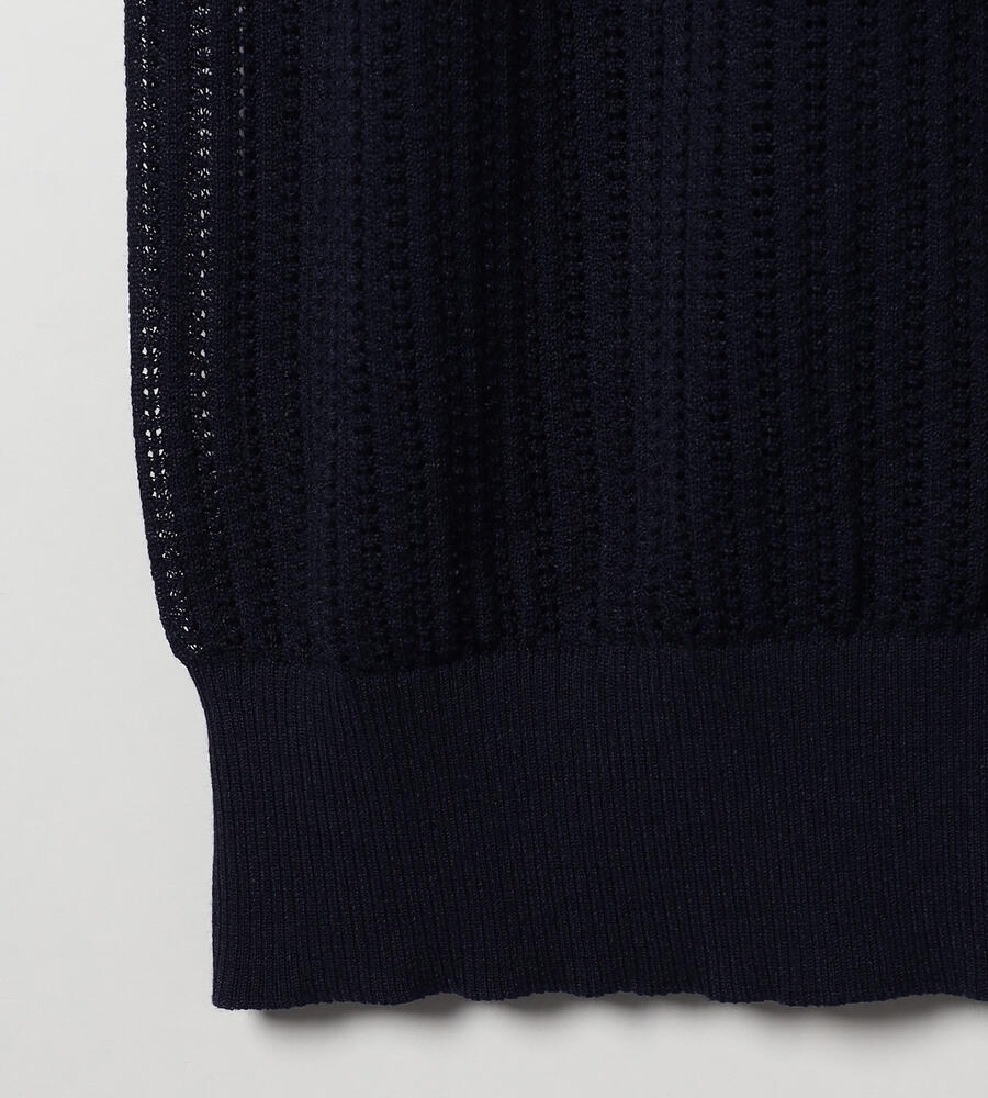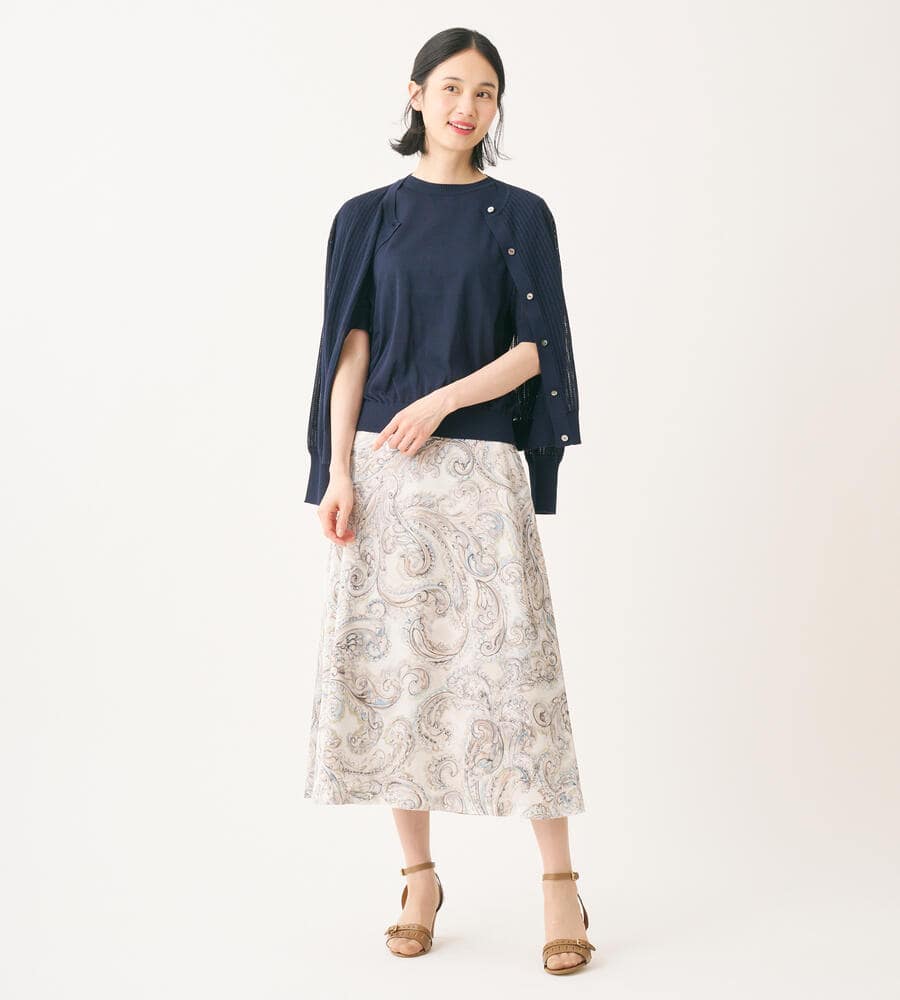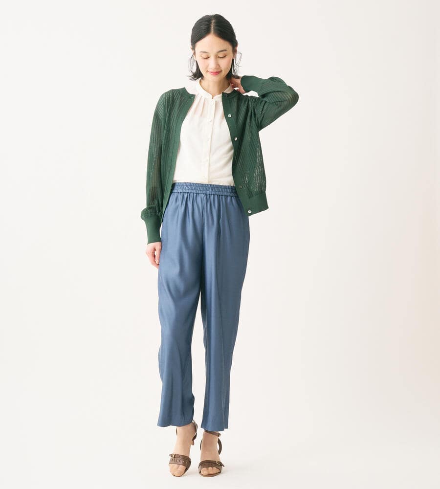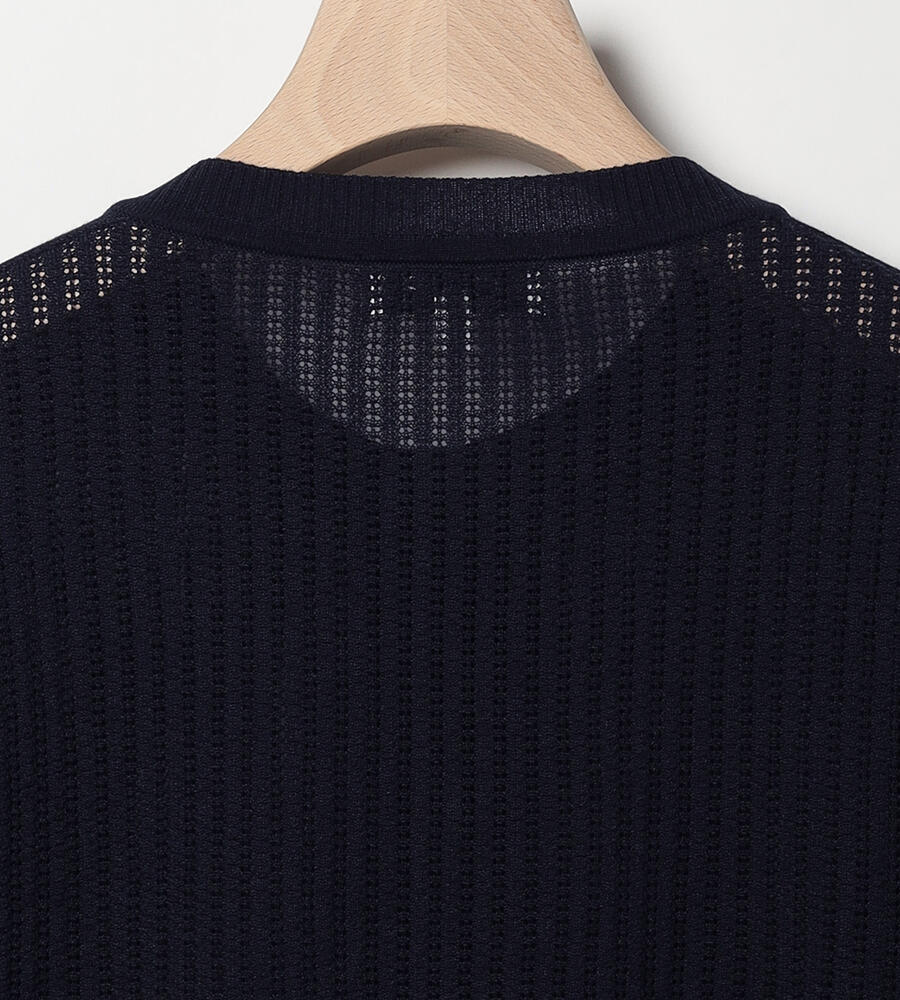 シアーな透かし編みのニットカーディガン。透け過ぎない上品なデザインで、大人のトレンドスタイルにおすすめの一着です。シルエットは適度なゆとりがあり、袖口や裾部分はすっきりとしたリブ仕様。トップス感覚でも羽織りとしても活躍し、同シリーズのニットとアンサンブルでも着用可能です。