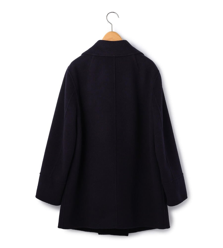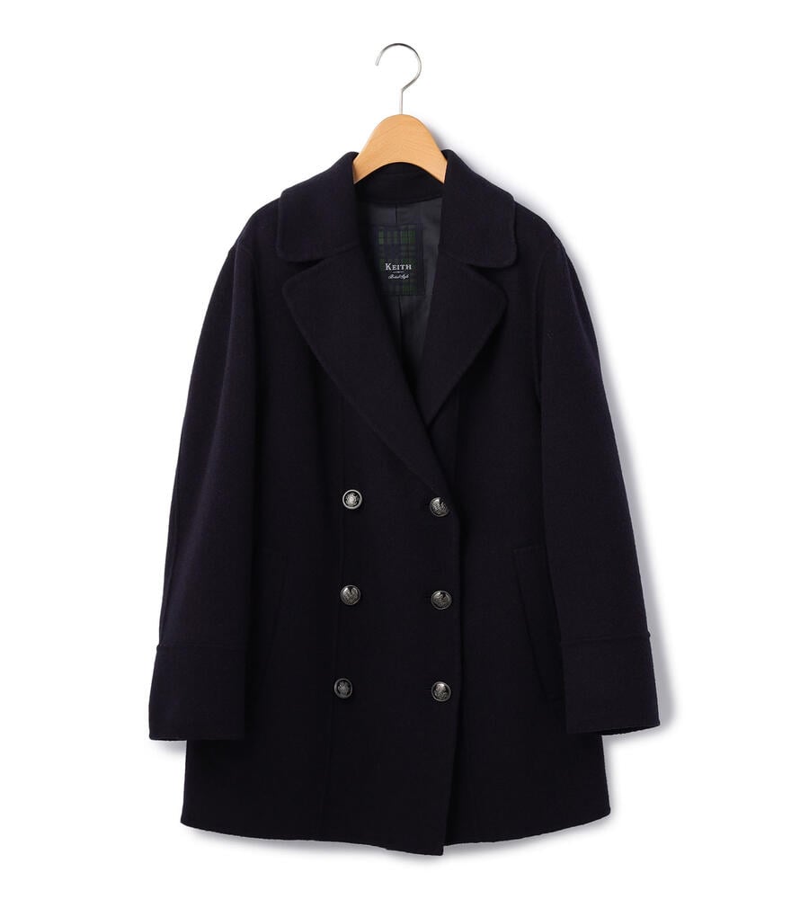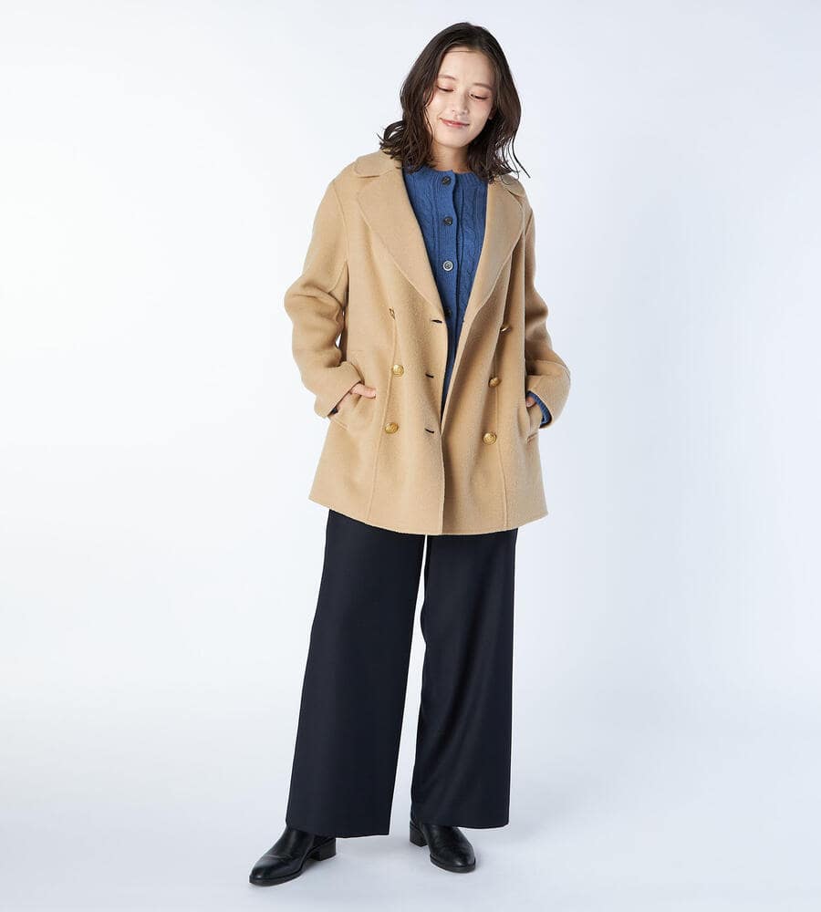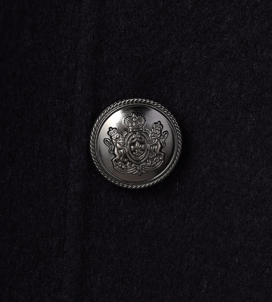 ダブルブレストのフロントがクラシカルな印象のコート。大きめの衿で顔回りが華やぐのもポイントです。ボタンには紋章風のモチーフをデザインして、細部にまでこだわって仕上げています。さまざまなボトムスと合わせられる、程よい丈感。キレイ目コーディネートにもデイリーカジュアルにも活躍するアイテムです。