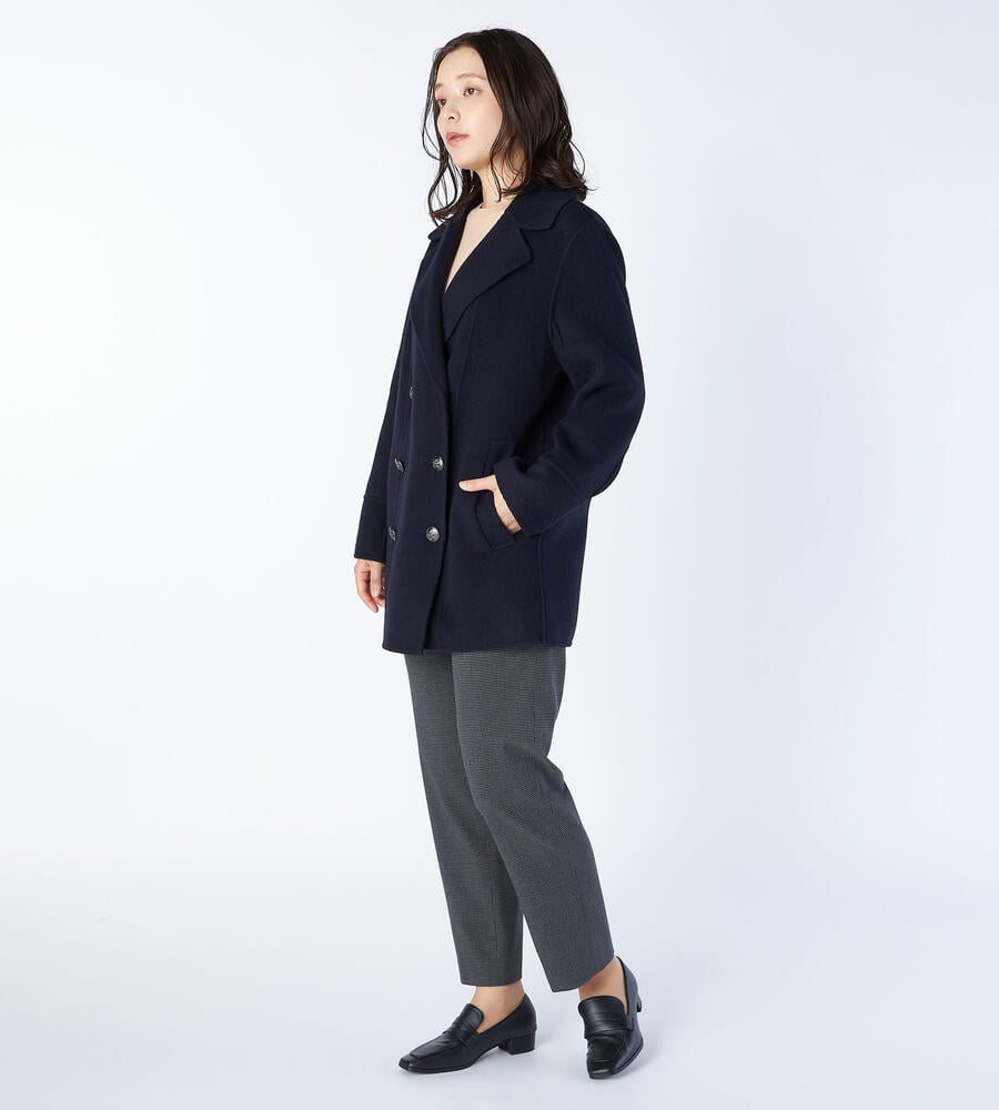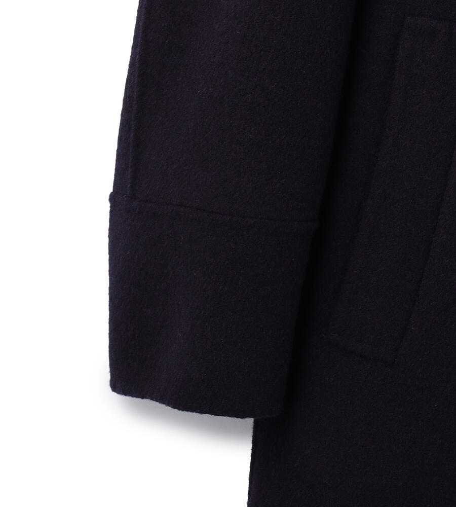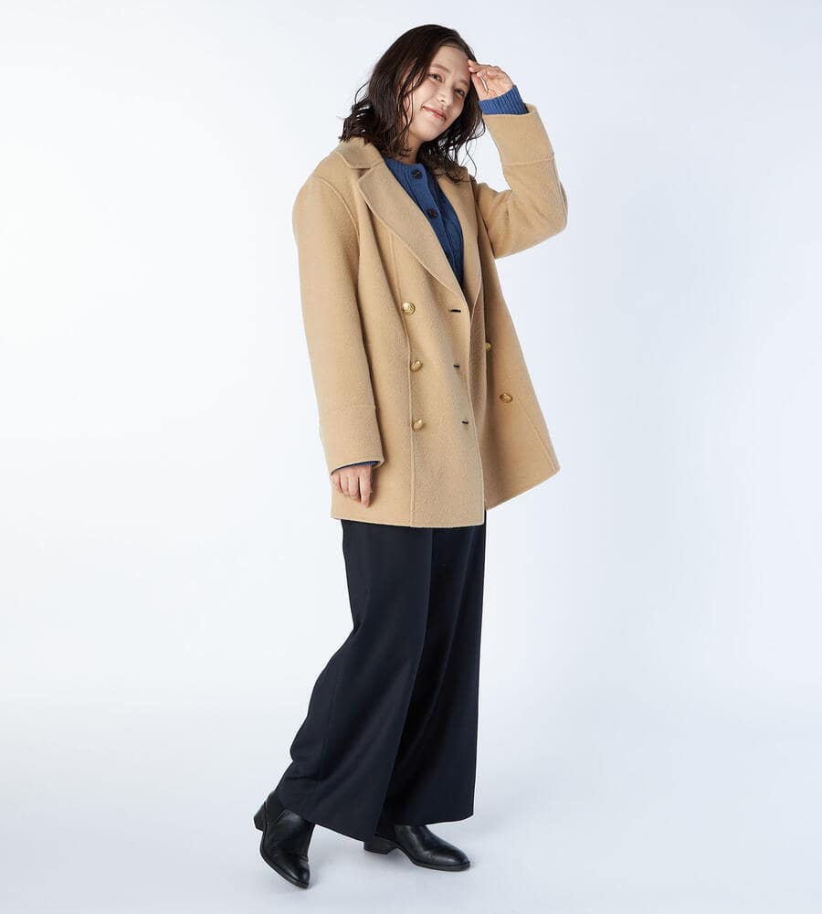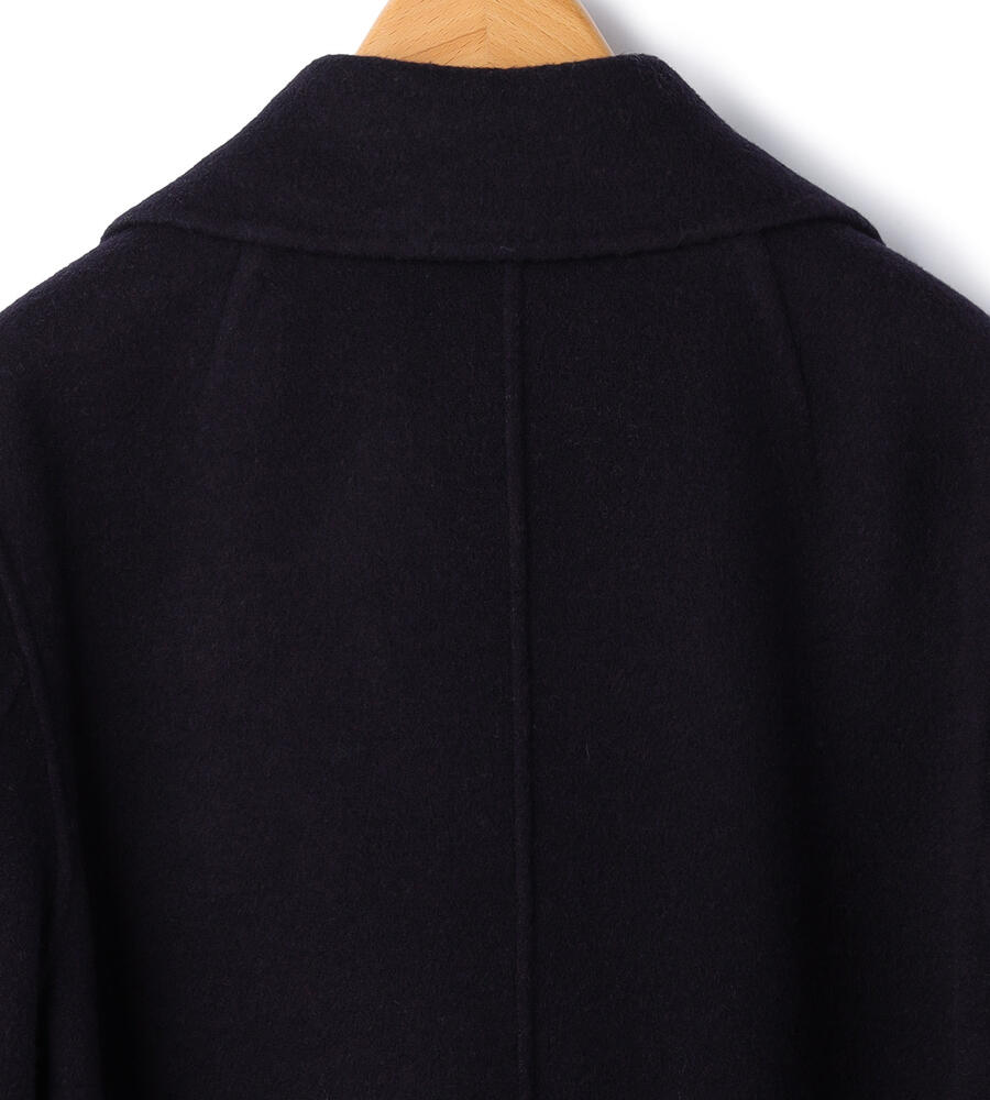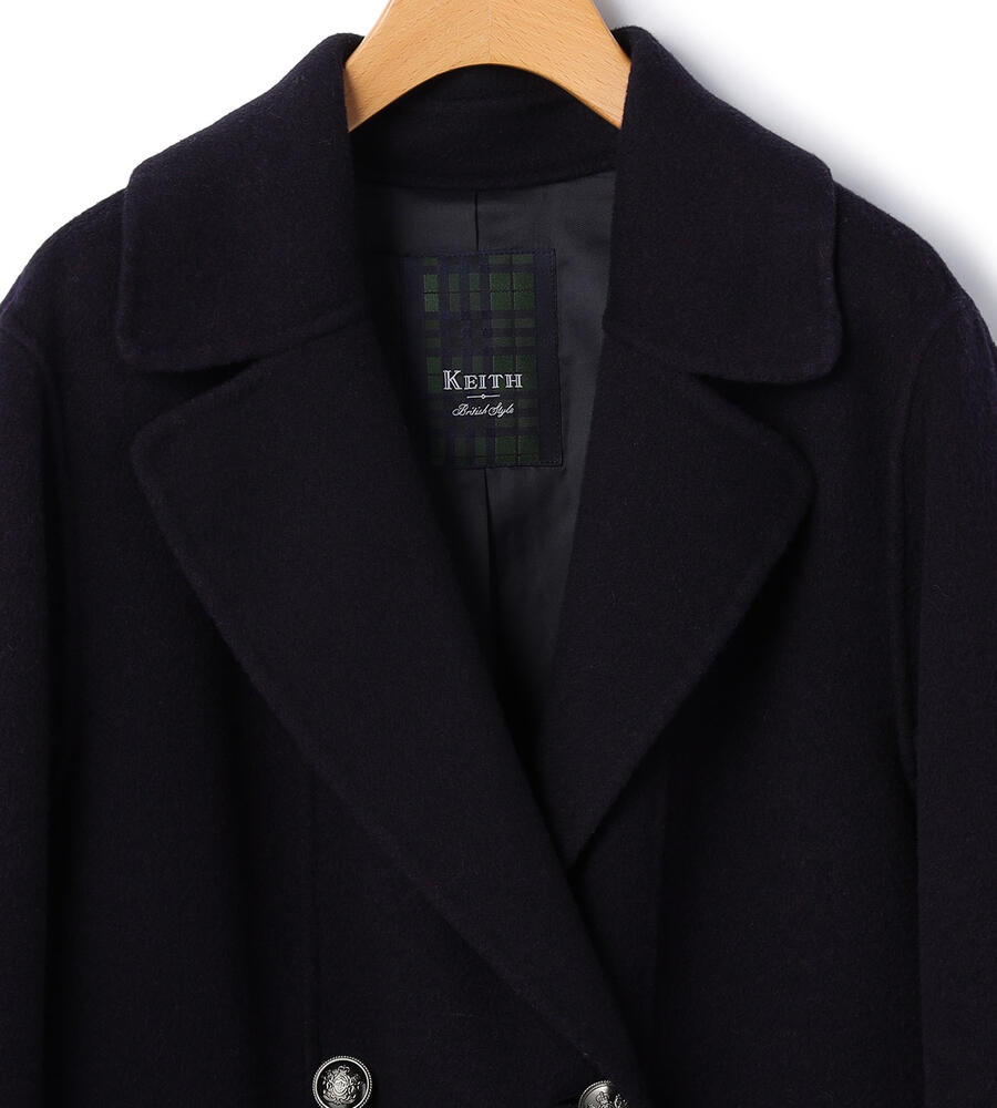 ダブルブレストのフロントがクラシカルな印象のコート。大きめの衿で顔回りが華やぐのもポイントです。ボタンには紋章風のモチーフをデザインして、細部にまでこだわって仕上げています。さまざまなボトムスと合わせられる、程よい丈感。キレイ目コーディネートにもデイリーカジュアルにも活躍するアイテムです。