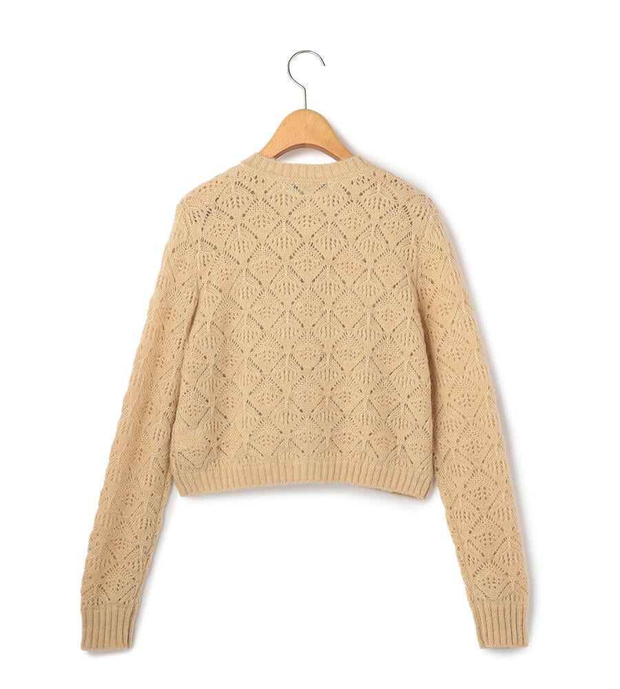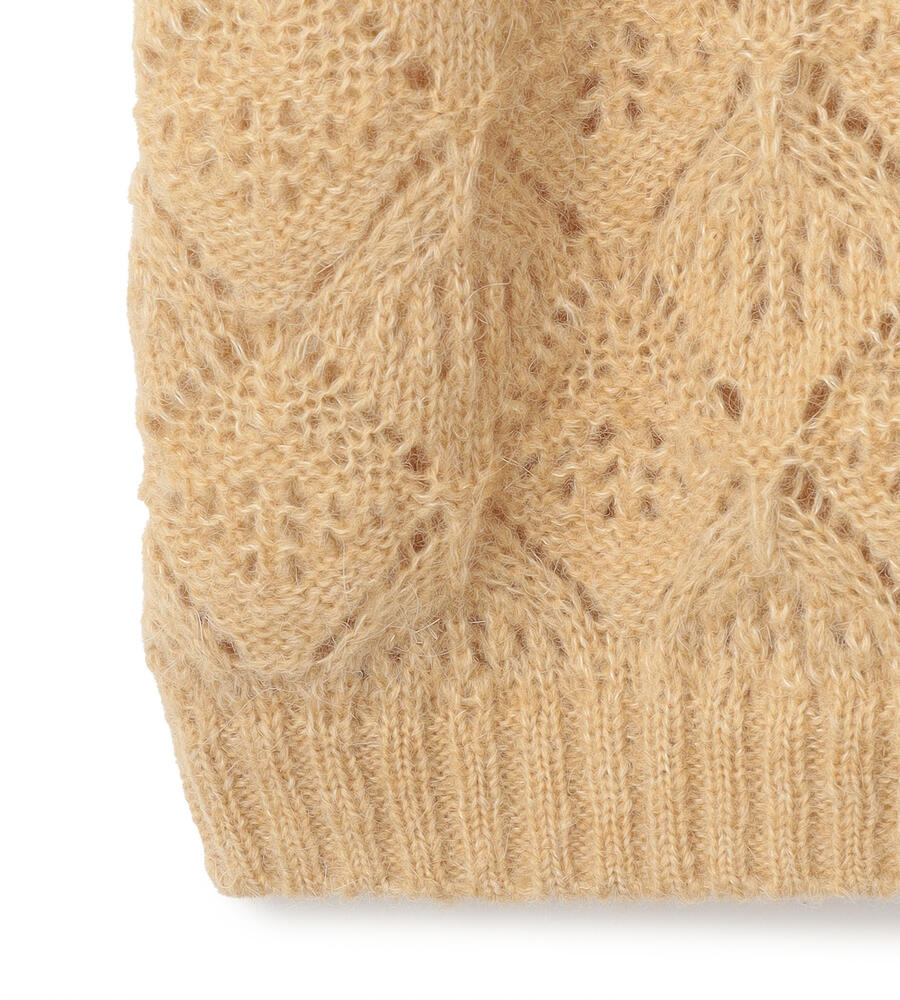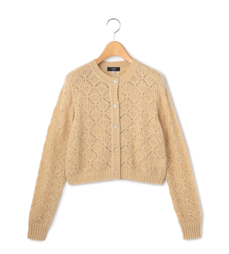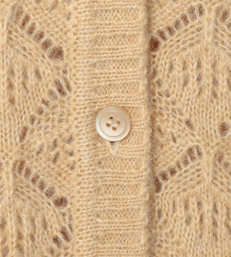 ナイロンをベースにアルパカやウールなどを織り交ぜ、温もりたっぷりに仕上げたカーディガン。レースのような繊細でロマンティックな柄使いで、着こなしをフェミニンに彩ります。着丈が短く、量感のあるボトムスなどとも合わせやすいのが特徴。秋冬らしいクラシカルな愛らしさで着こなしの鮮度を高めるアイテムです。