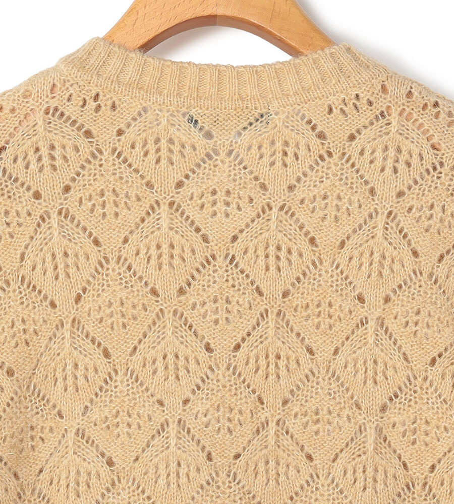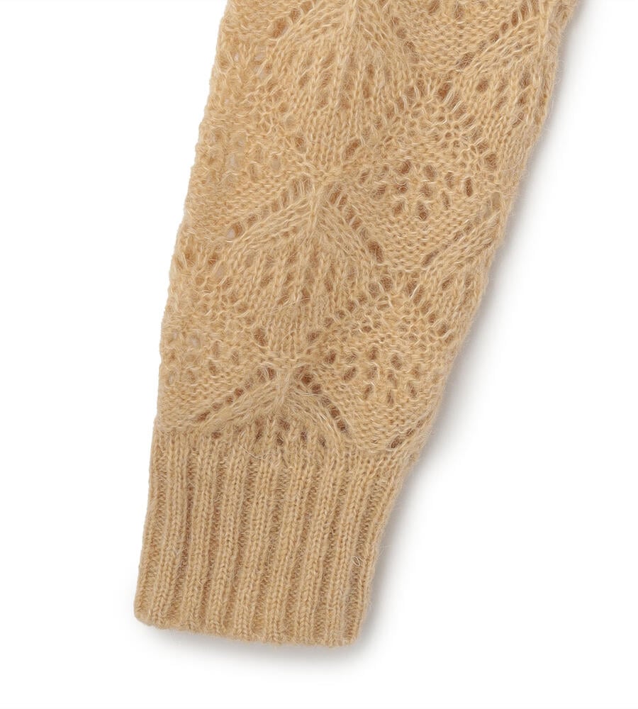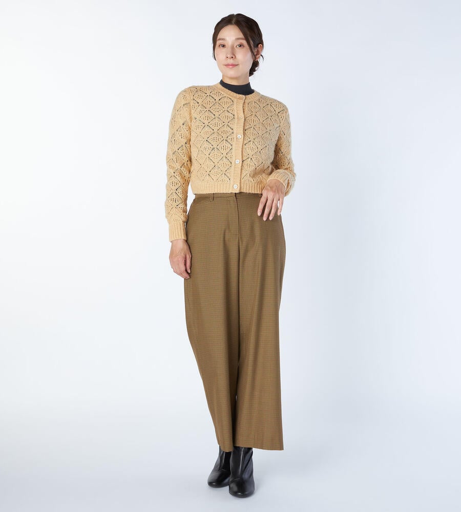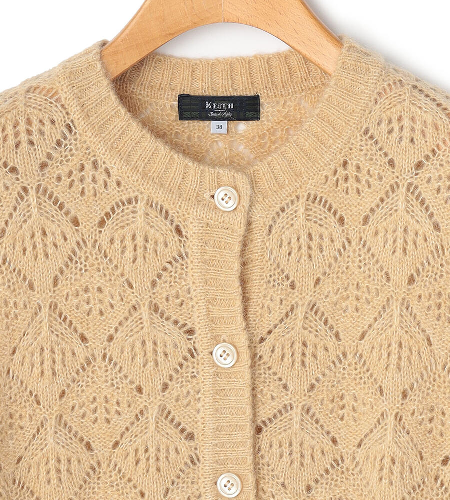 ナイロンをベースにアルパカやウールなどを織り交ぜ、温もりたっぷりに仕上げたカーディガン。レースのような繊細でロマンティックな柄使いで、着こなしをフェミニンに彩ります。着丈が短く、量感のあるボトムスなどとも合わせやすいのが特徴。秋冬らしいクラシカルな愛らしさで着こなしの鮮度を高めるアイテムです。
