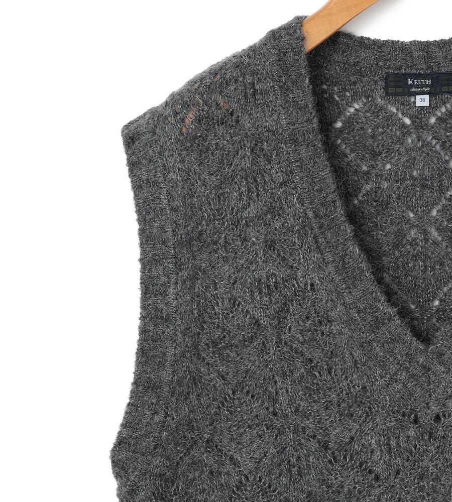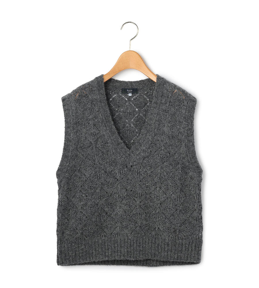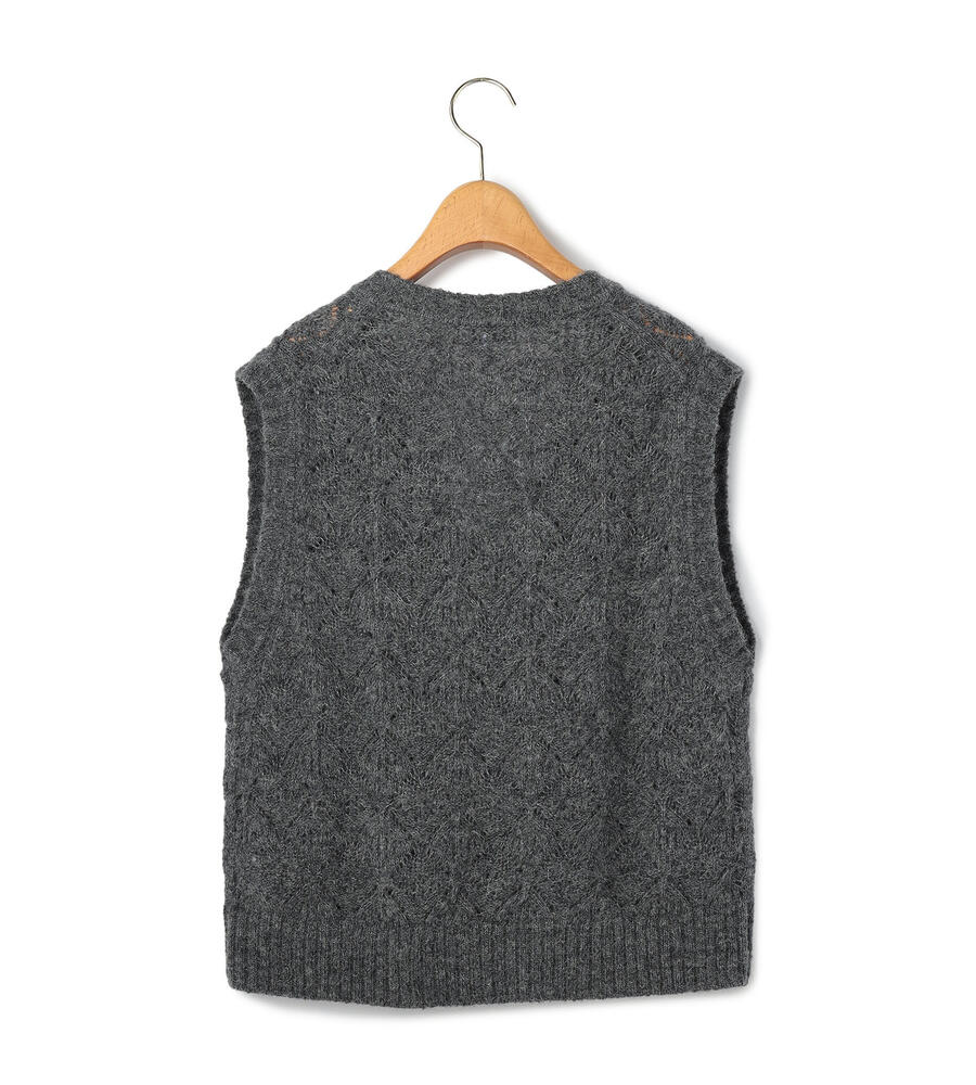 ナイロンをベースにアルパカやウールなどを織り交ぜ、温もりたっぷりに仕上げたニットベスト。レースのような繊細でロマンティックな柄使いで、着こなしをフェミニンに彩ります。インに合わせるトップスが映える、コンパクトなサイジング。シンプルなスタイリングに合わせるだけで、季節感たっぷりの愛らしいコーデが完成します。