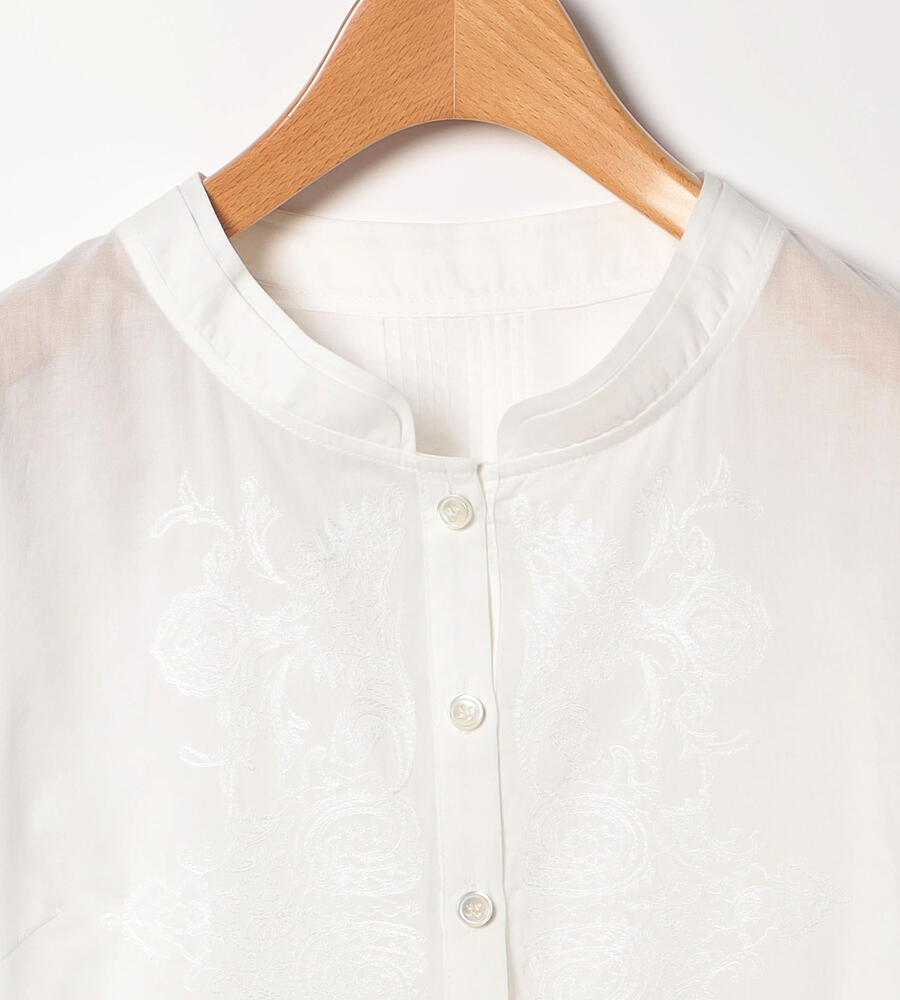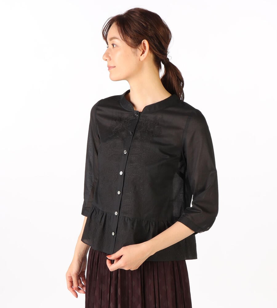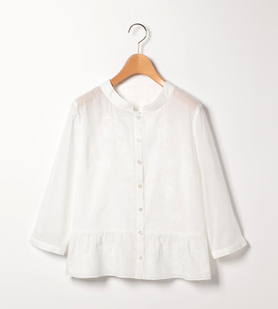 マオカラーを想わせるような二重襟や、フロントと裾の繊細な刺繍デザインにこだわりを感じる7分袖ブラウス。全体的にゆとりをもたせた自然なペプラムシルエットで、幅広い体型にフィットします。軽やかなコットン素材でオールシーズン活躍のアイテムです。フロントを開いて、カーディガンのように取り入れるのもおすすめ。